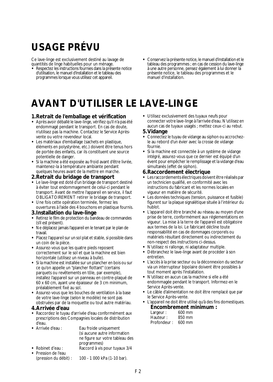 - Assurez-vous que les bouches de ventilation à la base de votre lave-linge (selon le modèle) ne sont pas obstruées par de la moquette ou tout autre matériau. Encombrement minimum : 4.Arrivée d'eau Largeur : Hauteur : Profondeur :