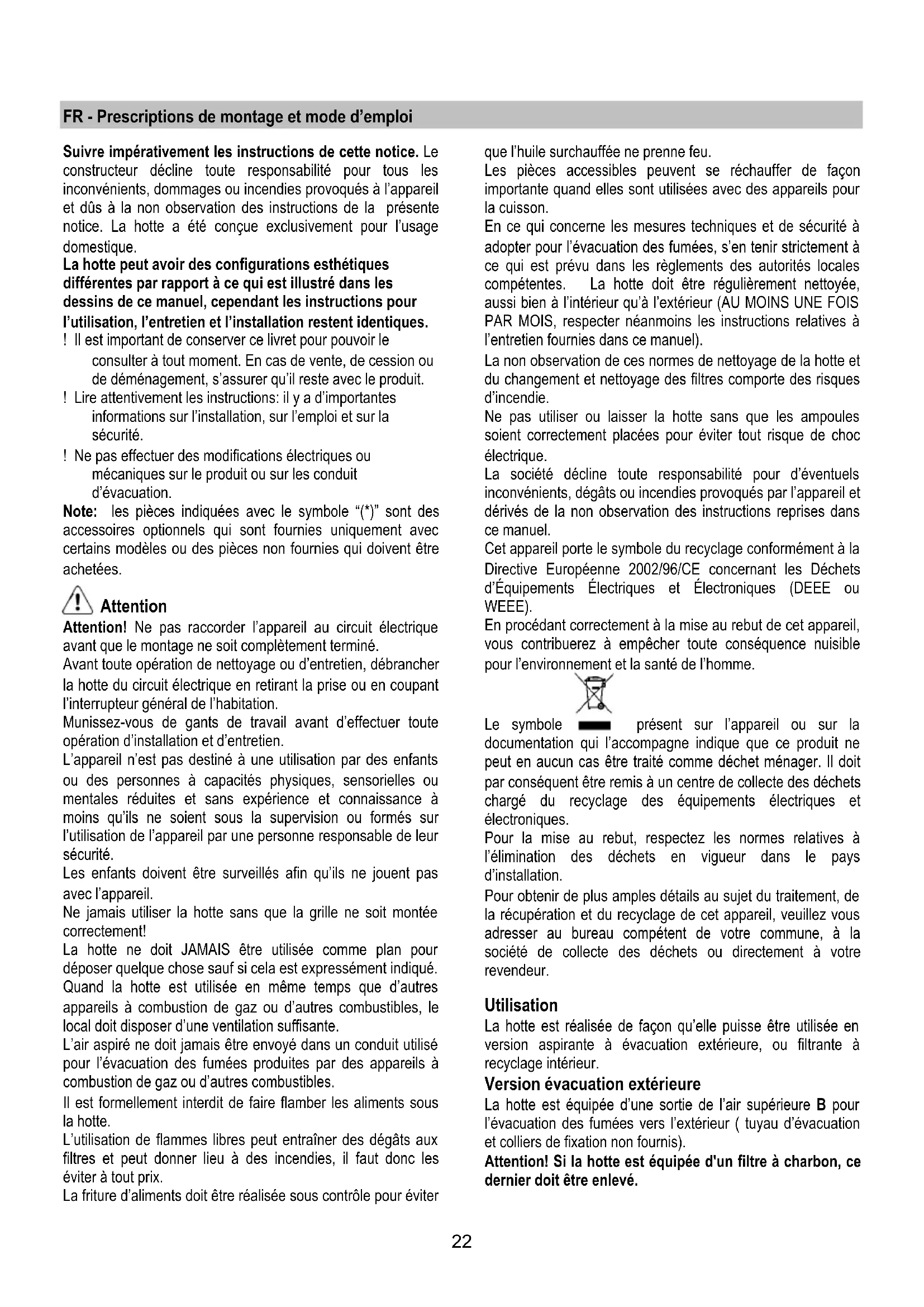 If the lights do not work, make sure that the lamps are fitted properly into their housings before you call for technical assistance.22 FR - Prescriptions de montage et mode d’emploi Suivre impérativement les instructions de cette notice. Le constructeur décline toute responsabilité pour tous les inconvénients, dommages ou incendies provoqués à l’appareil et dûs à la non observation des instructions de la présente notice. La hotte a été conçue exclusivement pour l’usage domestique. La hotte peut avoir des configurations esthétiques différentes par rapport à ce qui est illustré dans les dessins de ce manuel, cependant les instructions pour l’utilisation, l’entretien et l’installation restent identiques. ! Il est important de conserver ce livret pour pouvoir le consulter à tout moment. En cas de vente, de cession ou de déménagement, s’assurer qu’il reste avec le produit. ! Lire attentivement les instructions: il y a d’importantes informations sur l’installation, sur l’emploi et sur la sécurité. ! Ne pas effectuer des modifications électriques ou mécaniques sur le produit ou sur les conduit d’évacuation. Note: les pièces indiquées avec le symbole “(*)” sont des accessoires optionnels qui sont fournies uniquement avec certains modèles ou des pièces non fournies qui doivent être achetées. Attention Attention! Ne pas raccorder l’appareil au circuit électrique avant que le montage ne soit complètement terminé. Avant toute opération de nettoyage ou d’entretien, débrancher la hotte du circuit électrique en retirant la prise ou en coupant l’interrupteur général de l’habitation. Munissez-vous de gants de travail avant d’effectuer toute opération d’installation et d’entretien. L’appareil n’est pas destiné à une utilisation par des enfants ou des personnes à capacités physiques, sensorielles ou mentales réduites et sans expérience et connaissance à moins qu’ils ne soient sous la supervision ou formés sur l’utilisation de l’appareil par une personne responsable de leur sécurité. Les enfants doivent être surveillés afin qu’ils ne jouent pas avec l’appareil. Ne jamais utiliser la hotte sans que la grille ne soit montée correctement! La hotte ne doit JAMAIS être utilisée comme plan pour déposer quelque chose sauf si cela est expressément indiqué. Quand la hotte est utilisée en même temps que d’autres appareils à combustion de gaz ou d’autres combustibles, le local doit disposer d’une ventilation suffisante. L’air aspiré ne doit jamais être envoyé dans un conduit utilisé pour l’évacuation des fumées produites par des appareils à combustion de gaz ou d’autres combustibles. Il est formellement interdit de faire flamber les aliments sous la hotte. L’utilisation de flammes libres peut entraîner des dégâts aux filtres et peut donner lieu à des incendies, il faut donc les éviter à tout prix. La friture d’aliments doit être réalisée sous contrôle pour éviter que l’huile surchauffée ne prenne feu. Les pièces accessibles peuvent se réchauffer de façon importante quand elles sont utilisées avec des appareils pour la cuisson. En ce qui concerne les mesures techniques et de sécurité à adopter pour l’évacuation des fumées, s’en tenir strictement à ce qui est prévu dans les règlements des autorités locales compétentes. La hotte doit être régulièrement nettoyée, aussi bien à l’intérieur qu’à l’extérieur (AU MOINS UNE FOIS PAR MOIS, respecter néanmoins les instructions relatives à l’entretien fournies dans ce manuel). La non observation de ces normes de nettoyage de la hotte et du changement et nettoyage des filtres comporte des risques d’incendie. Ne pas utiliser ou laisser la hotte sans que les ampoules soient correctement placées pour éviter tout risque de choc électrique. La société décline toute responsabilité pour d’éventuels inconvénients, dégâts ou incendies provoqués par l’appareil et dérivés de la non observation des instructions reprises dans ce manuel. Cet appareil porte le symbole du recyclage conformément à la Directive Européenne 2002/96/CE concernant les Déchets d’Équipements Électriques et Électroniques (DEEE ou WEEE). En procédant correctement à la mise au rebut de cet appareil, vous contribuerez à empêcher toute conséquence nuisible pour l’environnement et la santé de l’homme. Le symbole présent sur l’appareil ou sur la documentation qui l’accompagne indique que ce produit ne peut en aucun cas être traité comme déchet ménager. Il doit par conséquent être remis à un centre de collecte des déchets chargé du recyclage des équipements électriques et électroniques. Pour la mise au rebut, respectez les normes relatives à l’élimination des déchets en vigueur dans le pays d’installation. Pour obtenir de plus amples détails au sujet du traitement, de la récupération et du recyclage de cet appareil, veuillez vous adresser au bureau compétent de votre commune, à la société de collecte des déchets ou directement à votre revendeur. Utilisation La hotte est réalisée de façon qu’elle puisse être utilisée en version aspirante à évacuation extérieure, ou filtrante à recyclage intérieur. Version évacuation extérieure La hotte est équipée d’une sortie de l’air supérieure B pour l’évacuation des fumées vers l’extérieur ( tuyau d’évacuation et colliers de fixation non fournis). Attention! Si la hotte est équipée d'un filtre à charbon, ce dernier doit être enlevé.23 Version recyclage Dans l’éventualité où il ne serait pas possible d’évacuer les fumées et les vapeurs de cuisson vers l’extérieur, il est possible d’utiliser la hotte dans la version recylcage, en effectuant le montage d’un filtre à charbon actif et d’un déflecteur F sur le support (bride) G. Les fumées et les vapeurs sont recyclées à travers le gr