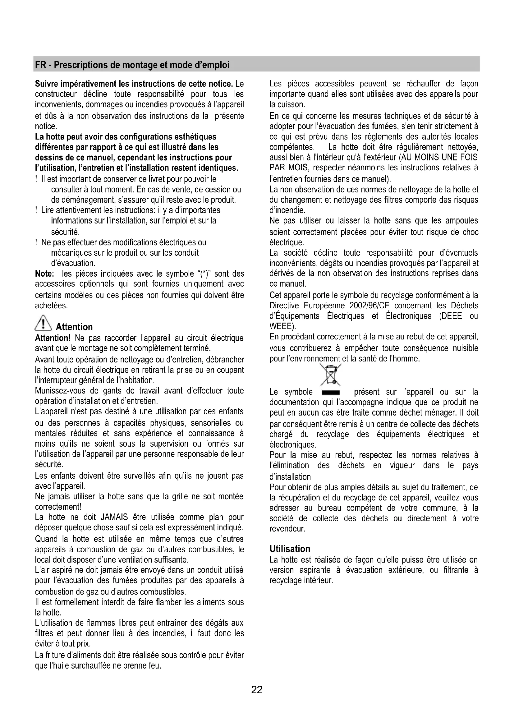 If the lights do not work, make sure that the lamps are fitted properly into their housings before you call for technical assistance.22 FR - Prescriptions de montage et mode d’emploi Suivre impérativement les instructions de cette notice. Le constructeur décline toute responsabilité pour tous les inconvénients, dommages ou incendies provoqués à l’appareil et dûs à la non observation des instructions de la présente notice. La hotte peut avoir des configurations esthétiques différentes par rapport à ce qui est illustré dans les dessins de ce manuel, cependant les instructions pour l’utilisation, l’entretien et l’installation restent identiques. ! Il est important de conserver ce livret pour pouvoir le consulter à tout moment. En cas de vente, de cession ou de déménagement, s’assurer qu’il reste avec le produit. ! Lire attentivement les instructions: il y a d’importantes informations sur l’installation, sur l’emploi et sur la sécurité. ! Ne pas effectuer des modifications électriques ou mécaniques sur le produit ou sur les conduit d’évacuation. Note: les pièces indiquées avec le symbole “(*)” sont des accessoires optionnels qui sont fournies uniquement avec certains modèles ou des pièces non fournies qui doivent être achetées. Attention Attention! Ne pas raccorder l’appareil au circuit électrique avant que le montage ne soit complètement terminé. Avant toute opération de nettoyage ou d’entretien, débrancher la hotte du circuit électrique en retirant la prise ou en coupant l’interrupteur général de l’habitation. Munissez-vous de gants de travail avant d’effectuer toute opération d’installation et d’entretien. L’appareil n’est pas destiné à une utilisation par des enfants ou des personnes à capacités physiques, sensorielles ou mentales réduites et sans expérience et connaissance à moins qu’ils ne soient sous la supervision ou formés sur l’utilisation de l’appareil par une personne responsable de leur sécurité. Les enfants doivent être surveillés afin qu’ils ne jouent pas avec l’appareil. Ne jamais utiliser la hotte sans que la grille ne soit montée correctement! La hotte ne doit JAMAIS être utilisée comme plan pour déposer quelque chose sauf si cela est expressément indiqué. Quand la hotte est utilisée en même temps que d’autres appareils à combustion de gaz ou d’autres combustibles, le local doit disposer d’une ventilation suffisante. L’air aspiré ne doit jamais être envoyé dans un conduit utilisé pour l’évacuation des fumées produites par des appareils à combustion de gaz ou d’autres combustibles. Il est formellement interdit de faire flamber les aliments sous la hotte. L’utilisation de flammes libres peut entraîner des dégâts aux filtres et peut donner lieu à des incendies, il faut donc les éviter à tout prix. La friture d’aliments doit être réalisée sous contrôle pour éviter que l’huile surchauffée ne prenne feu. Les pièces accessibles peuvent se réchauffer de façon importante quand elles sont utilisées avec des appareils pour la cuisson. En ce qui concerne les mesures techniques et de sécurité à adopter pour l’évacuation des fumées, s’en tenir strictement à ce qui est prévu dans les règlements des autorités locales compétentes. La hotte doit être régulièrement nettoyée, aussi bien à l’intérieur qu’à l’extérieur (AU MOINS UNE FOIS PAR MOIS, respecter néanmoins les instructions relatives à l’entretien fournies dans ce manuel). La non observation de ces normes de nettoyage de la hotte et du changement et nettoyage des filtres comporte des risques d’incendie. Ne pas utiliser ou laisser la hotte sans que les ampoules soient correctement placées pour éviter tout risque de choc électrique. La société décline toute responsabilité pour d’éventuels inconvénients, dégâts ou incendies provoqués par l’appareil et dérivés de la non observation des instructions reprises dans ce manuel. Cet appareil porte le symbole du recyclage conformément à la Directive Européenne 2002/96/CE concernant les Déchets d’Équipements Électriques et Électroniques (DEEE ou WEEE). En procédant correctement à la mise au rebut de cet appareil, vous contribuerez à empêcher toute conséquence nuisible pour l’environnement et la santé de l’homme. Le symbole présent sur l’appareil ou sur la documentation qui l’accompagne indique que ce produit ne peut en aucun cas être traité comme déchet ménager. Il doit par conséquent être remis à un centre de collecte des déchets chargé du recyclage des équipements électriques et électroniques. Pour la mise au rebut, respectez les normes relatives à l’élimination des déchets en vigueur dans le pays d’installation. Pour obtenir de plus amples détails au sujet du traitement, de la récupération et du recyclage de cet appareil, veuillez vous adresser au bureau compétent de votre commune, à la société de collecte des déchets ou directement à votre revendeur. Utilisation La hotte est réalisée de façon qu’elle puisse être utilisée en version aspirante à évacuation extérieure, ou filtrante à recyclage intérieur.23 Version évacuation extérieure Les vapeurs sont évacuées vers l'extérieur à travers un conduit d'évacuation fixé à la bride de raccord qui se trouve au-dessus de la hotte. Attention! Le tuyau d’évacuation n’est pas fourni et doit être acheté à part. Le diamètre du tuyau d'évacuation doit être égal à celui de la bride de raccord = 150 mm. Sur la partie horizontale, le tuyau doit avoir une légère inclinaison vers le haut (10° env.) de façon à convoyer plus facilement l’air vers l’extérieur. Si la hotte est équipée d'un filtre à charbon, ce dernier doit être enlevé. Relier la hotte aux tubes et trous d’évacuation de la paroi d’un diamètre équivalent à la sortie de l’air (collier de raccord