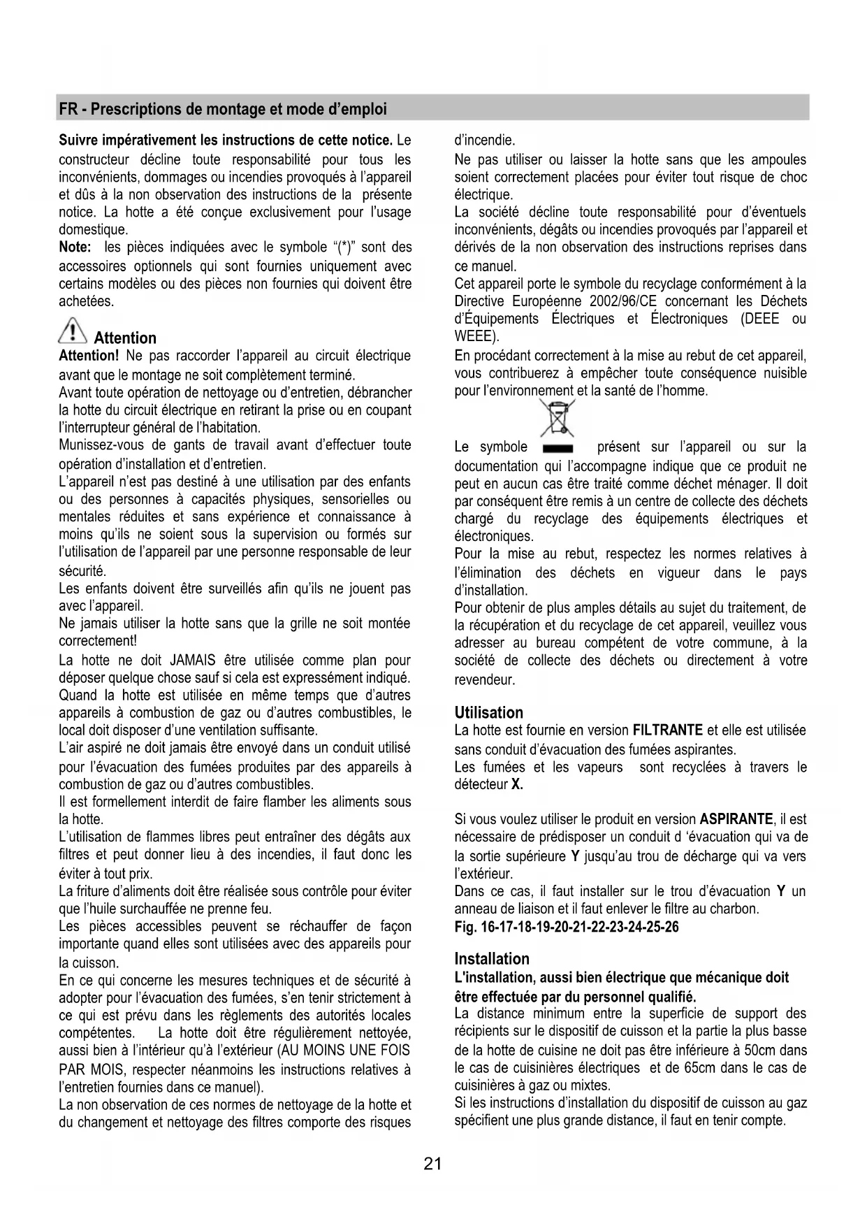 Some models envisage lateral lamps: Replace them with identical forms of 40W (E14) max). Remove cover A to access the lamp housing A. If the lights do not work, make sure that the lamps are fitted properly into their housings before you call for technical assistance.21 FR - Prescriptions de montage et mode d’emploi Suivre impérativement les instructions de cette notice. Le constructeur décline toute responsabilité pour tous les inconvénients, dommages ou incendies provoqués à l’appareil et dûs à la non observation des instructions de la présente notice. La hotte a été conçue exclusivement pour l’usage domestique. Note: les pièces indiquées avec le symbole “(*)” sont des accessoires optionnels qui sont fournies uniquement avec certains modèles ou des pièces non fournies qui doivent être achetées. Attention Attention! Ne pas raccorder l’appareil au circuit électrique avant que le montage ne soit complètement terminé. Avant toute opération de nettoyage ou d’entretien, débrancher la hotte du circuit électrique en retirant la prise ou en coupant l’interrupteur général de l’habitation. Munissez-vous de gants de travail avant d’effectuer toute opération d’installation et d’entretien. L’appareil n’est pas destiné à une utilisation par des enfants ou des personnes à capacités physiques, sensorielles ou mentales réduites et sans expérience et connaissance à moins qu’ils ne soient sous la supervision ou formés sur l’utilisation de l’appareil par une personne responsable de leur sécurité. Les enfants doivent être surveillés afin qu’ils ne jouent pas avec l’appareil. Ne jamais utiliser la hotte sans que la grille ne soit montée correctement! La hotte ne doit JAMAIS être utilisée comme plan pour déposer quelque chose sauf si cela est expressément indiqué. Quand la hotte est utilisée en même temps que d’autres appareils à combustion de gaz ou d’autres combustibles, le local doit disposer d’une ventilation suffisante. L’air aspiré ne doit jamais être envoyé dans un conduit utilisé pour l’évacuation des fumées produites par des appareils à combustion de gaz ou d’autres combustibles. Il est formellement interdit de faire flamber les aliments sous la hotte. L’utilisation de flammes libres peut entraîner des dégâts aux filtres et peut donner lieu à des incendies, il faut donc les éviter à tout prix. La friture d’aliments doit être réalisée sous contrôle pour éviter que l’huile surchauffée ne prenne feu. Les pièces accessibles peuvent se réchauffer de façon importante quand elles sont utilisées avec des appareils pour la cuisson. En ce qui concerne les mesures techniques et de sécurité à adopter pour l’évacuation des fumées, s’en tenir strictement à ce qui est prévu dans les règlements des autorités locales compétentes. La hotte doit être régulièrement nettoyée, aussi bien à l’intérieur qu’à l’extérieur (AU MOINS UNE FOIS PAR MOIS, respecter néanmoins les instructions relatives à l’entretien fournies dans ce manuel). La non observation de ces normes de nettoyage de la hotte et du changement et nettoyage des filtres comporte des risques d’incendie. Ne pas utiliser ou laisser la hotte sans que les ampoules soient correctement placées pour éviter tout risque de choc électrique. La société décline toute responsabilité pour d’éventuels inconvénients, dégâts ou incendies provoqués par l’appareil et dérivés de la non observation des instructions reprises dans ce manuel. Cet appareil porte le symbole du recyclage conformément à la Directive Européenne 2002/96/CE concernant les Déchets d’Équipements Électriques et Électroniques (DEEE ou WEEE). En procédant correctement à la mise au rebut de cet appareil, vous contribuerez à empêcher toute conséquence nuisible pour l’environnement et la santé de l’homme. Le symbole présent sur l’appareil ou sur la documentation qui l’accompagne indique que ce produit ne peut en aucun cas être traité comme déchet ménager. Il doit par conséquent être remis à un centre de collecte des déchets chargé du recyclage des équipements électriques et électroniques. Pour la mise au rebut, respectez les normes relatives à l’élimination des déchets en vigueur dans le pays d’installation. Pour obtenir de plus amples détails au sujet du traitement, de la récupération et du recyclage de cet appareil, veuillez vous adresser au bureau compétent de votre commune, à la société de collecte des déchets ou directement à votre revendeur. Utilisation La hotte est fournie en version FILTRANTE et elle est utilisée sans conduit d’évacuation des fumées aspirantes. Les fumées et les vapeurs sont recyclées à travers le détecteur X. Si vous voulez utiliser le produit en version ASPIRANTE, il est nécessaire de prédisposer un conduit d ‘évacuation qui va de la sortie supérieure Y jusqu’au trou de décharge qui va vers l’extérieur. Dans ce cas, il faut installer sur le trou d’évacuation Y un anneau de liaison et il faut enlever le filtre au charbon. Fig. 16-17-18-19-20-21-22-23-24-25-26 Installation L'installation, aussi bien électrique que mécanique doit être effectuée par du personnel qualifié. La distance minimum entre la superficie de support des récipients sur le dispositif de cuisson et la partie la plus basse de la hotte de cuisine ne doit pas être inférieure à 50cm dans le cas de cuisinières électriques et de 65cm dans le cas de cuisinières à gaz ou mixtes. Si les instructions d’installation du dispositif de cuisson au gaz spécifient une plus grande distance, il faut en tenir compte.22 Branchement électrique La tension électrique doit correspondre à celle indiquée sur l’étiquette des caractéristiques située à l’intérieur de la hotte. Le produit doit être raccordé directement au circuit électrique, placer donc un disjoncteur à norm