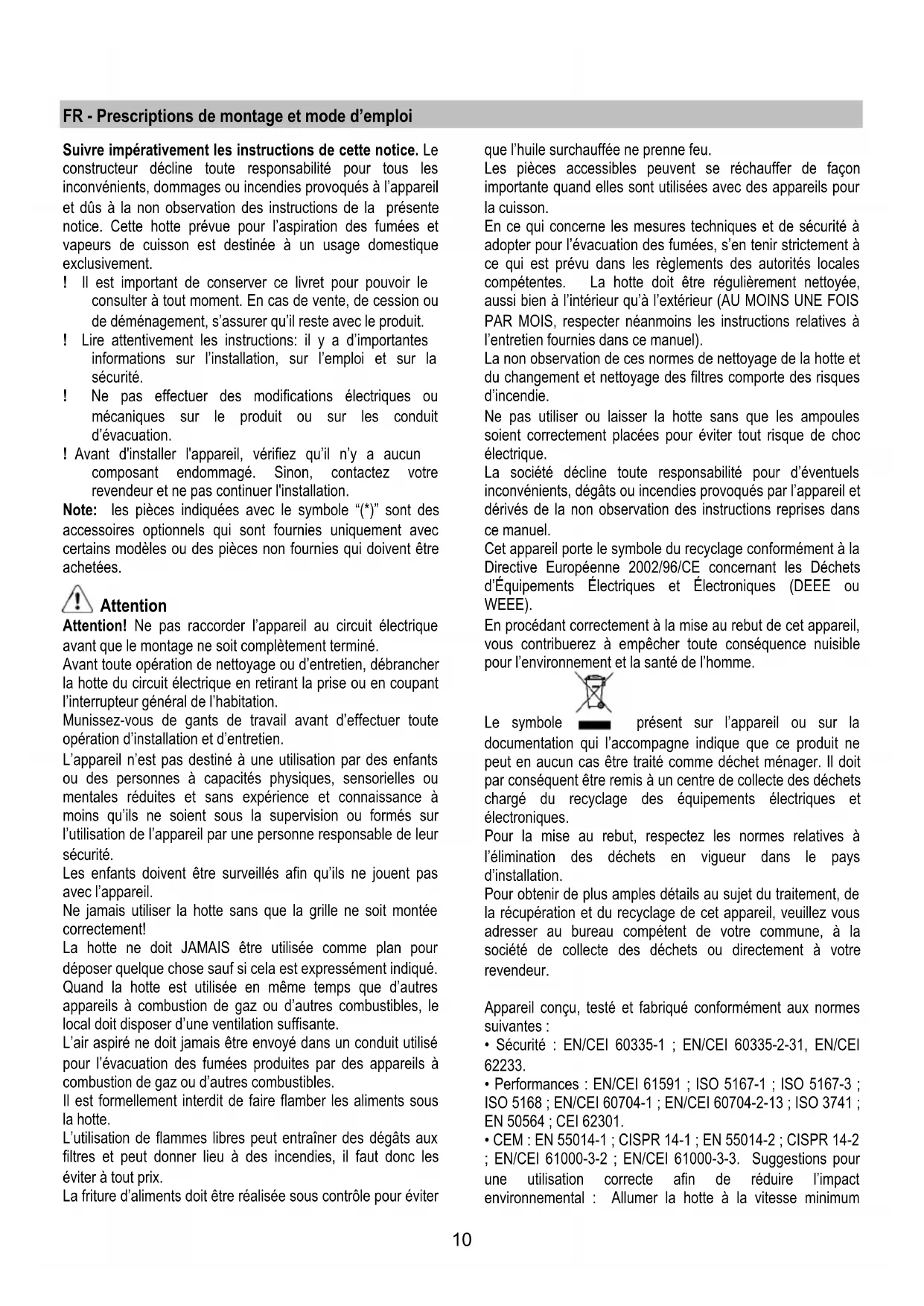 - Sécurité : EN/CEI 60335-1 ; EN/CEI 60335-2-31, EN/CEI