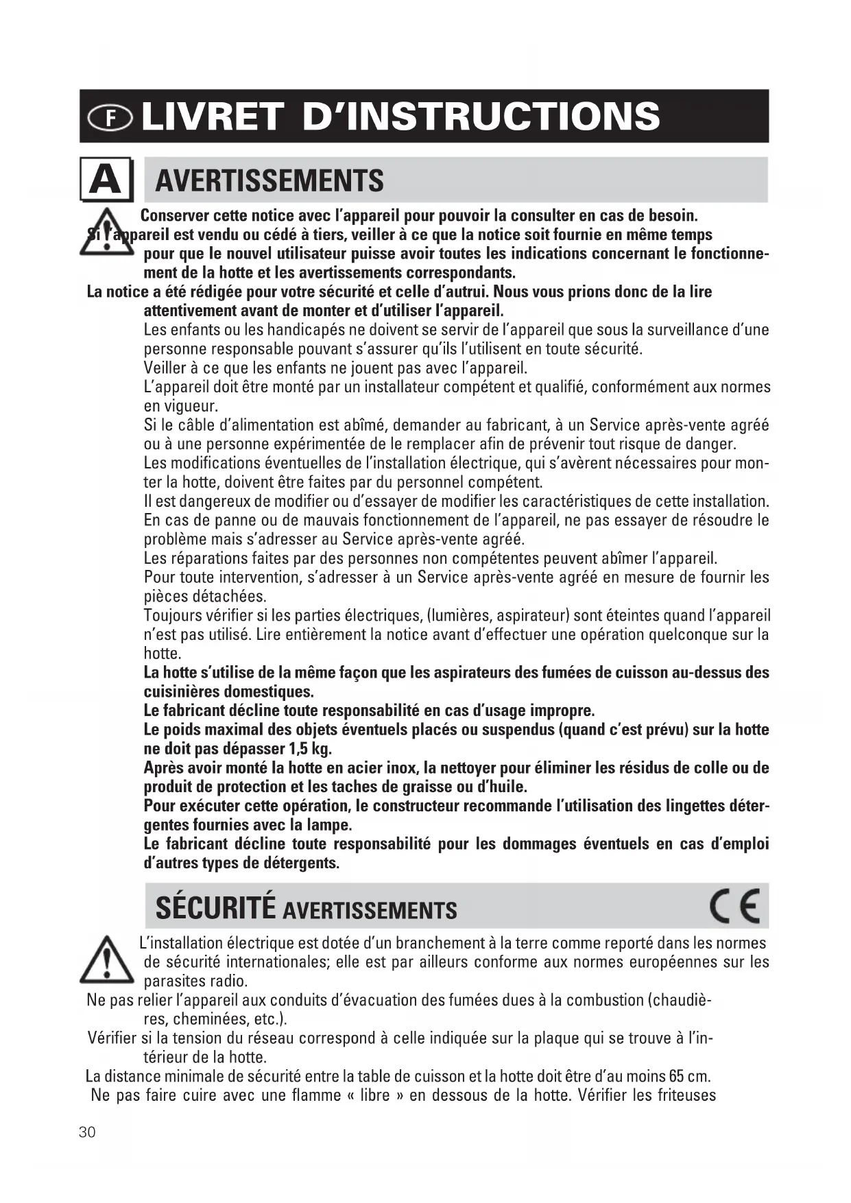 Conserver cette notice avec l’appareil pour pouvoir la consulter en cas de besoin. Si l’appareil est vendu ou cédé à tiers, veiller à ce que la notice soit fournie en même temps pour que le nouvel utilisateur puisse avoir toutes les indications concernant le fonctionne- ment de la hotte et les avertissements correspondants. La notice a été rédigée pour votre sécurité et celle d’autrui. Nous vous prions donc de la lire attentivement avant de monter et d’utiliser l’appareil. Les enfants ou les handicapés ne doivent se servir de l’appareil que sous la surveillance d’une personne responsable pouvant s’assurer qu’ils l’utilisent en toute sécurité. Veiller à ce que les enfants ne jouent pas avec l’appareil. L’appareil doit être monté par un installateur compétent et qualifié, conformément aux normes en vigueur. Si le câble d’alimentation est abîmé, demander au fabricant, à un Service après-vente agréé ou à une personne expérimentée de le remplacer afin de prévenir tout risque de danger. Les modifications éventuelles de l’installation électrique, qui s’avèrent nécessaires pour mon- ter la hotte, doivent être faites par du personnel compétent. Il est dangereux de modifier ou d’essayer de modifier les caractéristiques de cette installation. En cas de panne ou de mauvais fonctionnement de l’appareil, ne pas essayer de résoudre le problème mais s’adresser au Service après-vente agréé. Les réparations faites par des personnes non compétentes peuvent abîmer l’appareil. Pour toute intervention, s’adresser à un Service après-vente agréé en mesure de fournir les pièces détachées. Toujours vérifier si les parties électriques, (lumières, aspirateur) sont éteintes quand l’appareil n’est pas utilisé. Lire entièrement la notice avant d’effectuer une opération quelconque sur la hotte. La hotte s’utilise de la même façon que les aspirateurs des fumées de cuisson au-dessus des cuisinières domestiques. Le fabricant décline toute responsabilité en cas d’usage impropre. Le poids maximal des objets éventuels placés ou suspendus (quand c’est prévu) sur la hotte ne doit pas dépasser 1,5 kg. Après avoir monté la hotte en acier inox, la nettoyer pour éliminer les résidus de colle ou de produit de protection et les taches de graisse ou d’huile. Pour exécuter cette opération, le constructeur recommande l’utilisation des lingettes déter- gentes fournies avec la lampe. Le fabricant décline toute responsabilité pour les dommages éventuels en cas d’emploi d’autres types de détergents.