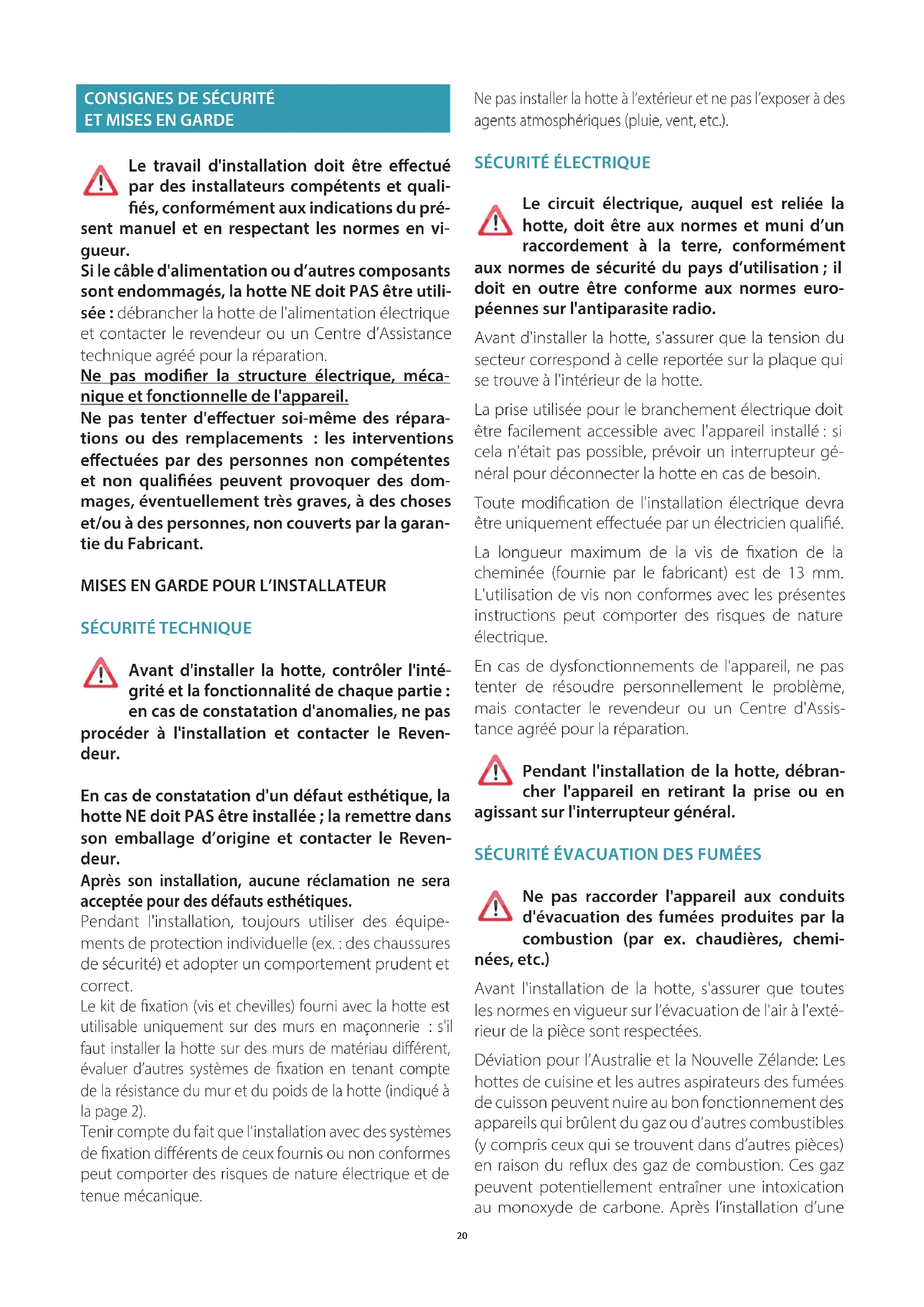 Ne pas raccorder l'appareil aux conduits d'évacuation des fumées produites par la combustion (par ex. chaudières, chemi- nées, etc.) Avant l'installation de la hotte, s'assurer que toutes les normes en vigueur sur l’évacuation de l'air à l'exté- rieur de la pièce sont respectées. Déviation pour l’Australie et la Nouvelle Zélande: Les hottes de cuisine et les autres aspirateurs des fumées de cuisson peuvent nuire au bon fonctionnement des appareils qui brûlent du gaz ou d’autres combustibles (y compris ceux qui se trouvent dans d’autres pièces) en raison du reux des gaz de combustion. Ces gaz peuvent potentiellement entraîner une intoxication au monoxyde de carbone. Après l’installation d’une21 FRANÇAIS hotte de cuisine ou d’un autre aspirateur des fumées de cuisson, le fonctionnement des appareils à gaz ca- nalisé doit être testé par une personne compétente pour vérier l’absence de reux des gaz de combus- tion. (AS/NZS 60335.2.31:2013/A4:2020)