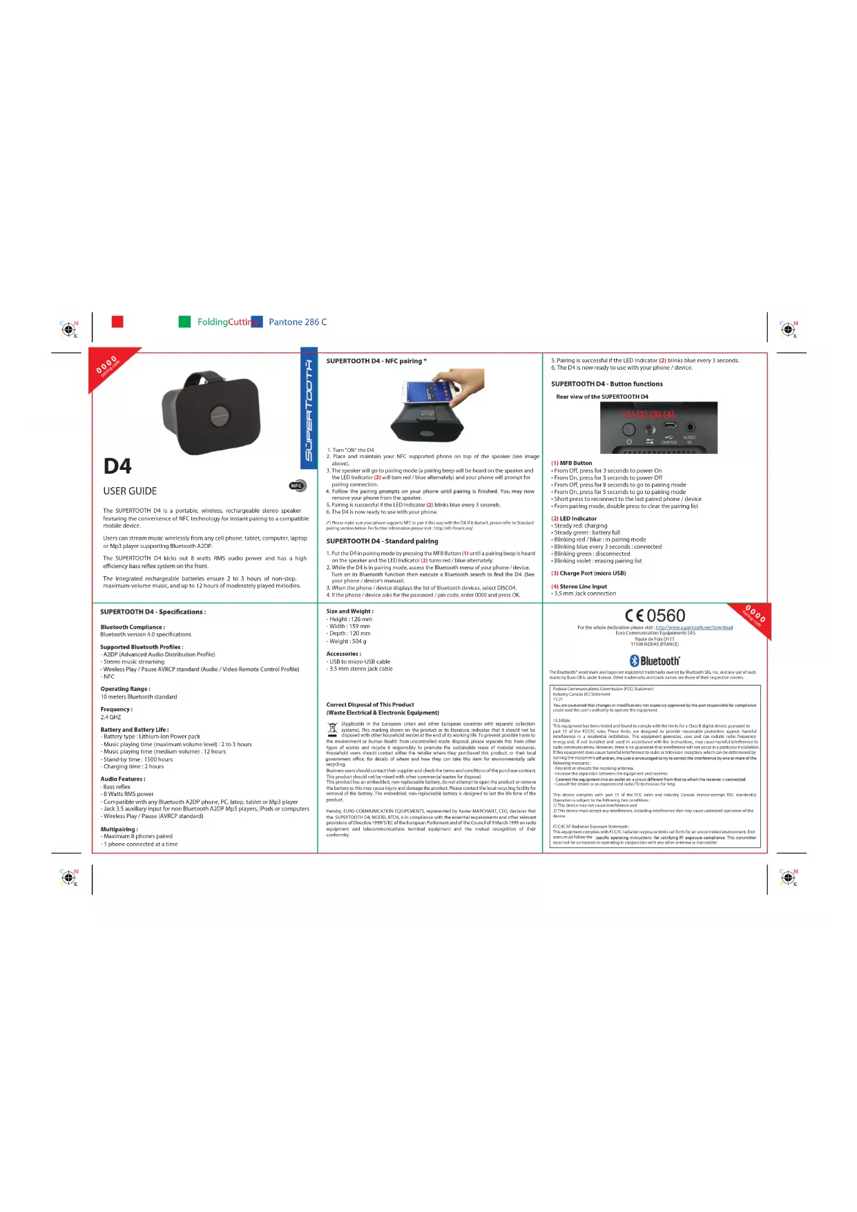 fonctionnement de l'appareil.FCC/IC Déclaration d'exposition aux radiations RF :conformité d'exposition aux RF. Cet émetteur ne doit pas être co-localisés ou fonctionner en conjonction avec une autre antenne ou transmetteur. Pour télécharger la déclaration complète, merci de visiter notre site : http://www.supertooth.net/download Euro Communication Equipements SASRoute de Foix D11711500 NEBIAS (FRANCE)Bluetooth® est une marque déposée de Bluetooth SIG, U.S.A. et mise à la disposition d’Euro-CB sous licence. Les autres noms de produits et de sociétés mentionnés sont des marques déposées ou des noms commerciaux appartenant à leurs proprétaires respectifs.Comment éliminer ce produit(Equipement électrique et électronique usagé) (Applicable dans les pays de l’Union Européenne et dans les autres pays européens disposant de systèmes de collecte sélective) avec les autres déchets ménagers. L’élimination incontrôlée des déchets pouvant porter préjudice l’environnement ou à la santé humaine, veuillez le séparer des autres types de déchets et le recycler de façon responsable. Vous favoriserez ainsi la réutilisation durable des ressources matérielles. Les particuliers sont invités à contacter le distributeur leur ayant vendu le produit ou à se renseigner auprès respectant l’environnement. Les entreprises sont invitées à contacter leurs fournisseurs et à consulter les conditions de leur contrat de vente. Ce produit ne doit pas être éliminé avec les autres déchets commerciaux. Ce produit contient une batterie non remplaçable. N’essayez pas d’ouvrir le produit ou d’enlever la batterie car cela endommagerait le produit. Veuillez contacter le centre de recyclage le plus proche pour collecter la batterie. La batterie non-remplaçable est conçue pour durer autant que le produit. Par la présente, Euro Communication Equipements, représentée par Xavier Marchant, Président Directeur Général, déclare que l'appareil SUPERTOOTH D4, MODELE BTD4, est conforme aux exigences essentielles de la directive 1995/5/EC du Parlement Européen et du Conseil du 9 Mars 1999 concernant les équipements hertziens et les équipements terminaux de télécommunications et la reconnaissance mutuelle de leur conformité. Multipairage :- 8 téléphones pairés au maximum- 1 téléphone connecté à la fois Dimensions et Poids :- Hauteur : 126 mm- Largeur : 159 mm- Profondeur : 120 mm- Poids : 504 g Accessoires inclus :- Câble USB - Micro USB- Câble jack 3.5 mm stéréo (1) (2) (3) (4) FoldingCuttingPantone 286 C