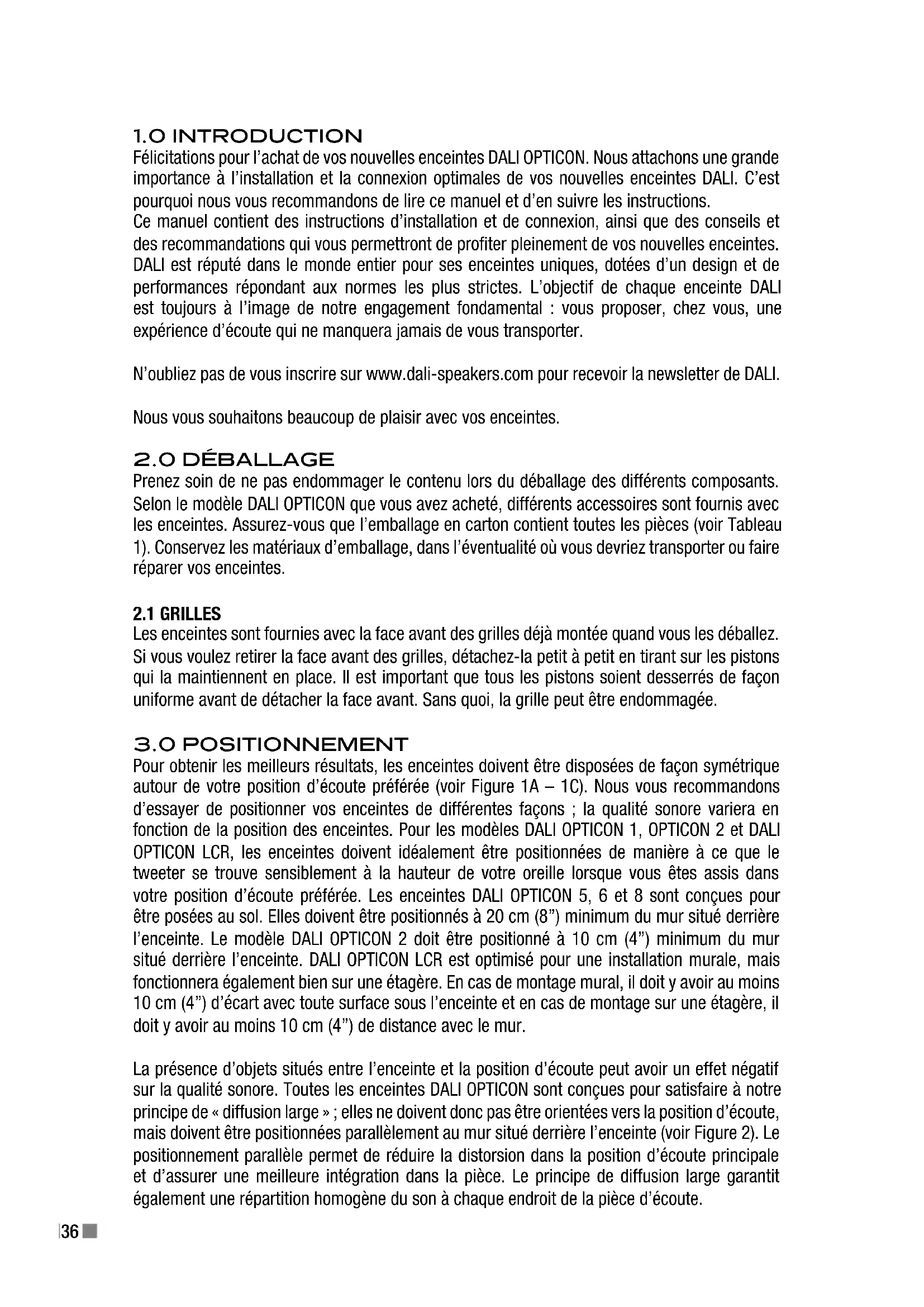 Félicitations pour l’achat de vos nouvelles enceintes DALI OPTICON. Nous attachons une grande importance à l’installation et la connexion optimales de vos nouvelles enceintes DALI. C’est pourquoi nous vous recommandons de lire ce manuel et d’en suivre les instructions. Ce manuel contient des instructions d’installation et de connexion, ainsi que des conseils et des recommandations qui vous permettront de profiter pleinement de vos nouvelles enceintes. DALI est réputé dans le monde entier pour ses enceintes uniques, dotées d’un design et de performances répondant aux normes les plus strictes. L’objectif de chaque enceinte DALI est toujours à l’image de notre engagement fondamental : vous proposer, chez vous, une expérience d’écoute qui ne manquera jamais de vous transporter. N’oubliez pas de vous inscrire sur www.dali-speakers.com pour recevoir la newsletter de DALI. Nous vous souhaitons beaucoup de plaisir avec vos enceintes.