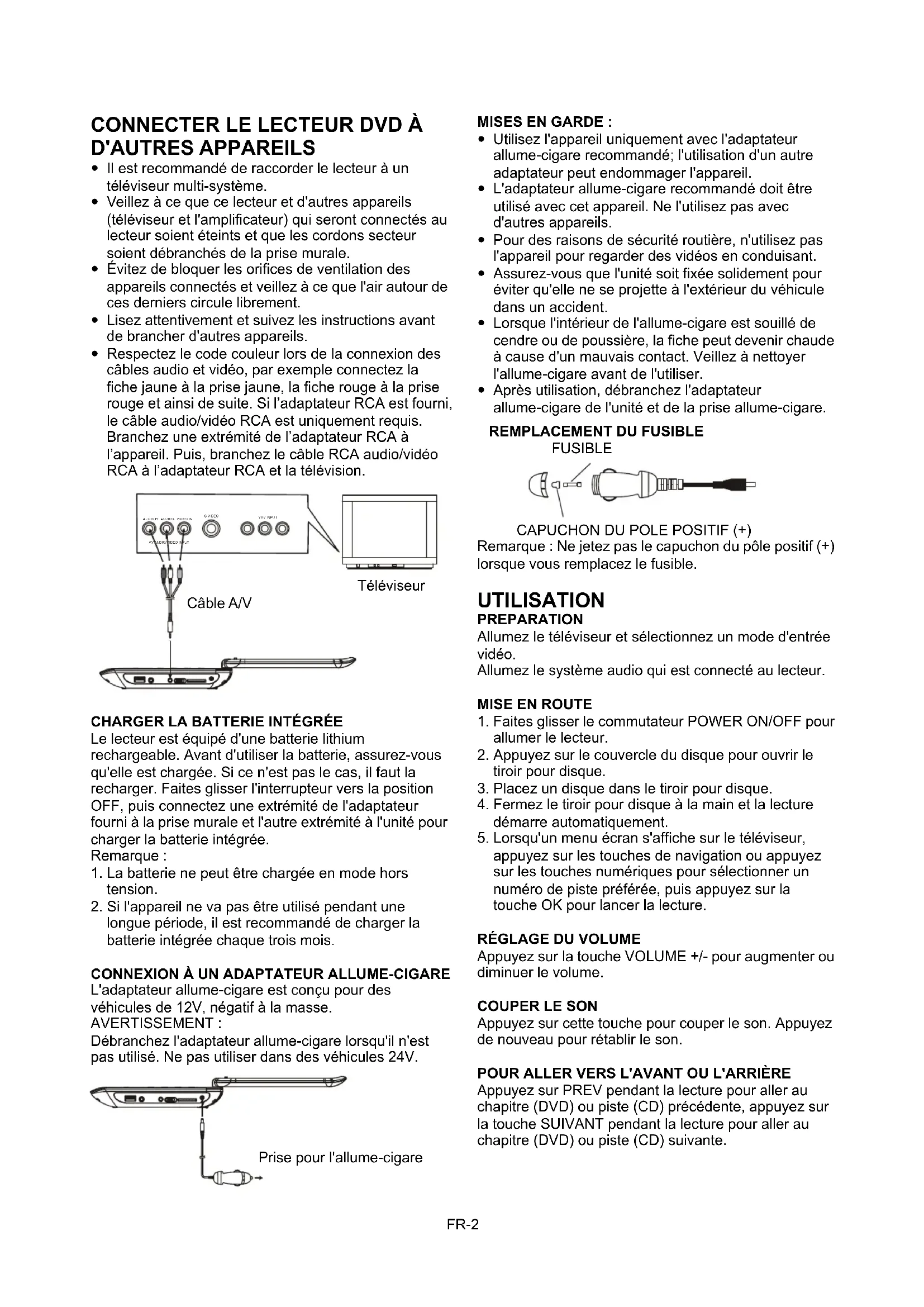 CAPUCHON DU POLE POSITIF (+) Remarque : Ne jetez pas le capuchon du pôle positif (+) lorsque vous remplacez le fusible. UTILISATION PREPARATION Allumez le téléviseur et sélectionnez un mode d'entrée vidéo. Allumez le système audio qui est connecté au lecteur.