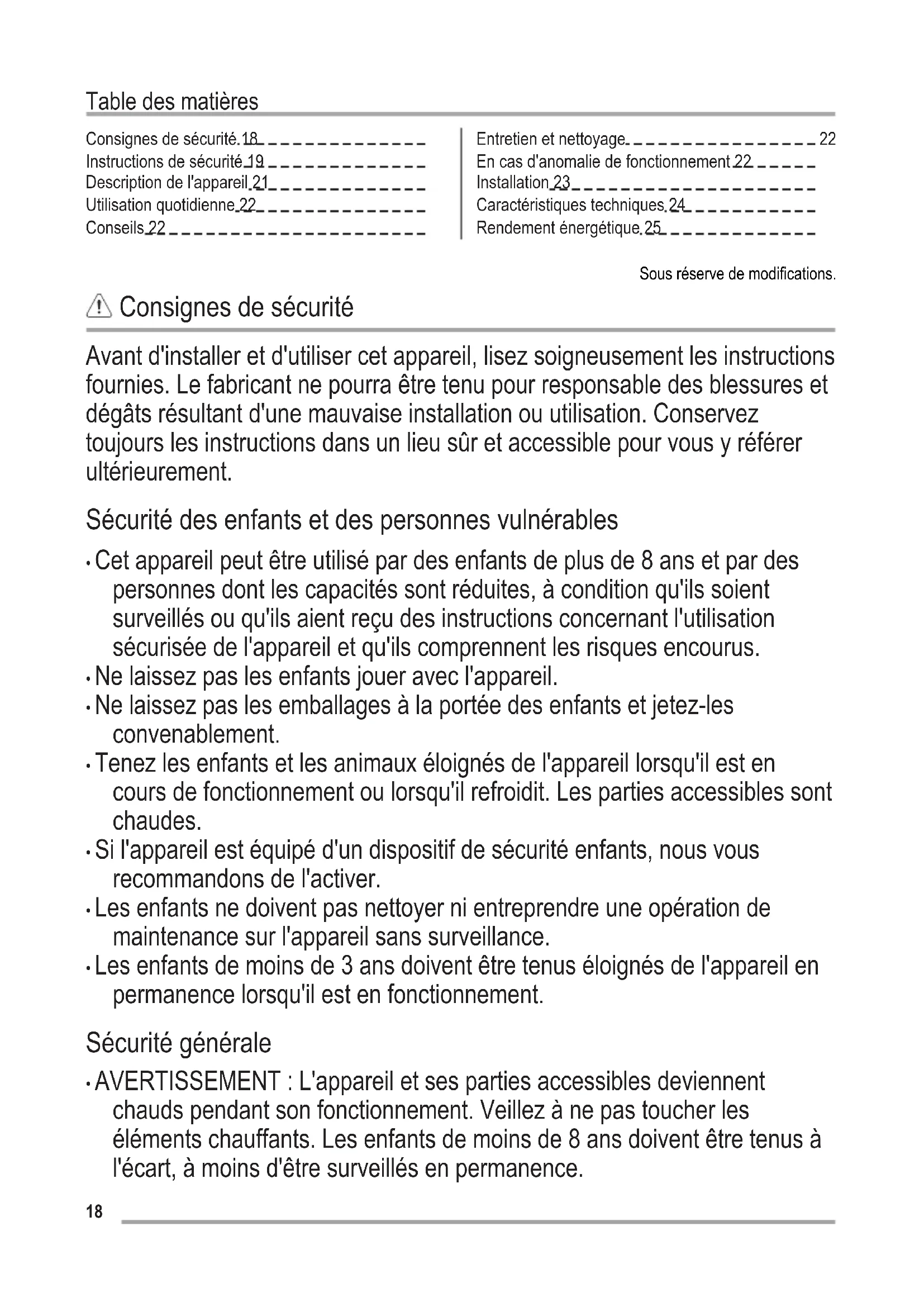 En cas d'anomalie de fonctionnement 22 Installation 23 Caractéristiques techniques 24 Rendement énergétique 25 Sous réserve de modifications. Consignes de sécurité Avant d'installer et d'utiliser cet appareil, lisez soigneusement les instructions fournies. Le fabricant ne pourra être tenu pour responsable des blessures et dégâts résultant d'une mauvaise installation ou utilisation. Conservez toujours les instructions dans un lieu sûr et accessible pour vous y référer ultérieurement. Sécurité des enfants et des personnes vulnérables