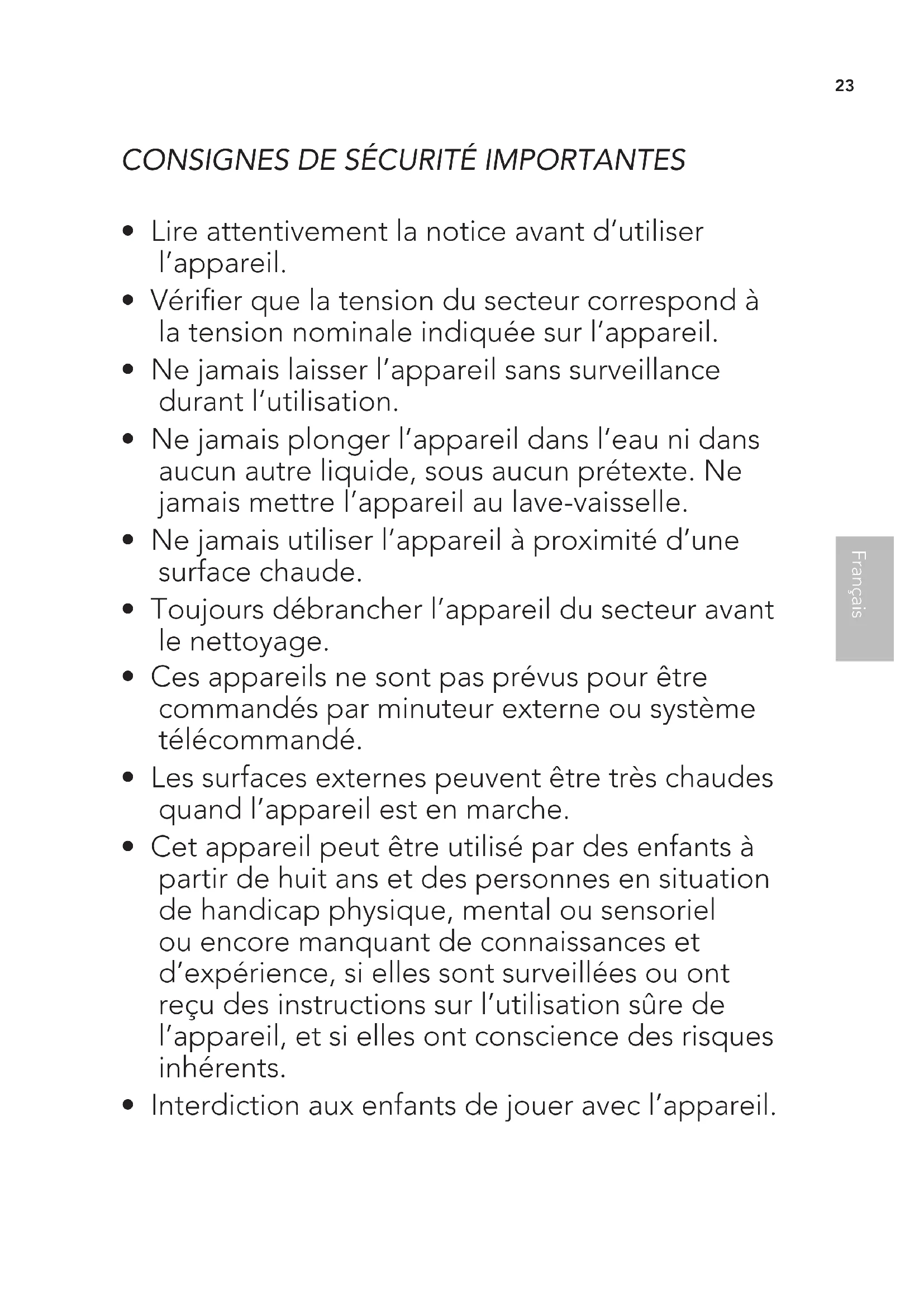 - Les enfants ne doivent pas procéder au nettoyage et à la maintenance de l’appareil, sauf s’ils ont plus de huit ans et sont surveillés par un adulte. Maintenir l’appareil et son cordon hors de portée des enfants âgés de moins de huitans.