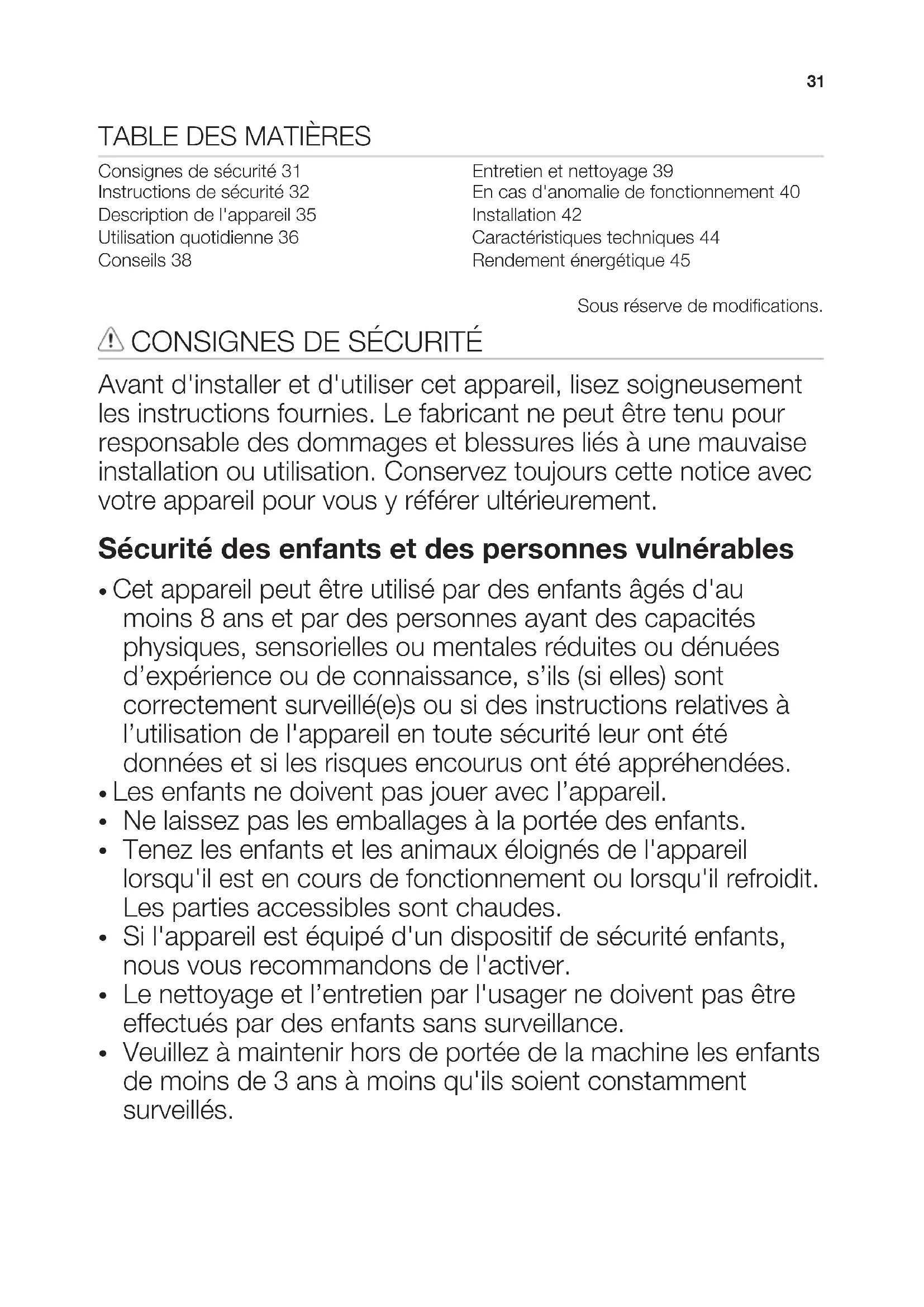 Consignes de sécurité 31 Instructions de sécurité 32 Description de l'appareil 35 Utilisation quotidienne 36 Conseils 38