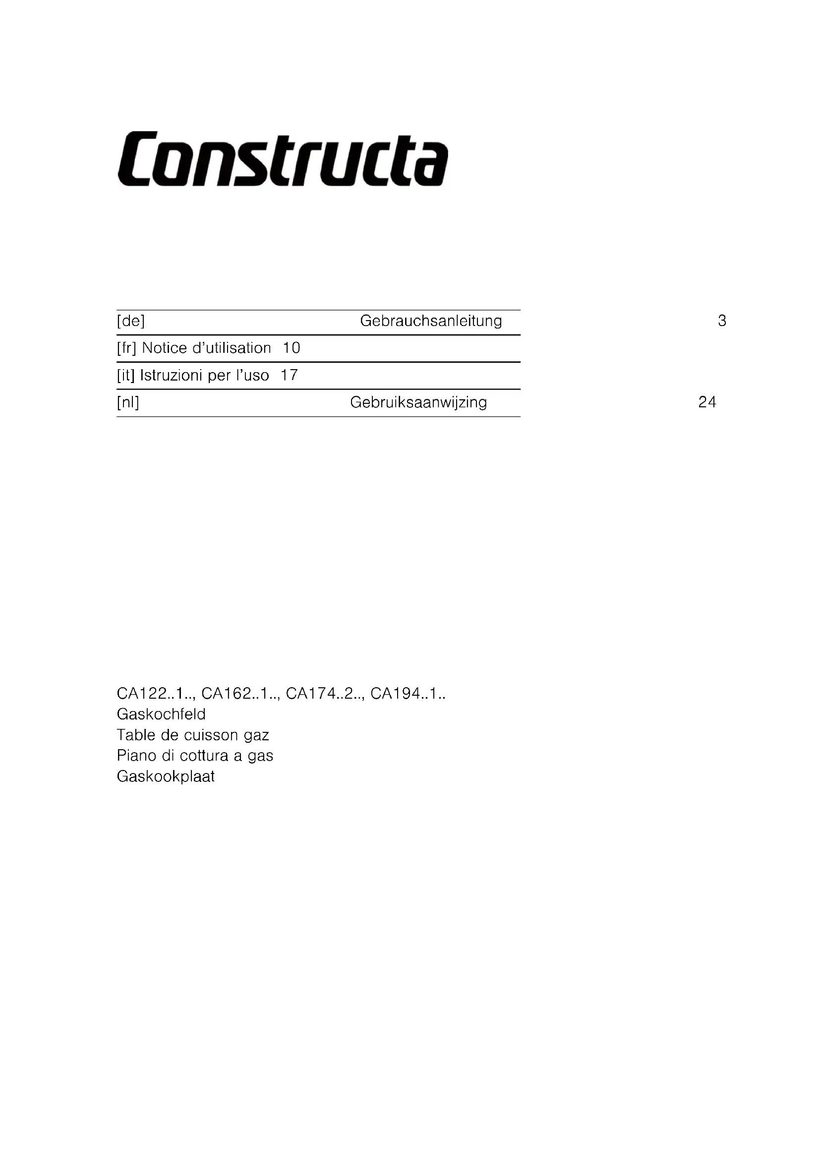 - Présentation de l'appareil . . . . . . . . . . . . . . . . . 12 Ä Brûleurs à gaz . . . . . . . . . . . . . . . . . . . . . . . . . . 13 Å Récipients de préparation. . . . . . . . . . . . . . . . . 14 2 Nettoyage et maintenance. . . . . . . . . . . . . . . . . 14 3 Anomalies, que faire ?. . . . . . . . . . . . . . . . . . . . 15 4 Service après-vente . . . . . . . . . . . . . . . . . . . . . . 16 7 Protection de l'environnement . . . . . . . . . . . . . 16 Produktinfo Vous trouverez des informations supplementaires concernant les produits, accessoires, pièces de rechange et services sur Internet sous : www.constructa.de et la boutique en ligne : www.constructa-eshop.com 8Utilisation conforme Utilisation conforme Lisez attentivement ces instructions. Ce n'est qu'à cette condition que vous pourrez utiliser votre appareil efficacement et en toute sécurité.Conservez la notice d'utilisation et d'installation, et remettez-la avec l'appareil si celui-ci change de propriétaire. Le fabricant est exempt de toute responsabilité si les instructions de cette notice ne sont pas respectées. Les images de cette notice sont proposées à titre indicatif. Ne retirez l'appareil de son emballage protecteur qu'au moment de son encastrement. Si vous constatez des dommages sur l'appareil, ne le branchez pas.Contactez notre Service Technique. Cet appareil correspond à la classe 3, selon la norme EN 30-1-1 pour les appareils à gaz : appareil encastré dans un meuble. Assurez-vous que l'installation de votre plaque de cuisson est réalisée dans le respect de la notice de montage. Cet appareil ne peut pas être installé dans des yachts ou des caravanes. Cet appareil doit être utilisé uniquement dans des endroits suffisamment ventilés. Cet appareil n'est pas conçu pour un fonctionnement avec une minuterie externe ou une commande à distance. Tous les travaux d'installation, de branchement, de réglage et d'adaptation à un autre type de gaz doivent être réalisés par un technicien agréé qui doit respecter les normes et la législation applicables, ainsi que les prescriptions des sociétés locales de distribution d'électricité et de gaz. Les dispositions applicables quant à la ventilation seront attentivement respectées. En sortie d'usine, cet appareil est adapté au type de gaz indiqué sur la plaque signalétique. S'il était nécessaire de le changer, veuillez consulter la notice de montage.Il est recommandé de faire appel à notre service technique pour l'adaptation à un autre type de gaz. Cet appareil a été conçu pour une utilisation domestique ; son utilisation à titre commercialPrécautions de sécurité importantes fr