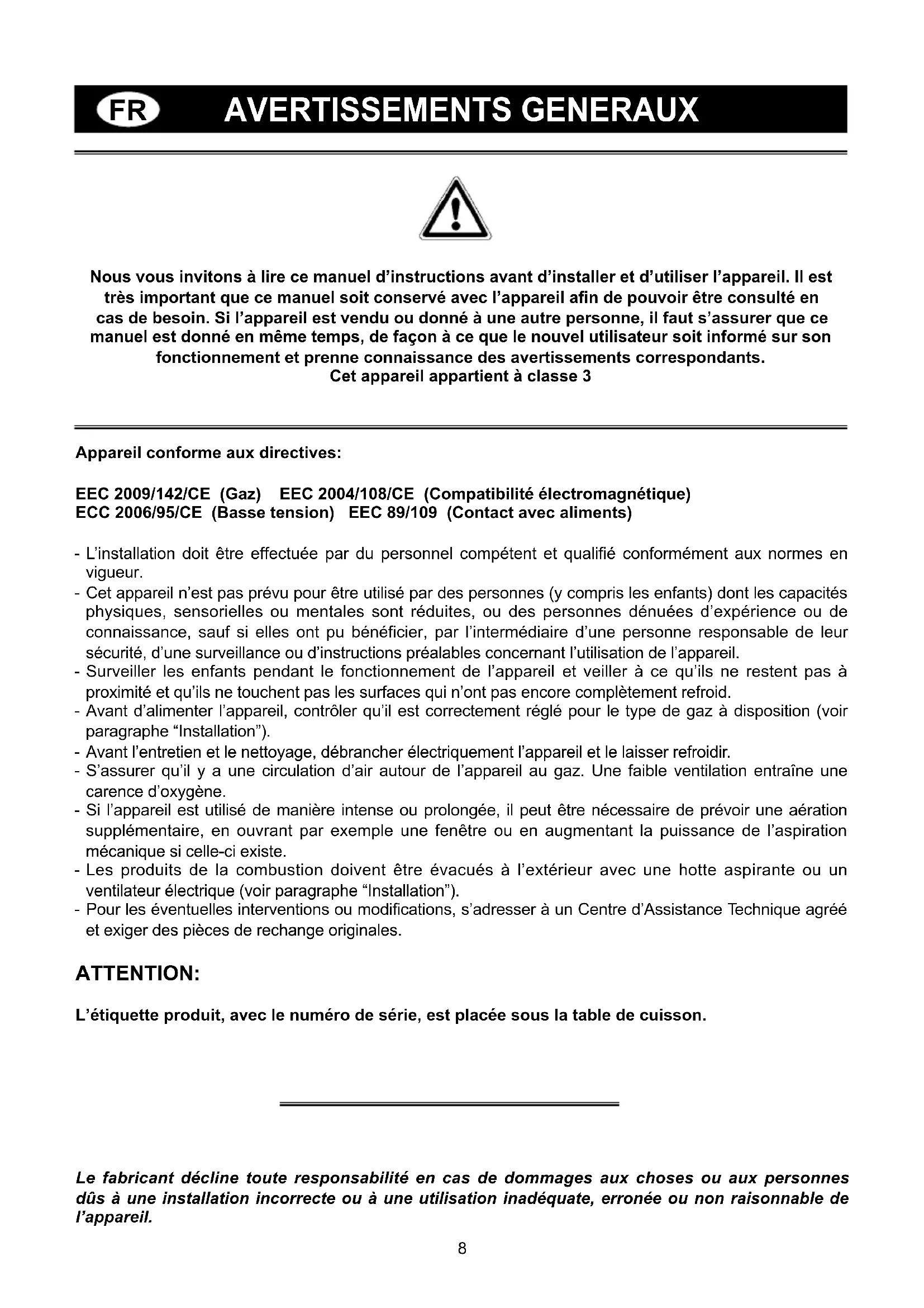AVERTISSEMENTS GENERAUX Nous vous invitons à lire ce manuel d’instructions avant d’installer et d’utiliser l’appareil. Il est très important que ce manuel soit conservé avec l’appareil afin de pouvoir être consulté en cas de besoin. Si l’appareil est vendu ou donné à une autre personne, il faut s’assurer que ce manuel est donné en même temps, de façon à ce que le nouvel utilisateur soit informé sur son fonctionnement et prenne connaissance des avertissements correspondants. Cet appareil appartient à classe 3 Appareil conforme aux directives: EEC 2009/142/CE (Gaz) EEC 2004/108/CE (Compatibilité électromagnétique) ECC 2006/95/CE (Basse tension) EEC 89/109 (Contact avec aliments) - L’installation doit être effectuée par du personnel compétent et qualifié conformément aux normes en vigueur. - Cet appareil n’est pas prévu pour être utilisé par des personnes (y compris les enfants) dont les capacités physiques, sensorielles ou mentales sont réduites, ou des personnes dénuées d’expérience ou de connaissance, sauf si elles ont pu bénéficier, par l’intermédiaire d’une personne responsable de leur sécurité, d’une surveillance ou d’instructions préalables concernant l’utilisation de l’appareil. - Surveiller les enfants pendant le fonctionnement de l’appareil et veiller à ce qu’ils ne restent pas à proximité et qu’ils ne touchent pas les surfaces qui n’ont pas encore complètement refroid. - Avant d’alimenter l’appareil, contrôler qu’il est correctement réglé pour le type de gaz à disposition (voir paragraphe “Installation”). - Avant l’entretien et le nettoyage, débrancher électriquement l’appareil et le laisser refroidir. - S’assurer qu’il y a une circulation d’air autour de l’appareil au gaz. Une faible ventilation entraîne une carence d’oxygène. - Si l’appareil est utilisé de manière intense ou prolongée, il peut être nécessaire de prévoir une aération supplémentaire, en ouvrant par exemple une fenêtre ou en augmentant la puissance de l’aspiration mécanique si celle-ci existe. - Les produits de la combustion doivent être évacués à l’extérieur avec une hotte aspirante ou un ventilateur électrique (voir paragraphe “Installation”). - Pour les éventuelles interventions ou modifications, s’adresser à un Centre d’Assistance Technique agréé et exiger des pièces de rechange originales. ATTENTION: L’étiquette produit, avec le numéro de série, est placée sous la table de cuisson. Le fabricant décline toute responsabilité en cas de dommages aux choses ou aux personnes dûs à une installation incorrecte ou à une utilisation inadéquate, erronée ou non raisonnable de l’appareil.9 1 Brûleur rapide de 3000 W 2 Brûleur semi-rapide de 1750 W 3 Brûleur auxiliaire de 1000 W 4 Brûleur triple couronne de 3800 W 5 Brûleur double couronne de 3500 W 8 Bouton commande brûleur