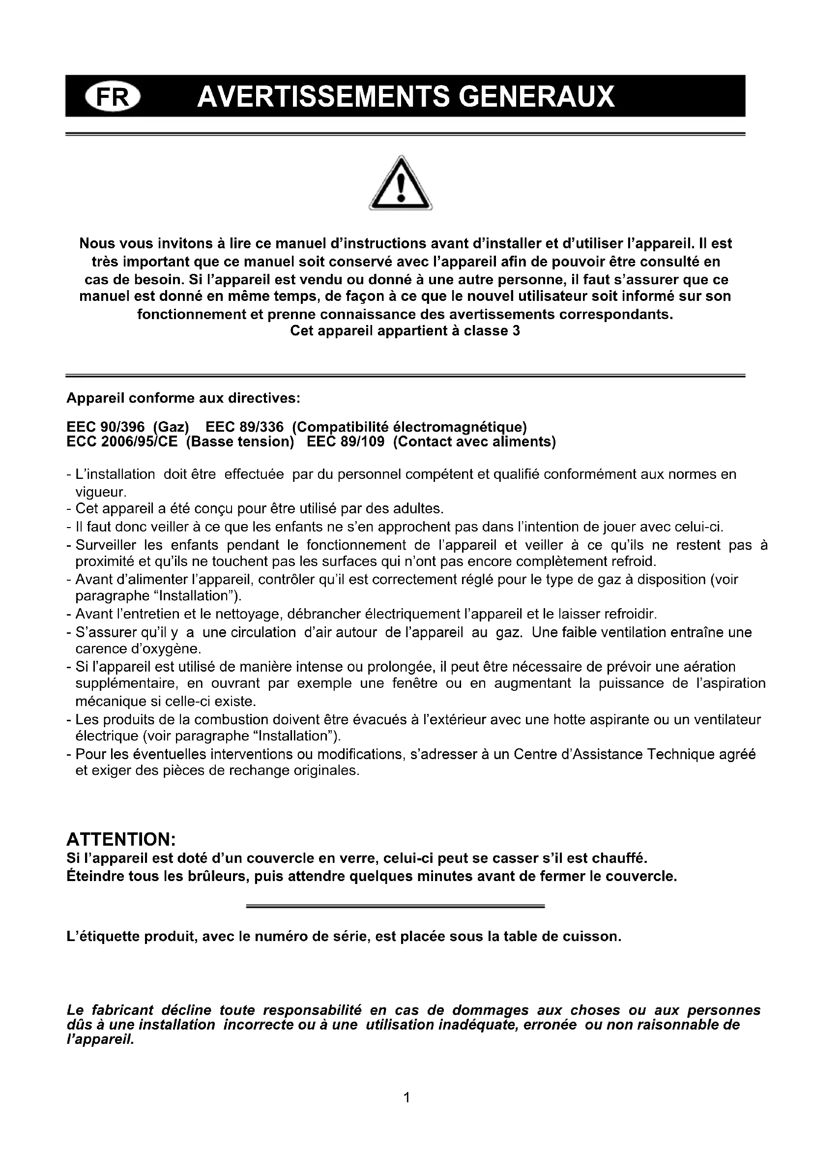 AVERTISSEMENTS GENERAUX Nous vous invitons à lire ce manuel d’instructions avant d’installer et d’utiliser l’appareil. Il est très important que ce manuel soit conservé avec l’appareil afin de pouvoir être consulté en cas de besoin. Si l’appareil est vendu ou donné à une autre personne, il faut s’assurer que ce manuel est donné en même temps, de façon à ce que le nouvel utilisateur soit informé sur son fonctionnement et prenne connaissance des avertissements correspondants. Cet appareil appartient à classe 3 Appareil conforme aux directives: EEC 90/396 (Gaz) EEC 89/336 (Compatibilité électromagnétique) ECC 2006/95/CE (Basse tension) EEC 89/109 (Contact avec aliments) L’installation doit être effectuée par du personnel compétent et qualifié conformément aux normes en vigueur. Cet appareil a été conçu pour être utilisé par des adultes. Il faut donc veiller à ce que les enfants ne s’en approchent pas dans l’intention de jouer avec celui-ci. Surveiller les enfants pendant le fonctionnement de l’appareil et veiller à ce qu’ils ne restent pas à proximité et qu’ils ne touchent pas les surfaces qui n’ont pas encore complètement refroid. Avant d’alimenter l’appareil, contrôler qu’il est correctement réglé pour le type de gaz à disposition (voir paragraphe “Installation”). Avant l’entretien et le nettoyage, débrancher électriquement l’appareil et le laisser refroidir. S’assurer qu’il y a une circulation d’air autour de l’appareil au gaz. Une faible ventilation entraîne une carence d’oxygène. Si l’appareil est utilisé de manière intense ou prolongée, il peut être nécessaire de prévoir une aération supplémentaire, en ouvrant par exemple une fenêtre ou en augmentant la puissance de l’aspiration mécanique si celle-ci existe. Les produits de la combustion doivent être évacués à l’extérieur avec une hotte aspirante ou un ventilateur électrique (voir paragraphe “Installation”). Pour les éventuelles interventions ou modifications, s’adresser à un Centre d’Assistance Technique agréé et exiger des pièces de rechange originales. ATTENTION: Si l’appareil est doté d’un couvercle en verre, celui-ci peut se casser s’il est chauffé. Éteindre tous les brûleurs, puis attendre quelques minutes avant de fermer le couvercle. L’étiquette produit, avec le numéro de série, est placée sous la table de cuisson. Le fabricant décline toute responsabilité en cas de dommages aux choses ou aux personnes dûs à une installation incorrecte ou à une utilisation inadéquate, erronée ou non raisonnable de l’appareil.