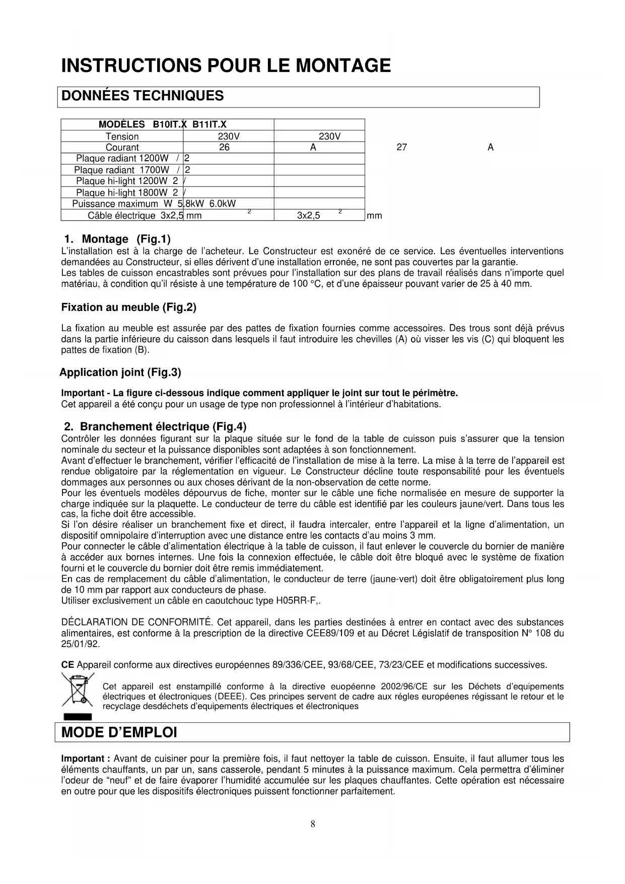 Contrôler les données figurant sur la plaque située sur le fond de la table de cuisson puis s'assurer que la tension nominale du secteur et la puissance disponibles sont adaptées à son fonctionnement.
