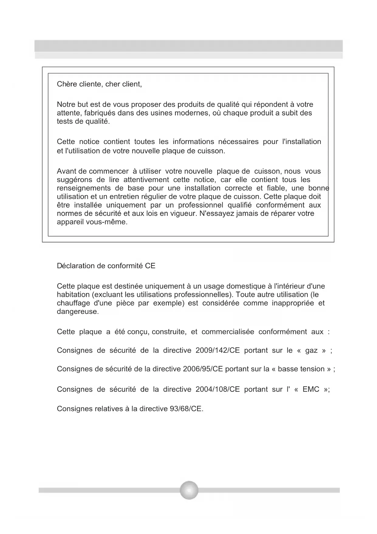 OCEACTG4FMCh Notre but est de vous proposer des produits de qualité qui répondent à votre attente, fabriqués dans des usines modernes, où chaque produit a subit des tests de qualité. Cette notice contient toutes les informations nécessaires pour l'installation et l'utilisation de votre nouvelle plaque de cuisson. Avant de commencer à utiliser votre nouvelle plaque de cuisson, nous vous suggérons de lire attentivement cette notice, car elle contient tous les renseignements de base pour une installation correcte et fiable, une bonne utilisation et un entretien régulier de votre plaque de cuisson. Cette plaque doit être installée uniquement par un professionnel qualifié conformément aux normes de sécurité et aux lois en vigueur. N'essayez jamais de réparer votre appareil vous-même. ère cliente, cher client,