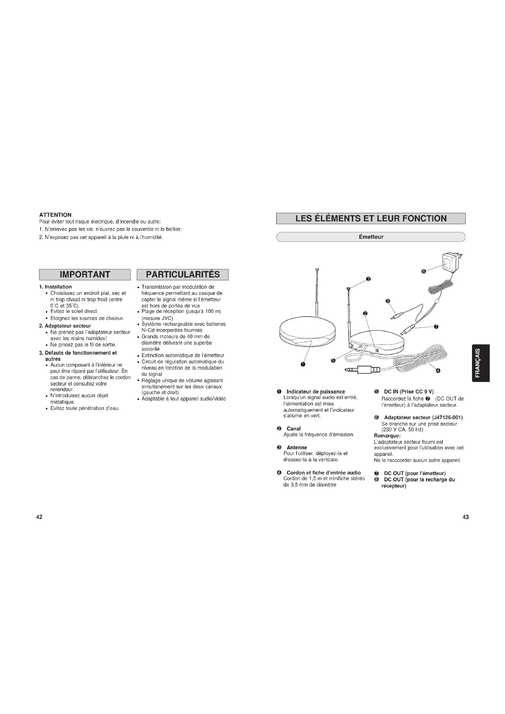 Ce qui peut vous sembler être une panne n’est pas toujours grave. Vérifiez d’abord... Symptômes Cause Remède Vérifiez le branchement de l’émetteur.Allumez l’appareil audio/vidéo source et lancez la lecture.Branchez-le avec une fiche adaptateur en option (pour convertir la sortie audio mono en sortie audio stéréo).Tournez les commandes TUNING du casque ou sélectionnez CHANNEL sur l’émetteur pour les régler.Utilisez le casque dans la portée de l’émetteur en modulation de fréquence. (Voir page 46)Remplacez la batterie Ni-Ca par une neuve. Veuillez consulter votre revendeur pour le remplacement.L’émetteur est-il éteint (OFF)?Le casque est-il éteint (OFF)?La batterie du casque est-elle épuisée?Le volume du casque est-il réglé au minimum?Le volume de l’appareil audio/vidéo source est-il réglé au minimum?L’émetteur est-il relié à un appareil à sortie audio mono?La batterie du casque est-elle épuisée?Le volume de l’appareil audio/vidéo source est-il réglé trop fort?La batterie du casque est-elle épuisée?Les signaux en modulation de fréquence sont-ils correctement captés?Le volume de l’appareil audio/vidéo source est-il réglé trop bas? Le casque est-il trop éloigné de l’émetteur?La batterie Ni-Cd est-elle en fin de cycle de charge/décharge?Pas de son.Allumez le casque (le témoin s’allume).Rechargez complètement la batterie du casque.Réglez le volume du casque au niveau convenable.Augmentez le volume de l’appareil audio/vidéo source le plus haut possible avant distorsion.Réglez le volume de l’appareil audio/vidéo source le plus haut possible avant distorsion.Réglez le volume de l’appareil audio/vidéo source le plus haut possible avant distorsion.Rechargez complétement la batterie du casque.Rechargez complètement la batterie du casque.Pas de son au canal droit.Distorsion sonore.Son brouillé.La charge de la batterie est impossible. Caractéristiques générales Modulation : Modulation de fréquence stéréo Fréquence porteuse : 863 – 865 MHz Portée utile : Max. 100 m (système de mesure JVC dans des conditions ambiantes contrôlées) Réponse en fréquence : 30 – 15,000 Hz Distorsion : Inférieure à 4% (à 1 kHz) Émetteur (J22121-001) Alimentation : 9 Vcc (avec adaptateur secteur spécial) Connecteur d’entrée : minifiche stéréo diam. 3,5 mm Impédance d’entrée : 25 kΩ Niveau d’entrée nominal : 300 mV Dimensions : 100 (L) x 100 (P) x 106 (H) mm (comprenant l’antenne) Poids : 115 g (sans câble ni adaptateur secteur) Casque (HA-W500RF) Alimentation : Batterie Ni-Cd rechargeable (1,2 V) x 2 Durée d’utilisation de la batterie : 20 heures (pour une charge de 24 heures) Poids : 280 g (avec batterie Ni-Cd rechargeable x 2 installée) Accessoires fournis d’origine Mode d’emploi x 1 Adaptateur secteur x 1 Câble de raccordement x 1 (minijack stéréo diam. 3,5 mm – fiche RCA x 2 ; 0,1 m) Fiche adaptateur x 1 (convertit la minijack stéréo diam. 3,5 mm en fiche coax stéréo standard diam. 6,3 mm)
