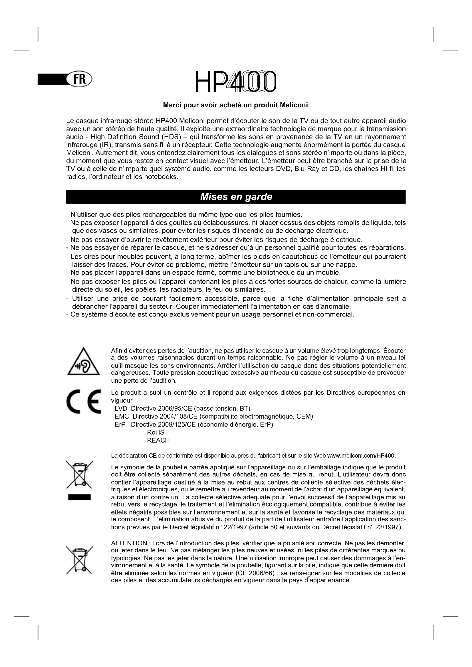 - consultate il nostro sito Internet www.meliconi.com Per ogni evenienza potete chiamare il nostro CALL CENTER, assistenza telefonica clienti, al numero (+39) 02 66012766 oppure scrivere una mail all’indirizzo cuffi e@meliconi.it Risoluzione dei problemi Cura e manutenzione Per evitare di danneggiare il prodotto si consigliano i seguenti accorgimenti: - Impedire l’ingresso di liquidi nel trasmettitore o nel ricevitore. - Scollegare l’alimentatore prima di pulire il trasmettitore - Utilizzare un panno leggermente umido per pulire l’esterno del dispositivo; non usare detergenti o solventi né smontare il dispositivo. PROBLEMA Non si sente nulla Si sente solo in un orecchio Il suono è distorto SOLUZIONE - Verifi care che gli auricolari siano collegati correttamente - Verifi care che le batterie siano state inserite correttamente e che siano cariche - Controllare e verifi care che tutti i connettori jack siano stati collegati correttamente e saldamente, compreso l’alimentatore alla presa della parete. - Controllare e verifi care che il cavo audio sia correttamente collegato alla TV o altra sorgente sonora - Controllare l’impostazione del volume del ricevitore. - Controllare e verifi care che il volume della sorgente sonora sia suffi ciente. - Controllare e verifi care l’assenza di ostacoli lungo la linea di vista tra il trasmettitore e il ricevitore. Verifi care che entrambi gli auricolari siano collegati correttamente. La batteria del ricevitore è scarica. Rimettere il ricevitore nella base del trasmettitore per la ricarica.FR - N’utiliser que des piles rechargeables du même type que les piles fournies. - Ne pas exposer l’appareil à des gouttes ou éclaboussures, ni placer dessus des objets remplis de liquide, tels que des vases ou similaires, pour éviter les risques d’incendie ou de décharge électrique. - Ne pas essayer d’ouvrir le revêtement extérieur pour éviter les risques de décharge électrique. - Ne pas essayer de réparer le casque, et ne s’adresser qu’à un personnel qualifi é pour toutes les réparations. - Les cires pour meubles peuvent, à long terme, abîmer les pieds en caoutchouc de l’émetteur qui pourraient laisser des traces. Pour éviter ce problème, mettre l’émetteur sur un tapis ou sur une nappe. - Ne pas placer l’appareil dans un espace fermé, comme une bibliothèque ou un meuble. - Ne pas exposer les piles ou l’appareil contenant les piles à des fortes sources de chaleur, comme la lumière directe du soleil, les poêles, les radiateurs, le feu ou similaires. - Utiliser une prise de courant facilement accessible, parce que la fi che d’alimentation principale sert à débrancher l’appareil du secteur. Couper immédiatement l'alimentation en cas d'anomalie. - Ce système d’écoute est conçu exclusivement pour un usage personnel et non-commercial. HP400 HP400 Merci pour avoir acheté un produit Meliconi Le casque infrarouge stéréo HP400 Meliconi permet d’écouter le son de la TV ou de tout autre appareil audio avec un son stéréo de haute qualité. Il exploite une extraordinaire technologie de marque pour la transmission audio - High Defi nition Sound (HDS) – qui transforme les sons en provenance de la TV en un rayonnement infrarouge (IR), transmis sans fi l à un récepteur. Cette technologie augmente énormément la portée du casque Meliconi. Autrement dit, vous entendez clairement tous les dialogues et sons stéréo n’importe où dans la pièce, du moment que vous restez en contact visuel avec l’émetteur. L’émetteur peut être branché sur la prise de la TV ou à celle de n’importe quel système audio, comme les lecteurs DVD, Blu-Ray et CD, les chaînes Hi-fi , les radios, l’ordinateur et les notebooks. Mises en garde Afi n d’éviter des pertes de l’audition, ne pas utiliser le casque à un volume élevé trop longtemps. Écouter à des volumes raisonnables durant un temps raisonnable. Ne pas régler le volume à un niveau tel qu’il masque les sons environnants. Arrêter l’utilisation du casque dans des situations potentiellement dangereuses. Toute pression acoustique excessive au niveau du casque est susceptible de provoquer une perte de l’audition. Le produit a subi un contrôle et il répond aux exigences dictées par les Directives européennes en vigueur : LVD Directive 2006/95/CE (basse tension, BT) EMC Directive 2004/108/CE (compatibilité électromagnétique, CEM) ErP Directive 2009/125/CE (économie d’énergie, ErP) RoHS REACHLa déclaration CE de conformité est disponible auprès du fabricant et sur le site Web www.meliconi.com/HP400. Le symbole de la poubelle barrée appliqué sur l’appareillage ou sur l’emballage indique que le produit doit être collecté séparément des autres déchets, en cas de mise au rebut. L’utilisateur devra donc confi er l’appareillage destiné à la mise au rebut aux centres de collecte sélective des déchets élec- triques et électroniques, ou le remettre au revendeur au moment de l’achat d’un appareillage équivalent, à raison d’un contre un. La collecte sélective adéquate pour l’envoi successif de l’appareillage mis au rebut vers le recyclage, le traitement et l’élimination écologiquement compatible, contribue à éviter les effets négatifs possibles sur l’environnement et sur la santé et favorise le recyclage des matériaux qui le composent. L’élimination abusive du produit de la part de l’utilisateur entraîne l’application des sanc- tions prévues par le Décret législatif n° 22/1997 (article 50 et suivants du Décret législatif n° 22/1997). ATTENTION : Lors de l’introduction des piles, vérifi er que la polarité soit correcte. Ne pas les démonter, ou jeter dans le feu. Ne pas mélanger les piles neuves et usées, ni les piles de différentes marques ou typologies. Ne pas les jeter dans la nature. Une utilisation impropre peut causer des dommages à l’en- vironnement et à la santé. Le s