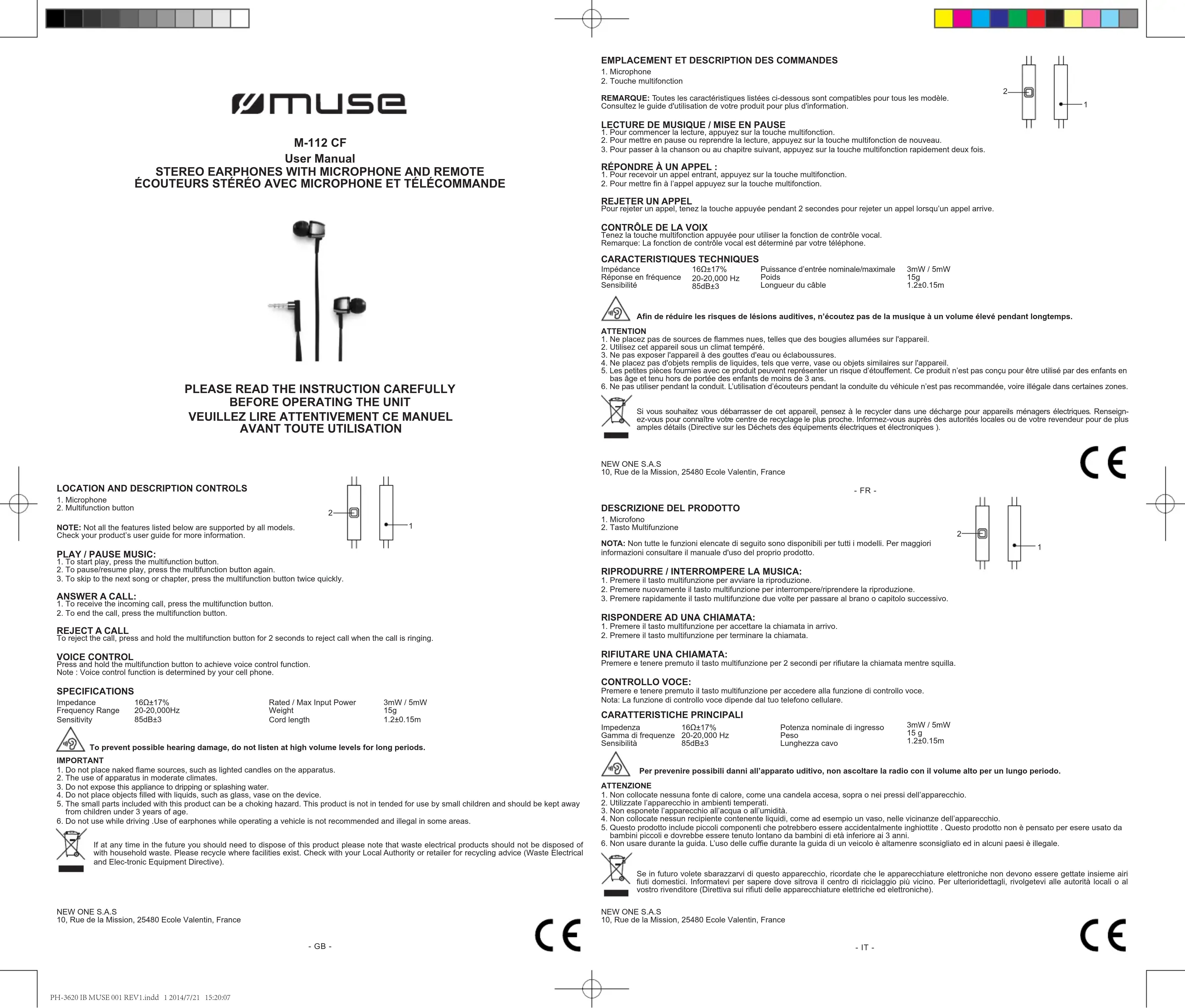 M112 CF - Ecouteur MUSE - Notice d'utilisation et mode d'emploi gratuit