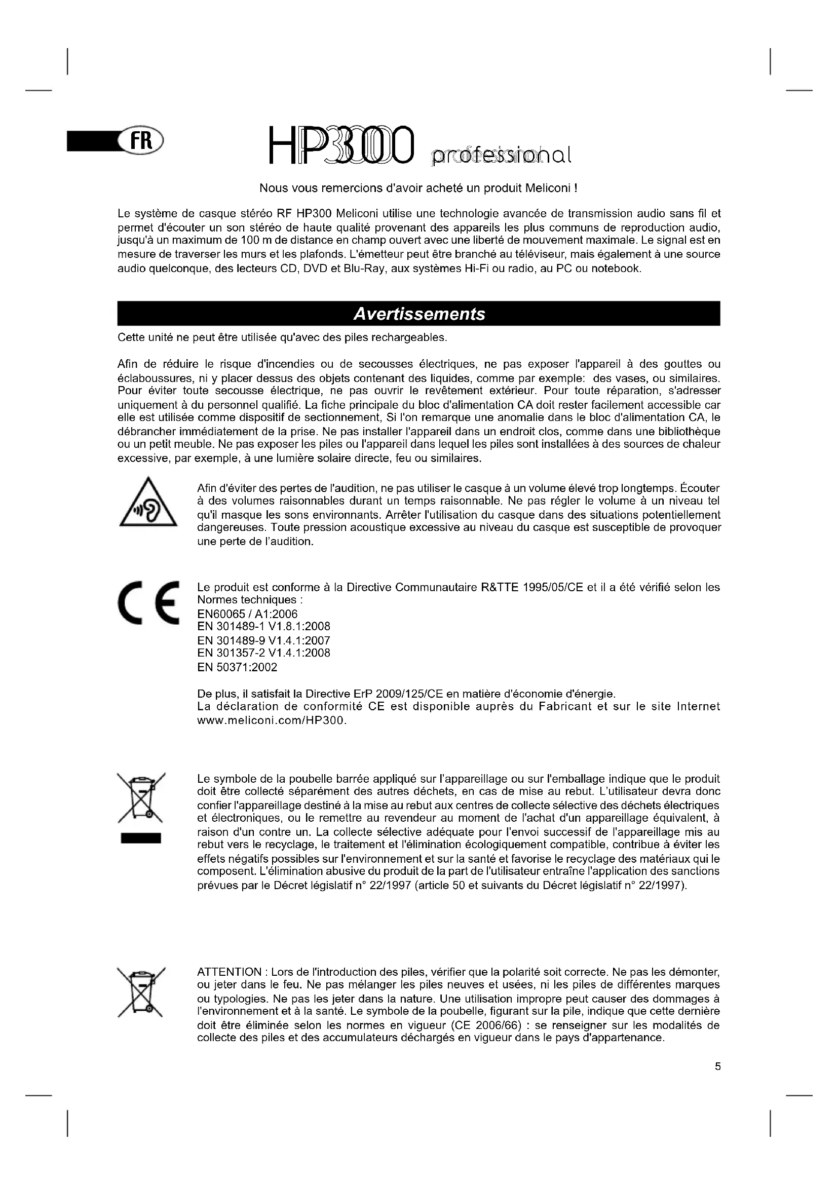 Afi n d'éviter des pertes de l'audition, ne pas utiliser le casque à un volume élevé trop longtemps. Écouter à des volumes raisonnables durant un temps raisonnable. Ne pas régler le volume à un niveau tel qu'il masque les sons environnants. Arrêter l'utilisation du casque dans des situations potentiellement dangereuses. Toute pression acoustique excessive au niveau du casque est susceptible de provoquer une perte de l’audition. Le produit est conforme à la Directive Communautaire R&TTE 1995/05/CE et il a été vérifi é selon les Normes techniques :EN60065 / A1:2006 EN 301489-1 V1.8.1:2008EN 301489-9 V1.4.1:2007EN 301357-2 V1.4.1:2008EN 50371:2002De plus, il satisfait la Directive ErP 2009/125/CE en matière d'économie d'énergie. La déclaration de conformité CE est disponible auprès du Fabricant et sur le site Internet www.meliconi.com/HP300.Cette unité ne peut être utilisée qu'avec des piles rechargeables. Afi n de réduire le risque d'incendies ou de secousses électriques, ne pas exposer l'appareil à des gouttes ou éclaboussures, ni y placer dessus des objets contenant des liquides, comme par exemple: des vases, ou similaires. Pour éviter toute secousse électrique, ne pas ouvrir le revêtement extérieur. Pour toute réparation, s'adresser uniquement à du personnel qualifi é. La fi che principale du bloc d'alimentation CA doit rester facilement accessible car elle est utilisée comme dispositif de sectionnement, Si l'on remarque une anomalie dans le bloc d'alimentation CA, le débrancher immédiatement de la prise. Ne pas installer l'appareil dans un endroit clos, comme dans une bibliothèque ou un petit meuble. Ne pas exposer les piles ou l'appareil dans lequel les piles sont installées à des sources de chaleur excessive, par exemple, à une lumière solaire directe, feu ou similaires. HP300 HP300 professional professional Nous vous remercions d'avoir acheté un produit Meliconi ! Le système de casque stéréo RF HP300 Meliconi utilise une technologie avancée de transmission audio sans fi l et permet d'écouter un son stéréo de haute qualité provenant des appareils les plus communs de reproduction audio, jusqu'à un maximum de 100 m de distance en champ ouvert avec une liberté de mouvement maximale. Le signal est en mesure de traverser les murs et les plafonds. L'émetteur peut être branché au téléviseur, mais également à une source audio quelconque, des lecteurs CD, DVD et Blu-Ray, aux systèmes Hi-Fi ou radio, au PC ou notebook. ATTENTION : Lors de l'introduction des piles, vérifi er que la polarité soit correcte. Ne pas les démonter, ou jeter dans le feu. Ne pas mélanger les piles neuves et usées, ni les piles de différentes marques ou typologies. Ne pas les jeter dans la nature. Une utilisation impropre peut causer des dommages à l'environnement et à la santé. Le symbole de la poubelle, fi gurant sur la pile, indique que cette dernière doit être éliminée selon les normes en vigueur (CE 2006/66) : se renseigner sur les modalités de collecte des piles et des accumulateurs déchargés en vigueur dans le pays d'appartenance. Avertissements Le symbole de la poubelle barrée appliqué sur l’appareillage ou sur l'emballage indique que le produit doit être collecté séparément des autres déchets, en cas de mise au rebut. L’utilisateur devra donc confi er l'appareillage destiné à la mise au rebut aux centres de collecte sélective des déchets électriques et électroniques, ou le remettre au revendeur au moment de l'achat d'un appareillage équivalent, à raison d'un contre un. La collecte sélective adéquate pour l’envoi successif de l'appareillage mis au rebut vers le recyclage, le traitement et l'élimination écologiquement compatible, contribue à éviter les effets négatifs possibles sur l'environnement et sur la santé et favorise le recyclage des matériaux qui le composent. L'élimination abusive du produit de la part de l'utilisateur entraîne l'application des sanctions prévues par le Décret législatif n° 22/1997 (article 50 et suivants du Décret législatif n° 22/1997).6