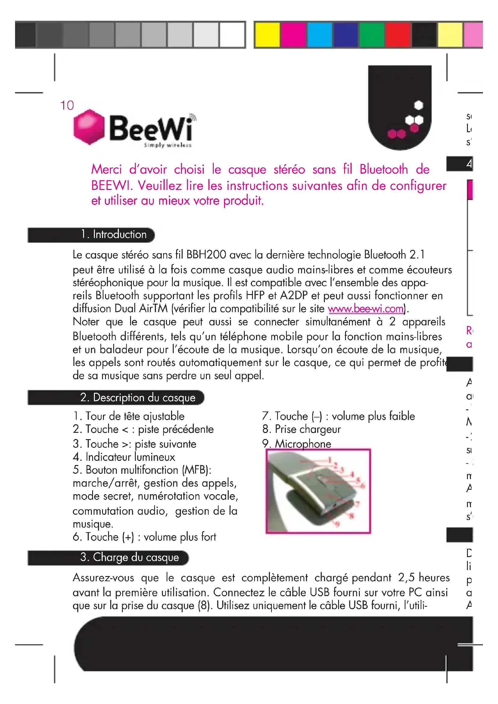 Le casque stéréo sans l BBH200 avec la dernière technologie Bluetooth 2.1 peut être utilisé à la fois comme casque audio mains-libres et comme écouteurs stéréophonique pour la musique. Il est compatible avec l’ensemble des appa- reils Bluetooth supportant les profils HFP et A2DP et peut aussi fonctionner en diffusion Dual AirTM (vérifier la compatibilité sur le site www.bee-wi.com). Noter que le casque peut aussi se connecter simultanément à 2 appareils Bluetooth différents, tels qu’un téléphone mobile pour la fonction mains-libres et un baladeur pour l’écoute de la musique. Lorsqu’on écoute de la musique, les appels sont routés automatiquement sur le casque, ce qui permet de proter de sa musique sans perdre un seul appel. Assurez-vous que le casque est complètement chargé pendant 2,5 heures avant la première utilisation. Connectez le câble USB fourni sur votre PC ainsi que sur la prise du casque (8). Utilisez uniquement le câble USB fourni, l’utili-