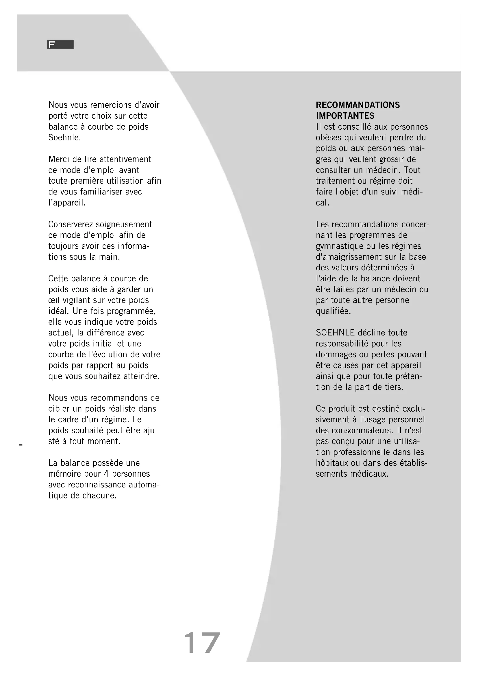BA63150tendence117634_V8.qxd 07.02.2007 6:58 Uhr Seite 1617 Nous vous remercions d’avoir porté votre choix sur cette balance à courbe de poids Soehnle. Merci de lire attentivement ce mode d’emploi avant toute première utilisation afin de vous familiariser avec l’appareil. Conserverez soigneusement ce mode d’emploi afin de toujours avoir ces informa- tions sous la main. Cette balance à courbe de poids vous aide à garder un œil vigilant sur votre poids idéal. Une fois programmée, elle vous indique votre poids actuel, la différence avec votre poids initial et une courbe de l'évolution de votre poids par rapport au poids que vous souhaitez atteindre. Nous vous recommandons de cibler un poids réaliste dans le cadre d’un régime. Le poids souhaité peut être aju- sté à tout moment. La balance possède une mémoire pour 4 personnes avec reconnaissance automa- tique de chacune. RECOMMANDATIONS IMPORTANTES Il est conseillé aux personnes obèses qui veulent perdre du poids ou aux personnes mai- gres qui veulent grossir de consulter un médecin. Tout traitement ou régime doit faire l'objet d'un suivi médi- cal. Les recommandations concer- nant les programmes de gymnastique ou les régimes d'amaigrissement sur la base des valeurs déterminées à l'aide de la balance doivent être faites par un médecin ou par toute autre personne qualifiée. SOEHNLE décline toute responsabilité pour les dommages ou pertes pouvant être causés par cet appareil ainsi que pour toute préten- tion de la part de tiers. Ce produit est destiné exclu- sivement à l'usage personnel des consommateurs. Il n'est pas conçu pour une utilisa- tion professionnelle dans les hôpitaux ou dans des établis- sements médicaux.