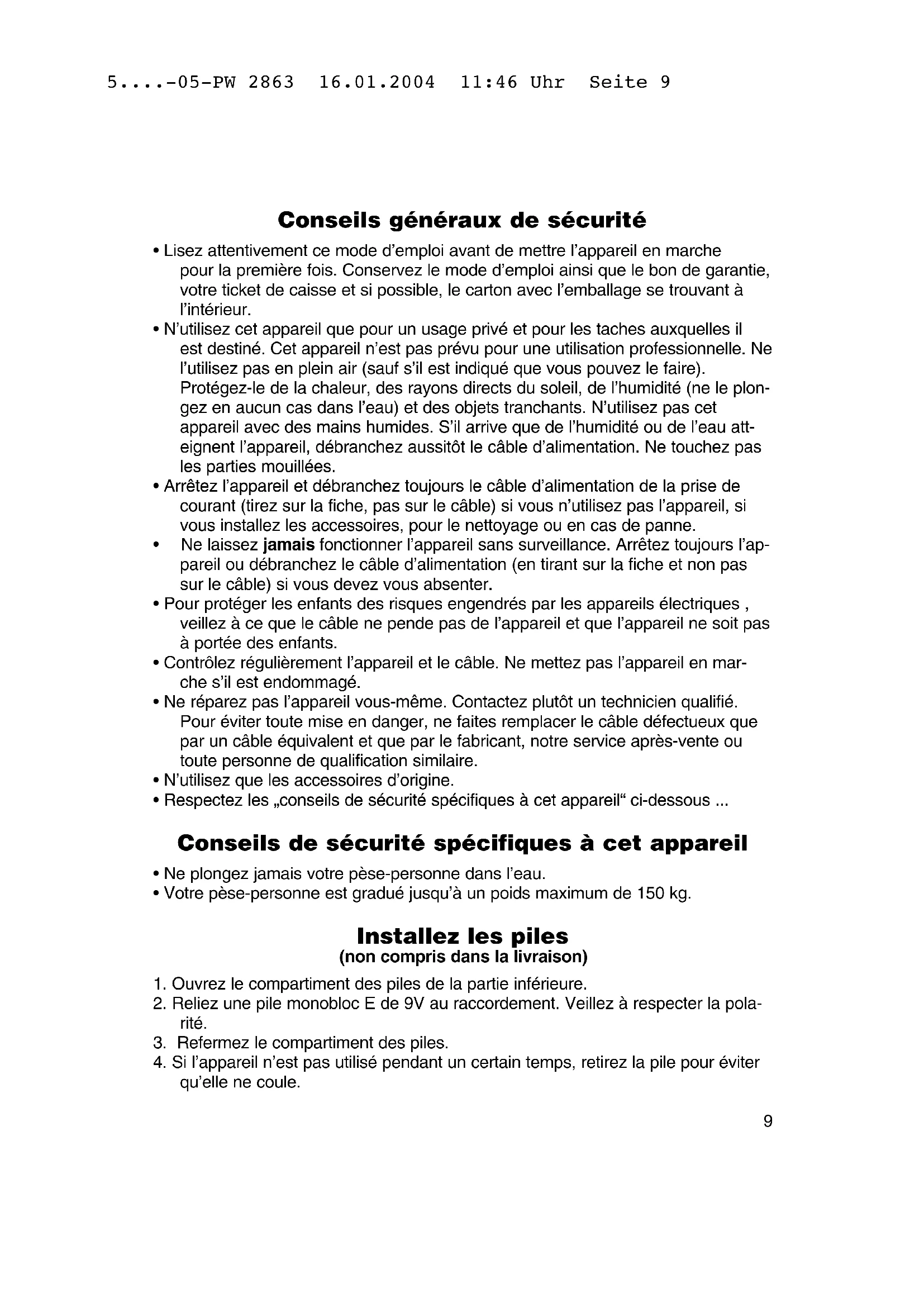 5....-05-PW 2863 16.01.2004 11:46 Uhr Seite 9Attention: ne jetez pas les piles avec vos ordures ménagères. Vous êtes priés de vous débarrasser de vos piles usagées auprès d’un service de recyclage adéquat ou du fabricant. Ne jetez jamais de piles dans le feu. Utilisation