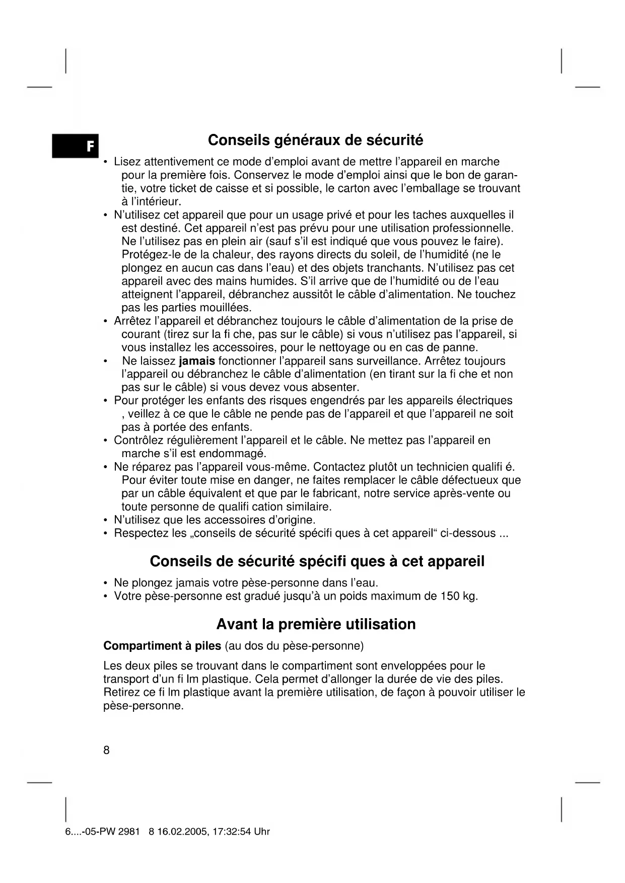 - Votre pèse-personne est gradué jusqu’à un poids maximum de 150 kg. Avant la première utilisation Compartiment à piles (au dos du pèse-personne) Les deux piles se trouvant dans le compartiment sont enveloppées pour le transport d’un fi lm plastique. Cela permet d’allonger la durée de vie des piles. Retirez ce fi lm plastique avant la première utilisation, de façon à pouvoir utiliser le pèse-personne. 6....-05-PW 2981 8 16.02.2005, 17:32:54 UhrF