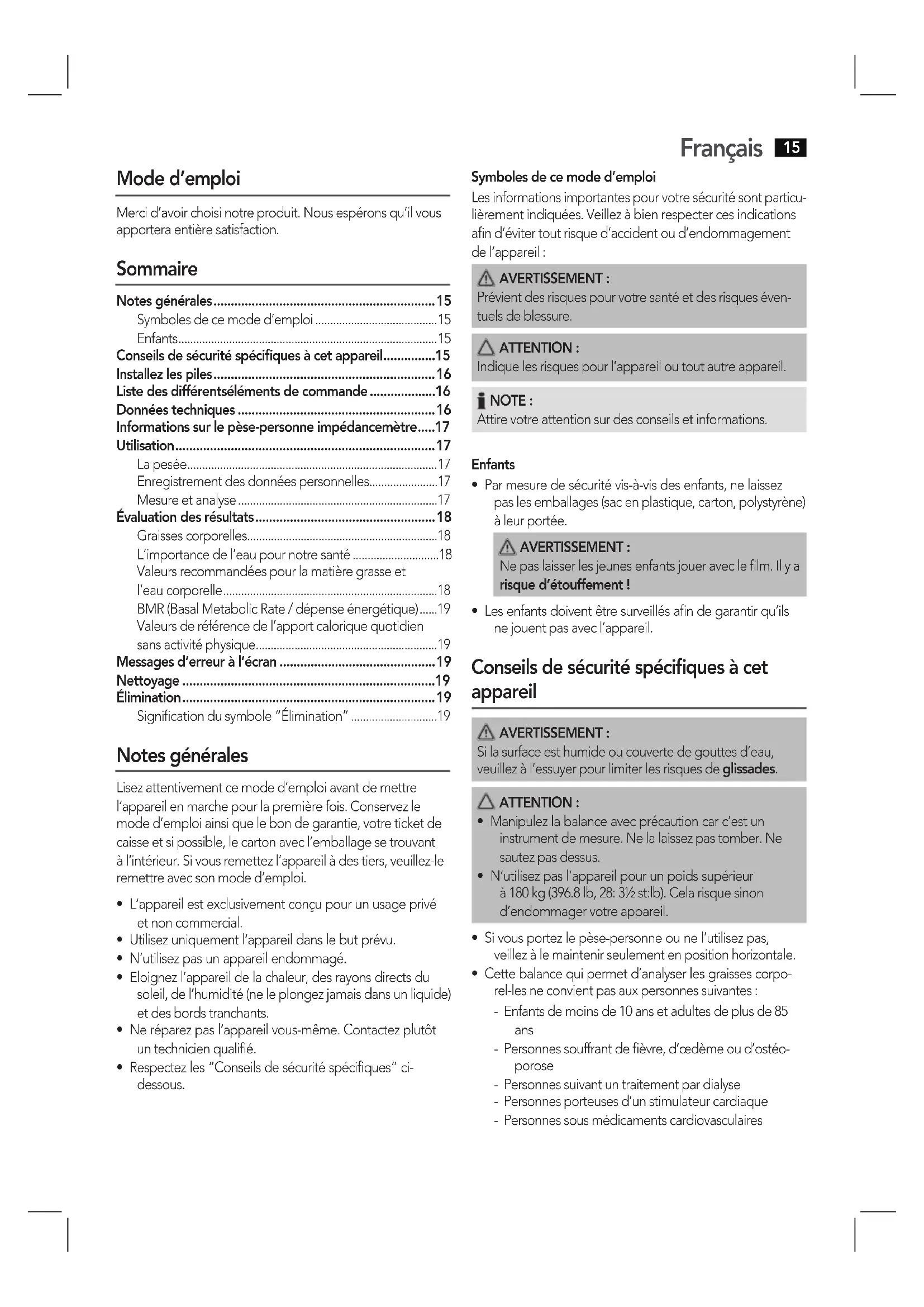 - Cette balance qui permet d’analyser les graisses corpo- rel-les ne convient pas aux personnes suivantes : - Enfants de moins de 10 ans et adultes de plus de 85 ans - Personnes souffrant de fièvre, d’œdème ou d’ostéo- porose - Personnes suivant un traitement par dialyse - Personnes porteuses d’un stimulateur cardiaque - Personnes sous médicaments cardiovasculairesFrançais