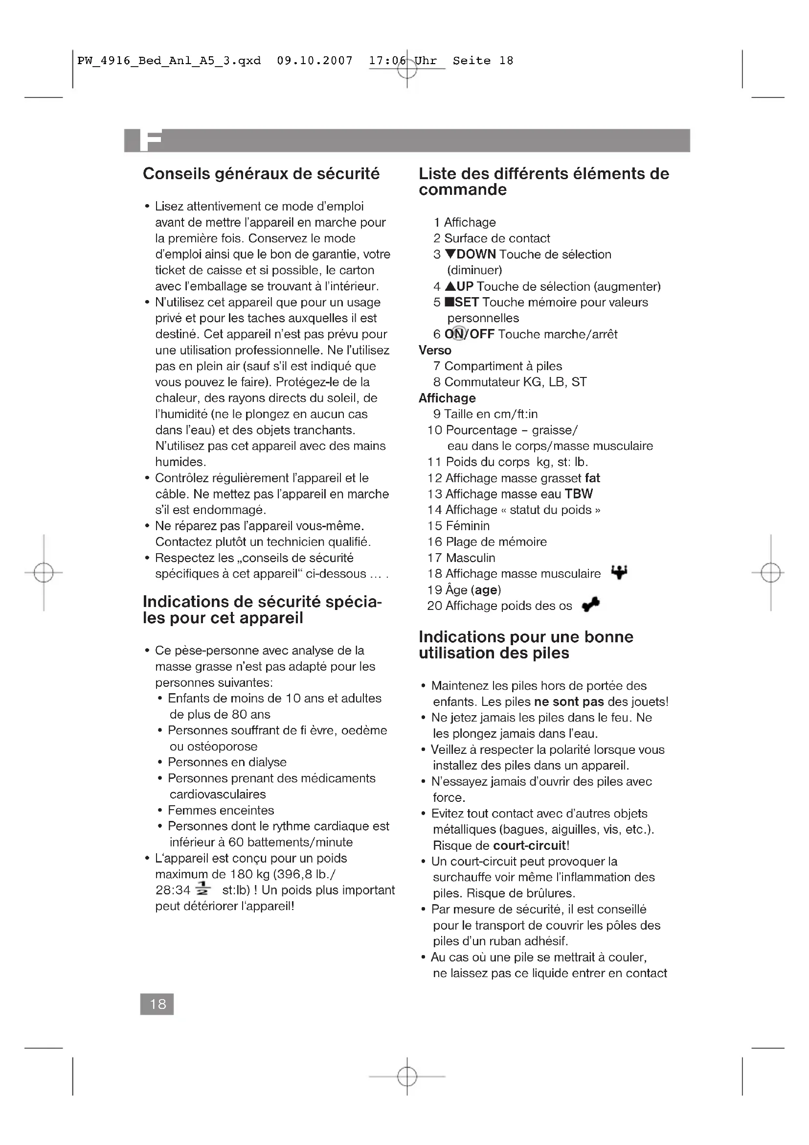 dos de l’appareil. 2.Introduisez 3 piles de type AM4 „AAA“, de 1,5V. Veillez à respecter la polarité (voir indications au fond du compartiment)! 3 Refermez le compartiment des piles. 4.Si l’appareil n’est pas utilisé pendant un certain temps, retirez la pile pour éviter qu’elle ne coule. 5.Différents types de batterie ou batteries neuves et utilisées ne doivent pas être utili- sés ensemble. 6.Lorsque le message « LO » pour manque de pile est affiché à l’écran (1) au cours de l’utilisation, veuillez remplacer les piles. Information pour la mesure de la masse adipeuse Il est déconseillé aux personnes porteuses d’un stimulateur cardiaque ou tout autre dispositif médical équipé de pièces électroniques d’utiliser ce pèse-personne. Le fonctionnement de leur appareil médical risquerait alors d’être perturbé voire bloqué. L‘appareil ne fonctionnne peut fonctionneer correctement que si vous êtes debout pieds nus et les pieds secs sur la surface de contact! Le principe de base de cet appareil consiste à mesurer l’impédance électrique du corps. L’appareil fait pour cela circuler un signal électrique faible et imperceptible à travers votre corps pour livrer ainsi les valeurs actuelles de votre corps. Ce signal est en général totalement anodin! Consulteznéanmoins nos conseils de sécurité spécifi ques à cet appareil! Cette méthode de mesure est connue sous le nom « analyse de l’impédance bio-électrique“ (BIA). Ce facteur estlié à la proportion de masse grasse et d’eau du corps et à d’autres paramètres biologiques (âge, sexe, taille). Il arrive que des personnes ayant un poids important présentent un rapport équilibré entre la masse adipeuse et la masse muscu- laire et il existe apparamment des personnes minces ayant des valeurs de masse adipeuse nettement plus élevées. La graisse est un facteur ayant une action particulièrement néfaste sur l‘organisme, en particulier sur l‘appareil cardio-vasculaire. C‘est la raison pour laquelle le contrôle des deux valeurs (masse adipeuse et poids) est une condition de base pour la santé et la condition physique. Attention! Ne jetez pas les piles avec vos ordures ménagères. Veuillez déposer vos piles usa- gées dans des déchetteries adaptées ou chez un marchand. Avertissement! Ne pas exposer les piles à une chaleur excessive ou à la lumière directe du soleil. Ne jamais jeter les piles au feu. Risque d’explosion! PW_4916_Bed_Anl_A5_3.qxd 09.10.2007 17:06 Uhr Seite 1920