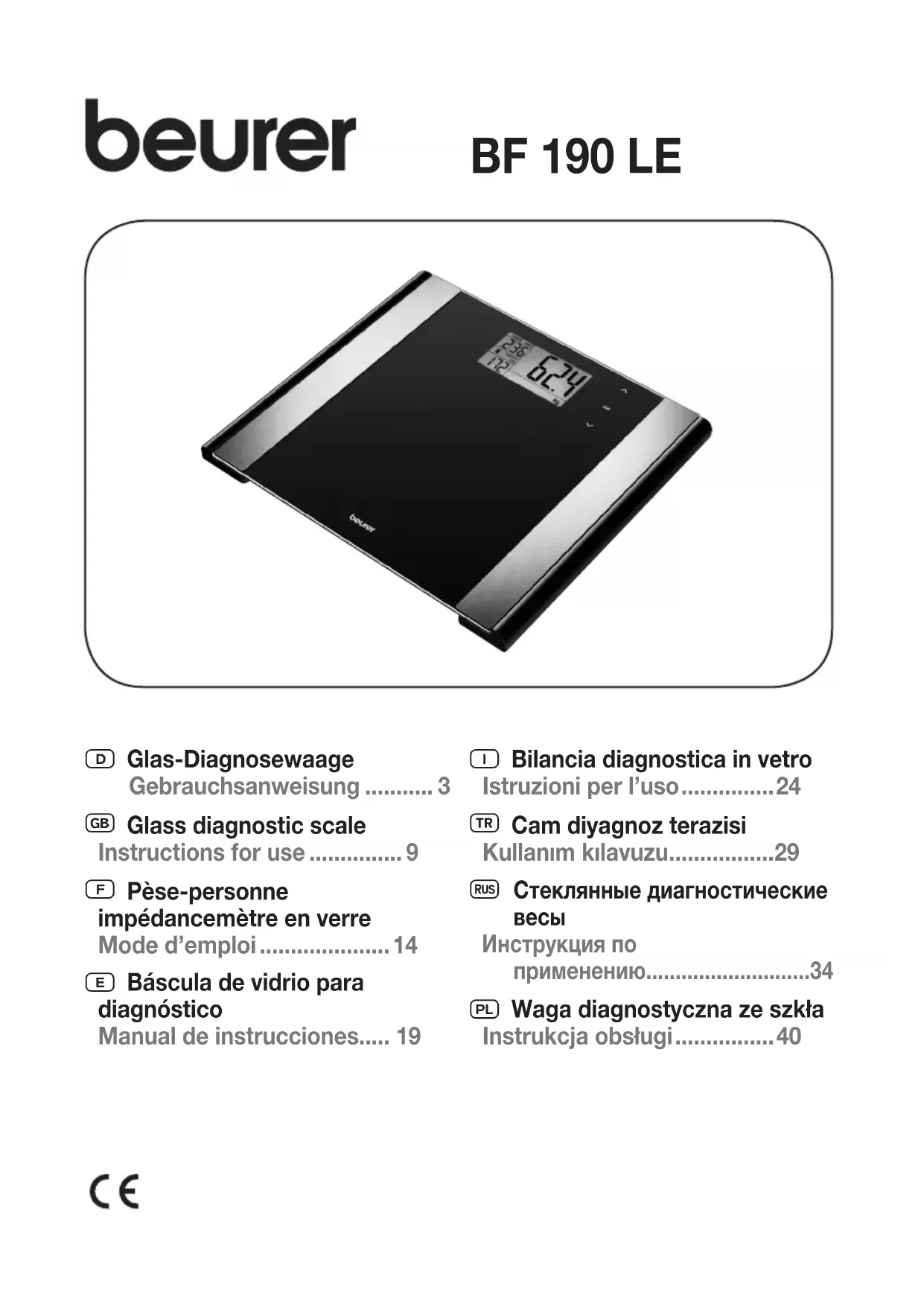 Téléchargez la notice de votre Balance au format PDF gratuitement ! Retrouvez votre notice BF 190 LE - BEURER et reprennez votre appareil électronique en main. Sur cette page sont publiés tous les documents nécessaires à l'utilisation de votre appareil BF 190 LE de la marque BEURER.