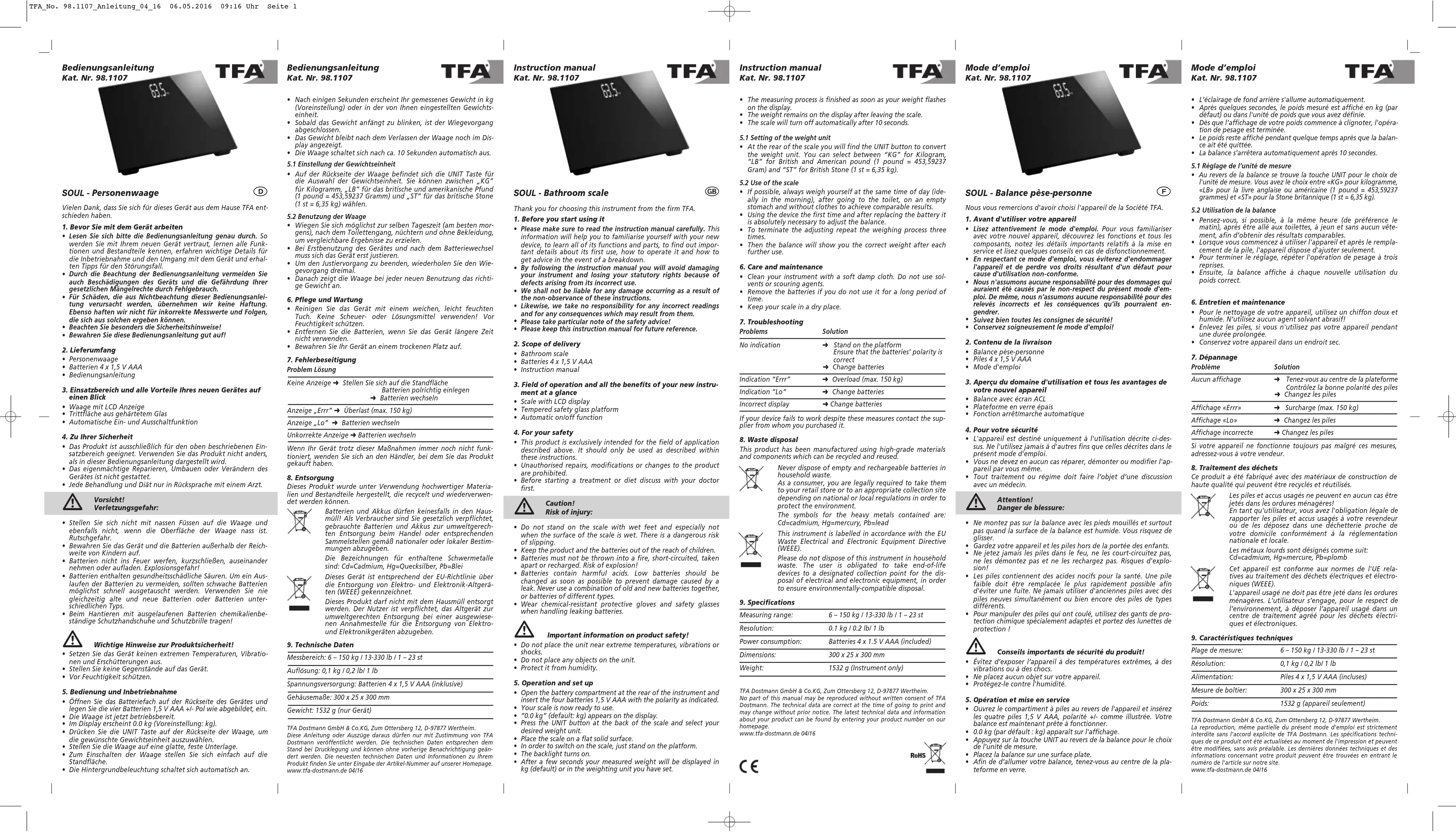 Appuyez sur la touche UNIT au revers de la balance pour le choixde l’unité de mesure. Placez la balance sur une surface plate. Afin de d’allumer votre balance, tenez-vous au centre de la pla-teforme en verre. L’éclairage de fond arrière s'allume automatiquement. Après quelques secondes, le poids mesuré est affiché en kg (pardéfaut) ou dans l'unité de poids que vous avez définie. Dès que l’affichage de votre poids commence à clignoter, l'opéra-tion de pesage est terminée. Le poids reste affiché pendant quelque temps après que la balan-ce ait été quittée. La balance s’arrêtera automatiquement après 10 secondes.5.1 Réglage de l’unité de mesure• Au revers de la balance se trouve la touche UNIT pour le choix del'unité de mesure. Vous avez le choix entre «KG» pour kilogramme,«LB» pour la livre anglaise ou américaine (1 pound = 453,59237grammes) et «ST» pour la Stone britannique (1 st = 6,35 kg).5.2 Utilisation de la balance Pensez-vous, si possible, à la même heure (de préférence lematin), après être allé aux toilettes, à jeun et sans aucun vête-ment, afin d’obtenir des résultats comparables. Lorsque vous commencez à utiliser l'appareil et après le rempla-cement de la pile, l'appareil dispose d'ajuster seulement. Pour terminer le réglage, répéter l'opération de pesage à troisreprises. Ensuite, la balance affiche à chaque nouvelle utilisation dupoids correct.6. Entretien et maintenance Pour le nettoyage de votre appareil, utilisez un chiffon doux ethumide. N’utilisez aucun agent solvant abrasif! Enlevez les piles, si vous n'utilisez pas votre appareil pendantune durée prolongée. Conservez votre appareil dans un endroit sec. 7. DépannageProblème SolutionAucun affichage ➜ Tenez-vous au centre de la plateformeContrôlez la bonne polarité des piles➜ Changez les piles Affichage «Errr» ➜ Surcharge (max. 150 kg) Affichage «Lo» ➜ Changez les piles Affichage incorrecte ➜ Changez les piles Si votre appareil ne fonctionne toujours pas malgré ces mesures,adressez-vous à votre vendeur. 8. Traitement des déchetsCe produit a été fabriqué avec des matériaux de construction dehaute qualité qui peuvent être recyclés et réutilisés. Les piles et accus usagés ne peuvent en aucun cas êtrejetés dans les ordures ménagères!En tant qu'utilisateur, vous avez l'obligation légale derapporter les piles et accus usagés à votre revendeurou de les déposez dans une déchetterie proche devotre domicile conformément à la réglementationnationale et locale.Les métaux lourds sont désignés comme suit: Cd=cadmium, Hg=mercure, Pb=plombCet appareil est conforme aux normes de l'UE rela-tives au traitement des déchets électriques et électro-niques (WEEE). L'appareil usagé ne doit pas être jeté dans les orduresménagères. L’utilisateur s’engage, pour le respect del’environnement, à déposer l’appareil usagé dans uncentre de traitement agréé pour les déchets électri-ques et électroniques. 9. Caractéristiques techniquesPlage de mesure: 6 – 150 kg / 13-330 lb / 1 – 23 st Résolution: 0,1 kg / 0,2 lb/ 1 lbAlimentation: Piles 4 x 1,5 V AAA (incluses)Mesure de boîtier: 300 x 25 x 300 mmPoids: 1532 g (appareil seulement) TFA Dostmann GmbH & Co.KG, Zum Ottersberg 12, D-97877 Wertheim.La reproduction, même partielle du présent mode d'emploi est strictementinterdite sans l'accord explicite de TFA Dostmann. Les spécifications techni-ques de ce produit ont été actualisées au moment de l'impression et peuventêtre modifiées, sans avis préalable. Les dernières données techniques et desinformations concernant votre produit peuvent être trouvées en entrant lenuméro de l'article sur notre site. www.tfa-dostmann.de 04/16 Mode d’emploi Kat. Nr. 98.1107 Instruction manual Kat. Nr. 98.1107 SOUL - Bathroom scale