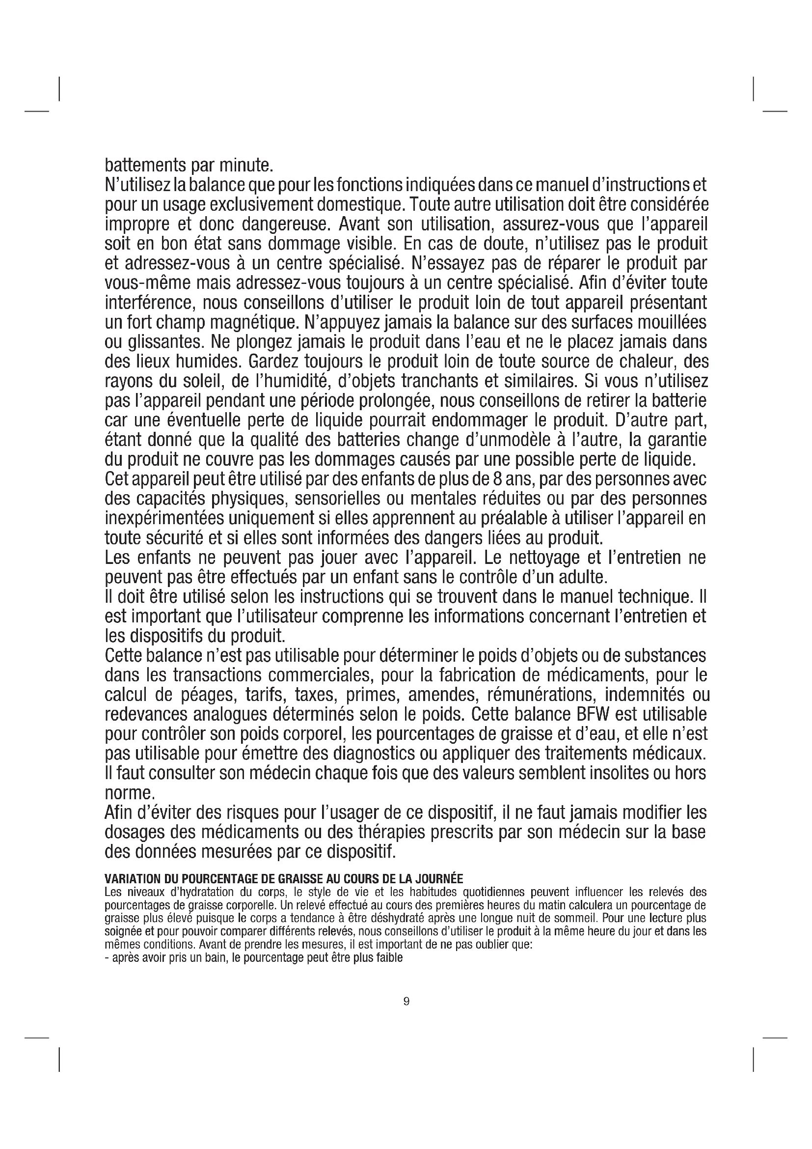 battements par minute. N’utilisez la balance que pour les fonctions indiquées dans ce manuel d’instructions et pour un usage exclusivement domestique. Toute autre utilisation doit être considérée impropre et donc dangereuse. Avant son utilisation, assurez-vous que l’appareil soit en bon état sans dommage visible. En cas de doute, n’utilisez pas le produit et adressez-vous à un centre spécialisé. N’essayez pas de réparer le produit par vous-même mais adressez-vous toujours à un centre spécialisé. An d’éviter toute interférence, nous conseillons d’utiliser le produit loin de tout appareil présentant un fort champ magnétique. N’appuyez jamais la balance sur des surfaces mouillées ou glissantes. Ne plongez jamais le produit dans l’eau et ne le placez jamais dans des lieux humides. Gardez toujours le produit loin de toute source de chaleur, des rayons du soleil, de l’humidité, d’objets tranchants et similaires. Si vous n’utilisez pas l’appareil pendant une période prolongée, nous conseillons de retirer la batterie car une éventuelle perte de liquide pourrait endommager le produit. D’autre part, étant donné que la qualité des batteries change d’unmodèle à l’autre, la garantie du produit ne couvre pas les dommages causés par une possible perte de liquide. Cet appareil peut être utilisé par des enfants de plus de 8 ans, par des personnes avec des capacités physiques, sensorielles ou mentales réduites ou par des personnes inexpérimentées uniquement si elles apprennent au préalable à utiliser l’appareil en toute sécurité et si elles sont informées des dangers liées au produit. Les enfants ne peuvent pas jouer avec l’appareil. Le nettoyage et l’entretien ne peuvent pas être effectués par un enfant sans le contrôle d’un adulte. Il doit être utilisé selon les instructions qui se trouvent dans le manuel technique. Il est important que l’utilisateur comprenne les informations concernant l’entretien et les dispositifs du produit. Cette balance n’est pas utilisable pour déterminer le poids d’objets ou de substances dans les transactions commerciales, pour la fabrication de médicaments, pour le calcul de péages, tarifs, taxes, primes, amendes, rémunérations, indemnités ou redevances analogues déterminés selon le poids. Cette balance BFW est utilisable pour contrôler son poids corporel, les pourcentages de graisse et d’eau, et elle n’est pas utilisable pour émettre des diagnostics ou appliquer des traitements médicaux. Il faut consulter son médecin chaque fois que des valeurs semblent insolites ou hors norme. An d’éviter des risques pour l’usager de ce dispositif, il ne faut jamais modier les dosages des médicaments ou des thérapies prescrits par son médecin sur la base des données mesurées par ce dispositif. VARIATION DU POURCENTAGE DE GRAISSE AU COURS DE LA JOURNÉE Les niveaux d’hydratation du corps, le style de vie et les habitudes quotidiennes peuvent inuencer les relevés des pourcentages de graisse corporelle. Un relevé effectué au cours des premières heures du matin calculera un pourcentage de graisse plus élevé puisque le corps a tendance à être déshydraté après une longue nuit de sommeil. Pour une lecture plus soignée et pour pouvoir comparer différents relevés, nous conseillons d’utiliser le produit à la même heure du jour et dans les mêmes conditions. Avant de prendre les mesures, il est important de ne pas oublier que: - après avoir pris un bain, le pourcentage peut être plus faible10