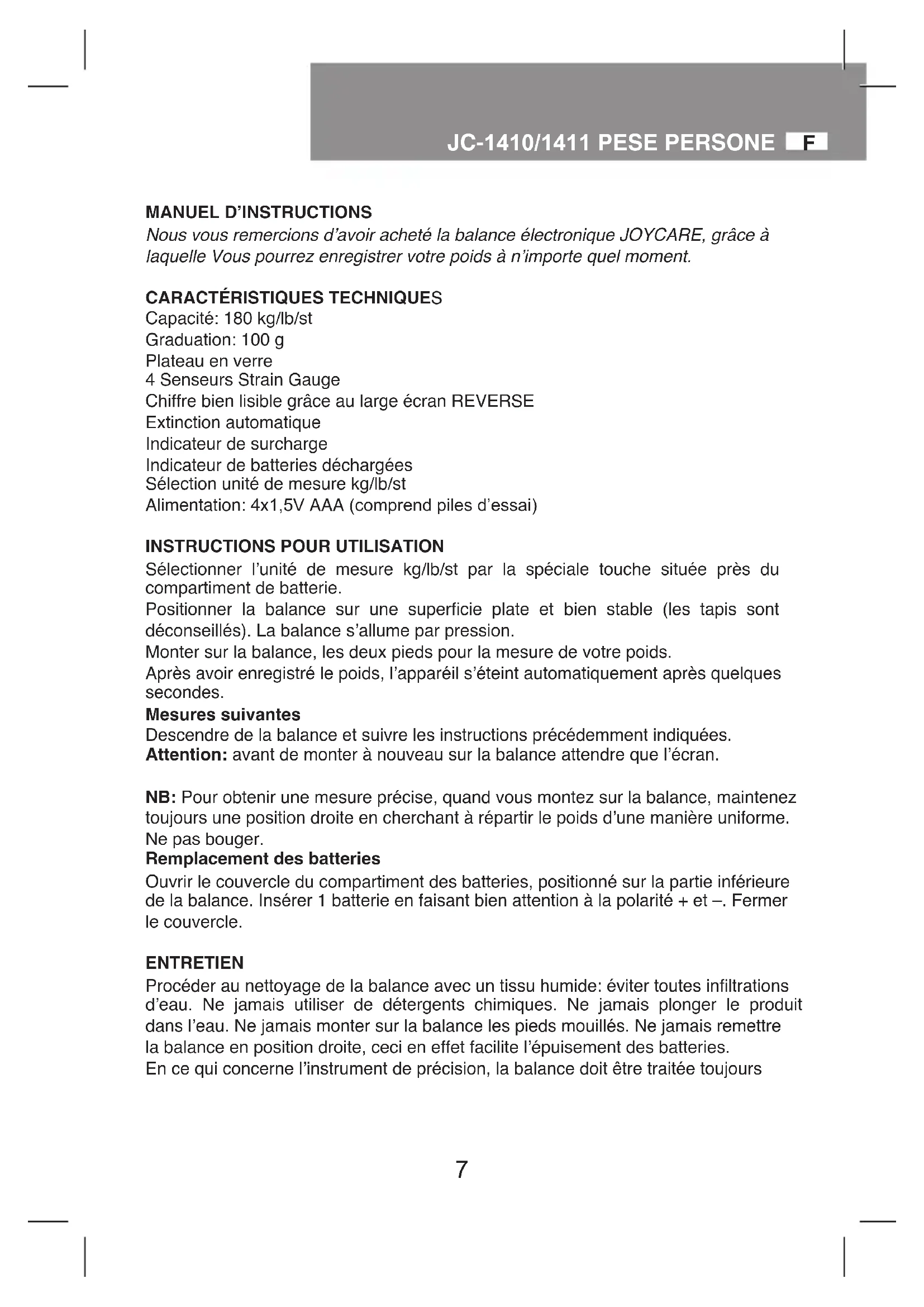 Nous vous remercions d’avoir acheté la balance électronique JOYCARE, grâce à laquelle Vous pourrez enregistrer votre poids à n’importe quel moment.