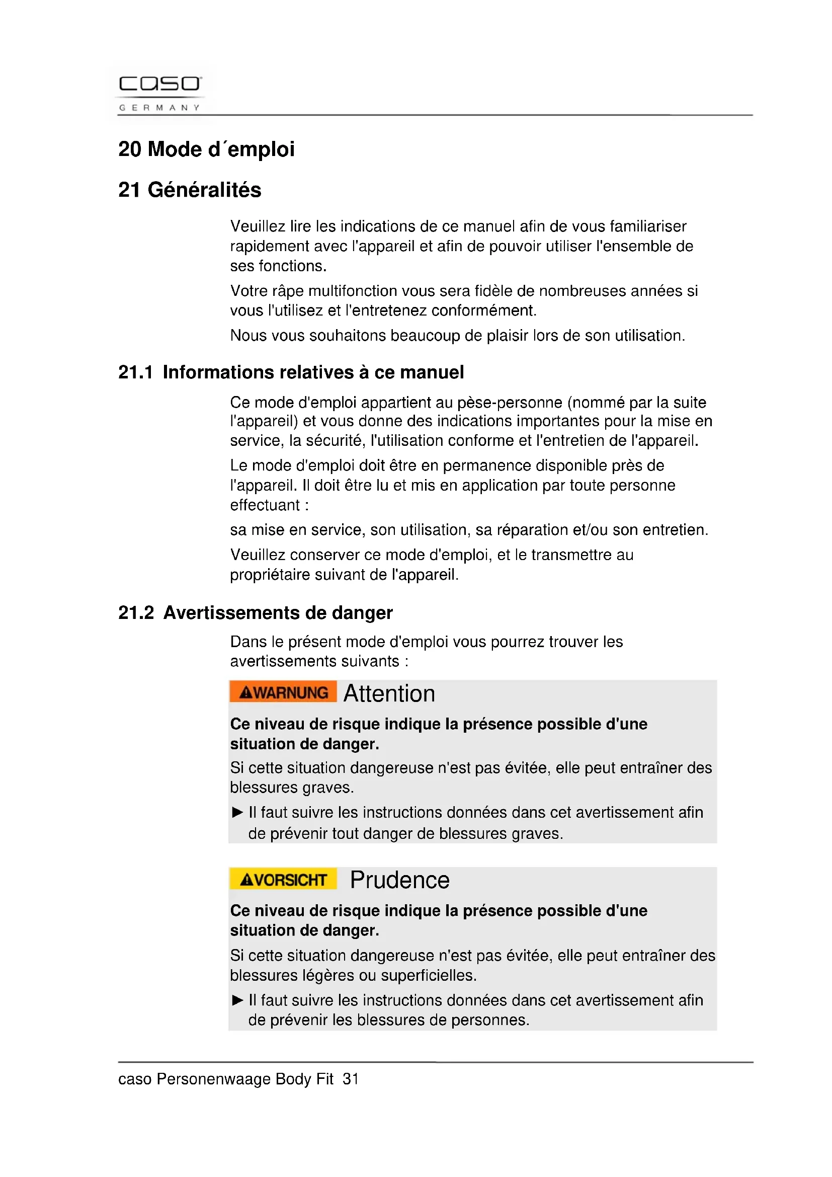 Dans le présent mode d'emploi vous pourrez trouver les avertissements suivants : Attention Ce niveau de risque indique la présence possible d'une situation de danger. Si cette situation dangereuse n'est pas évitée, elle peut entraîner des blessures graves. ► Il faut suivre les instructions données dans cet avertissement afin de prévenir tout danger de blessures graves. Prudence Ce niveau de risque indique la présence possible d'une situation de danger. Si cette situation dangereuse n'est pas évitée, elle peut entraîner des blessures légères ou superficielles. ► Il faut suivre les instructions données dans cet avertissement afin de prévenir les blessures de personnes.caso Personenwaage BF4 32 Remarque Cette indication est accompagnée d'informations complémentaires pour faciliter l'utilisation de l'appareil.