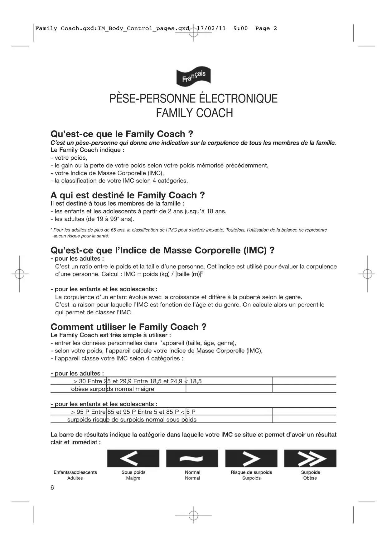 Family Coach.qxd:IM_Body_Control_pages.qxd 17/02/11 9:00 Page 1 5Qu’est-ce que le Family Coach ? C’est un pèse-personne qui donne une indication sur la corpulence de tous les membres de la famille. Le Family Coach indique : - votre poids, - le gain ou la perte de votre poids selon votre poids mémorisé précédemment, - votre Indice de Masse Corporelle (IMC), - la classification de votre IMC selon 4 catégories. A qui est destiné le Family Coach ? Il est destiné à tous les membres de la famille : - les enfants et les adolescents à partir de 2 ans jusqu’à 18 ans, - les adultes (de 19 à 99* ans).