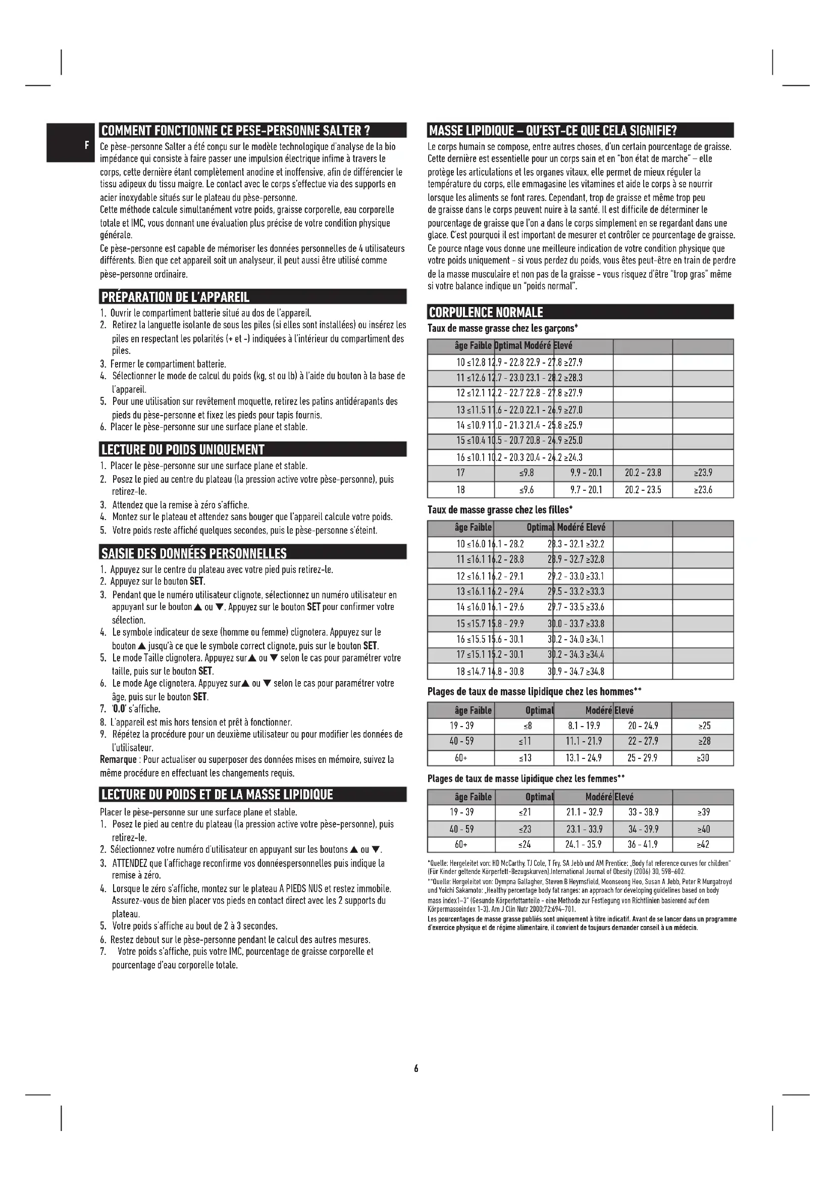 pourcentage d’eau corporelle totale. MASSE LIPIDIQUE – QU’EST-CE QUE CELA SIGNIFIE? Le corps humain se compose, entre autres choses, d’un certain pourcentage de graisse. Cette dernière est essentielle pour un corps sain et en “bon état de marche” – elle protège les articulations et les organes vitaux, elle permet de mieux réguler la température du corps, elle emmagasine les vitamines et aide le corps à se nourrir lorsque les aliments se font rares. Cependant, trop de graisse et même trop peu de graisse dans le corps peuvent nuire à la santé. Il est dicile de déterminer le pourcentage de graisse que l’on a dans le corps simplement en se regardant dans une glace. C’est pourquoi il est important de mesurer et contrôler ce pourcentage de graisse. Ce pource ntage vous donne une meilleure indication de votre condition physique que votre poids uniquement - si vous perdez du poids, vous êtes peut-être en train de perdre de la masse musculaire et non pas de la graisse - vous risquez d’être “trop gras” même si votre balance indique un “poids normal”. CORPULENCE NORMALE Taux de masse grasse chez les garçons* âge Faible Optimal Modéré Elevé 10 ≤12.8 12.9 - 22.8 22.9 - 27.8 ≥27.9 11 ≤12.6 12.7 - 23.0 23.1 - 28.2 ≥28.3 12 ≤12.1 12.2 - 22.7 22.8 - 27.8 ≥27.9 13 ≤11.5 11.6 - 22.0 22.1 - 26.9 ≥27.0 14 ≤10.9 11.0 - 21.3 21.4 - 25.8 ≥25.9 15 ≤10.4 10.5 - 20.7 20.8 - 24.9 ≥25.0 16 ≤10.1 10.2 - 20.3 20.4 - 24.2 ≥24.3 17 ≤9.8 9.9 - 20.1 20.2 - 23.8 ≥23.9 18 ≤9.6 9.7 - 20.1 20.2 - 23.5 ≥23.6 Taux de masse grasse chez les filles* âge Faible Optimal Modéré Elevé 10 ≤16.0 16.1 - 28.2 28.3 - 32.1 ≥32.2 11 ≤16.1 16.2 - 28.8 28.9 - 32.7 ≥32.8 12 ≤16.1 16.2 - 29.1 29.2 - 33.0 ≥33.1 13 ≤16.1 16.2 - 29.4 29.5 - 33.2 ≥33.3 14 ≤16.0 16.1 - 29.6 29.7 - 33.5 ≥33.6 15 ≤15.7 15.8 - 29.9 30.0 - 33.7 ≥33.8 16 ≤15.5 15.6 - 30.1 30.2 - 34.0 ≥34.1 17 ≤15.1 15.2 - 30.1 30.2 - 34.3 ≥34.4 18 ≤14.7 14.8 - 30.8 30.9 - 34.7 ≥34.8 Plages de taux de masse lipidique chez les hommes** âge Faible Optimal Modéré Elevé