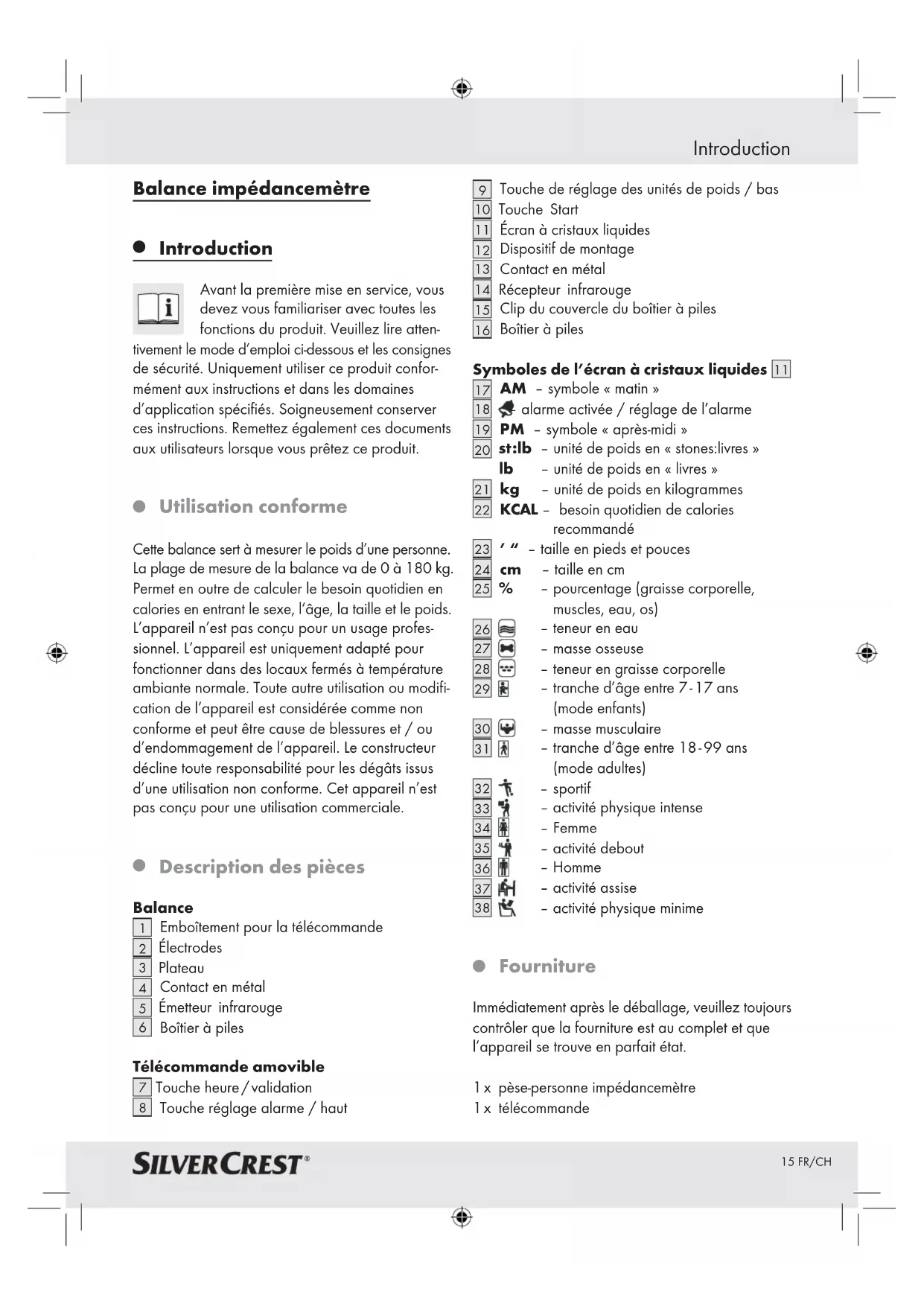 Fourniture Immédiatement après le déballage, veuillez toujours contrôler que la fourniture est au complet et que l’appareil se trouve en parfait état. 1 x pèse-personne impédancemètre 1 x télécommande16 FR/CH Introduction / Sécurité 4 x piles 2 x vis 2 x chevilles 1 x mode d’emploi