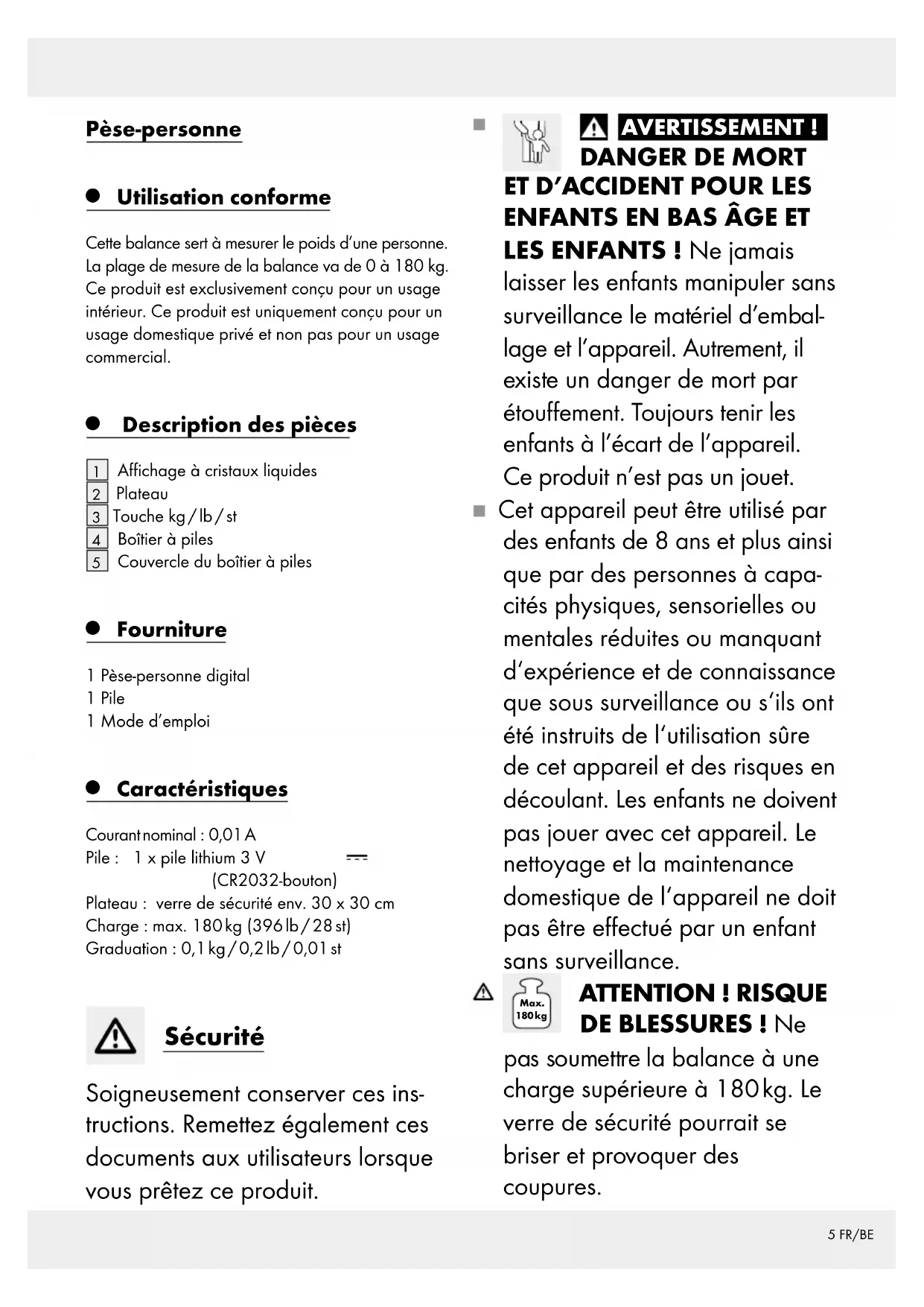 LES ENFANTS ! Ne jamais laisser les enfants manipuler sans surveillance le matériel d’embal- lage et l’appareil. Autrement, il existe un danger de mort par étouffement. Toujours tenir les enfants à l’écart de l’appareil. Ce produit n’est pas un jouet. Cet appareil peut être utilisé par des enfants de 8 ans et plus ainsi que par des personnes à capa- cités physiques, sensorielles ou mentales réduites ou manquant d‘expérience et de connaissance que sous surveillance ou s‘ils ont été instruits de l‘utilisation sûre de cet appareil et des risques en découlant. Les enfants ne doivent pas jouer avec cet appareil. Le nettoyage et la maintenance domestique de l‘appareil ne doit pas être effectué par un enfant sans surveillance. Max. 180 kg ATTENTION ! RISQUE DE BLESSURES ! Ne pas soumettre la balance à une charge supérieure à 180 kg. Le verre de sécurité pourrait se briser et provoquer des coupures.6 FR/BE ATTENTION ! RISQUE DE BLESSURES ! Ne pas monter sur la balance avec des pieds humides, ni utiliser la balance si le plateau est humide. Autrement, vous risquez de glisser. Protéger la balance contre les chocs, l’humidité, les produits chimiques, les fortes variations de température et la proximité directe de sources de chaleur (four, radiateur). Avant la première mise en service et chaque utilisation, vérifier le bon état de l’appareil. Ne jamais faire fonctionner un appareil endommagé. Retirer la pile en cas de panne ou de défaut de l’appareil. Risque élevé de coulage. Uniquement confier les réparations au S.A.V. ou à un électricien qualifié. Dangers lors de la manipulation des piles AVERTISSEMENT ! DANGER DE MORT ! Les piles ne sont pas des jouets. Ne pas laisser traîner les piles. Celles-ci peuvent être avalées par des enfants ou des animaux domestiques. Dans un tel cas, vous devez immédiatement consulter un médecin. RISQUE D’EXPLOSION ! Ne jamais re- charger les piles, les court-circuiter, ni les démonter. Autrement vous risquez de provoquer une sur- chauffe, un incendie ou une explosion. Ne jamais jeter des piles dans un feu ou dans l’eau. Les piles risquent d’exploser. Éviter d’exposer les piles à des conditions et températures ex- trêmes susceptibles de les en- dommager, par ex. des radiateurs. Risque élevé de coulage. Les piles coulées ou endommagées peuvent causer des irritations en cas de contact avec la peau; il faut donc absolument porter des gants adéquats pour les manipuler ! Si du liquide s’écoule d’une pile, il faut éviter tout contact avec la peau, les yeux et les muqueuses. En cas de contact avec l’acide des piles, immédiatement rincer la zone à l’eau claire et consulter un médecin sans plus attendre.