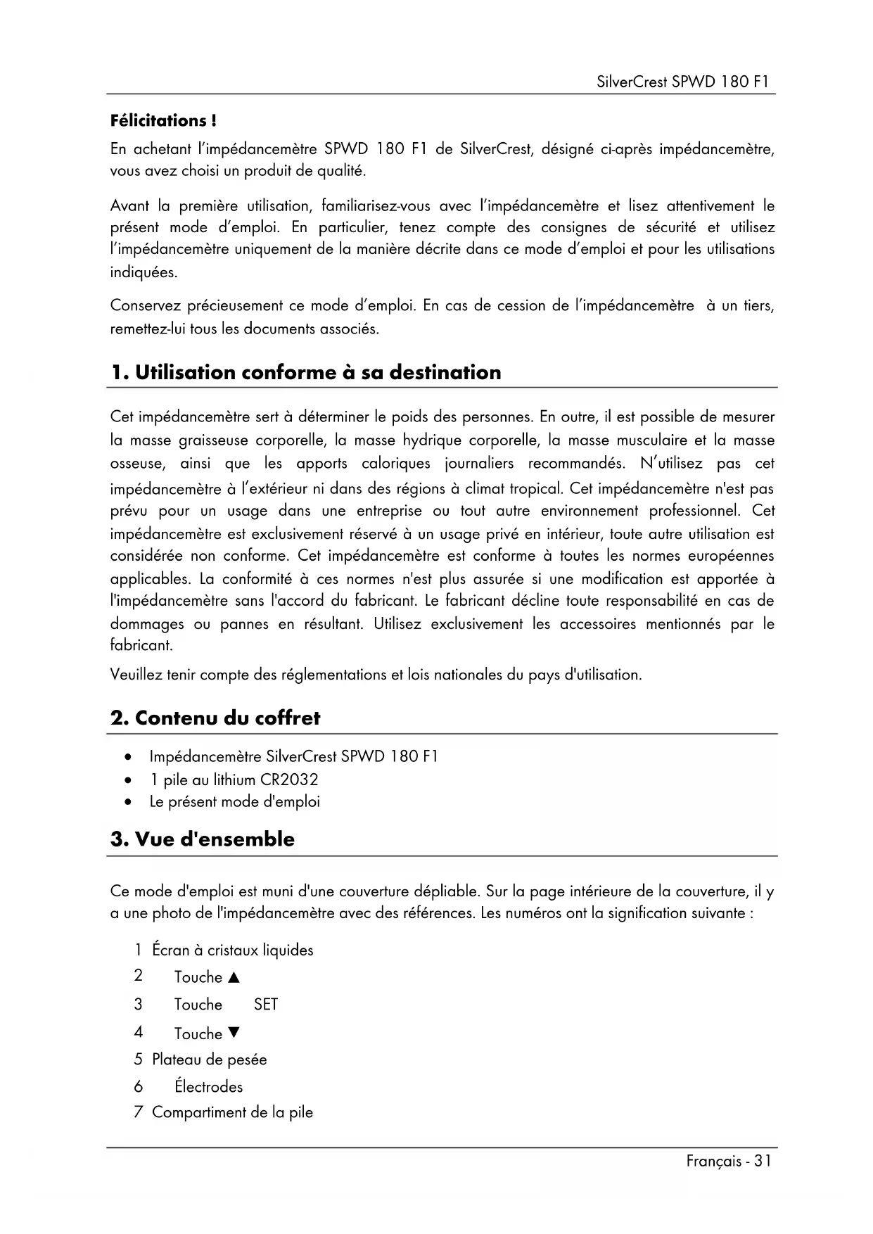 Français - 31 Félicitations ! En achetant l’impédancemètre SPWD 180 F1 de SilverCrest, désigné ci-après impédancemètre, vous avez choisi un produit de qualité. Avant la première utilisation, familiarisez-vous avec l’impédancemètre et lisez attentivement le présent mode d’emploi. En particulier, tenez compte des consignes de sécurité et utilisez l’impédancemètre uniquement de la manière décrite dans ce mode d’emploi et pour les utilisations indiquées. Conservez précieusement ce mode d’emploi. En cas de cession de l’impédancemètre à un tiers, remettez-lui tous les documents associés.