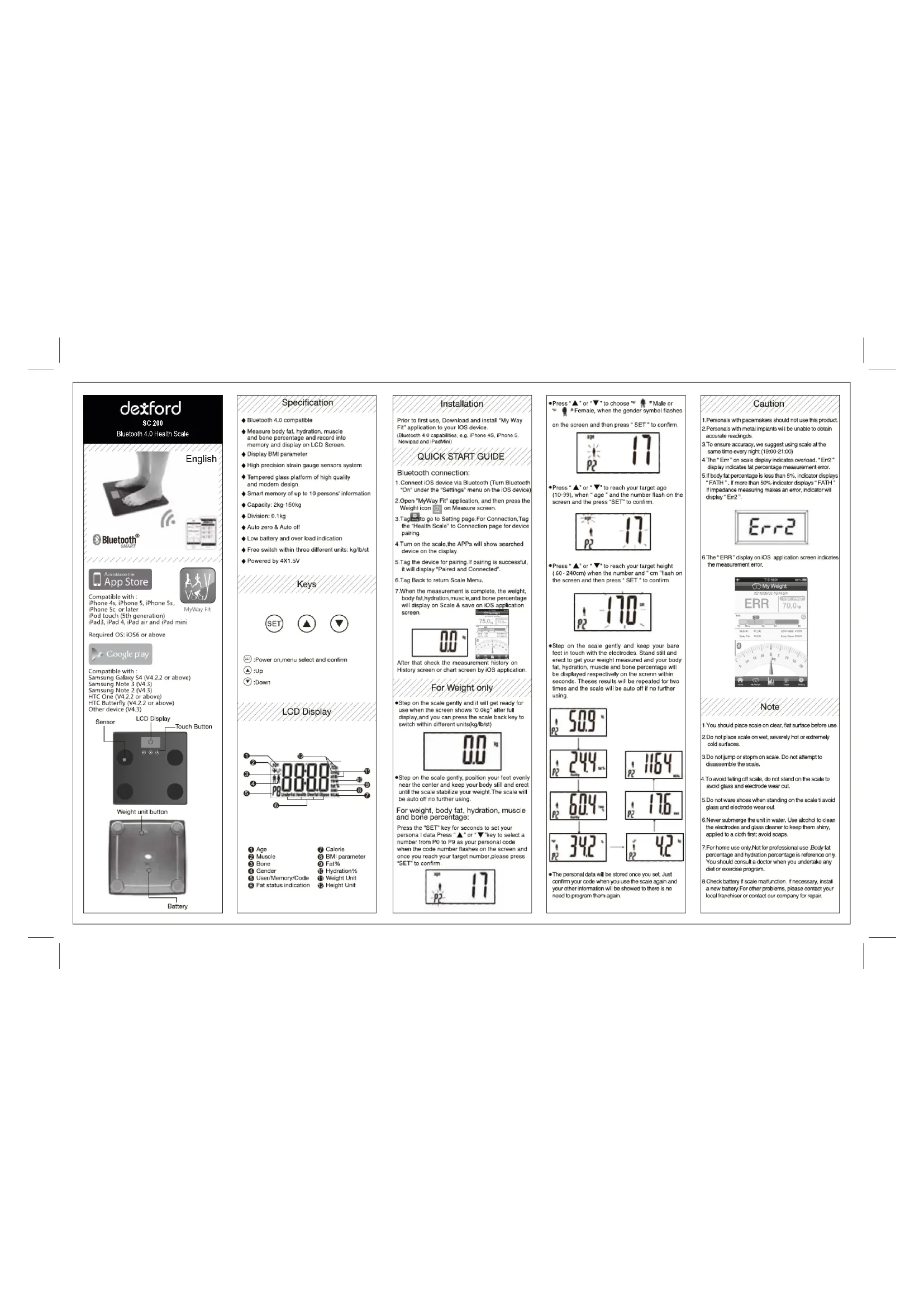 Téléchargez la notice de votre Balance au format PDF gratuitement ! Retrouvez votre notice SC 200 - Dexford et reprennez votre appareil électronique en main. Sur cette page sont publiés tous les documents nécessaires à l'utilisation de votre appareil SC 200 de la marque Dexford.