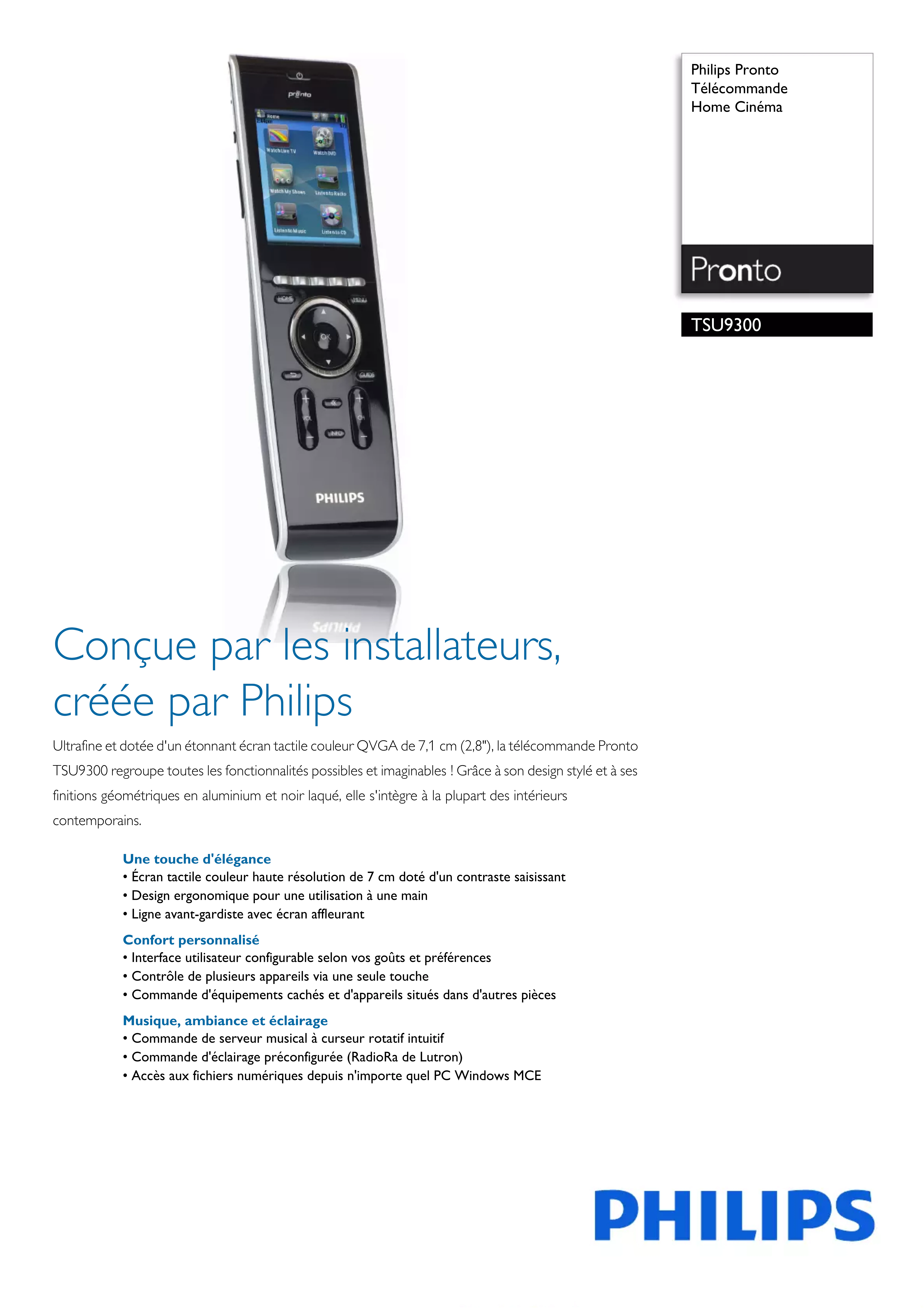 - Accès aux fichiers numériques depuis n'importe quel PC Windows MCEDate de publication 2014-02-19Version: 2.1.1012 NC: 8670 000 47847EAN: 87 12581 45258 2© 2014 Koninklijke Philips N.V.Tous droits réservés.Les caractéristiques sont sujettes à modification sans préavis. Les marques commerciales sont la propriété de Koninklijke Philips N.V. ou de leurs détenteurs respectifs.www.philips.com Caractéristiques TSU9300/00 Télécommande Home Cinéma Points forts IU personnalisable L'interface peut refléter les préférences et goûts personnels de l'utilisateur. Ainsi, seuls les appareils et les touches les plus utilisés apparaissent sur l'écran tactile. L'agencement graphique (fonds, icônes, touches, couleurs) peut aussi être personnalisé. Écran affleurant L'écran n'est plus en retrait mais affleure à la surface du boîtier, offrant une impression de grande fluidité. Commande de serveur musical Elle permet de commander immédiatement un serveur musical, par exemple l'Escient Fireball. L'interface util isateur du serveur musical est intégrée à la télécommande. Il est ainsi possible de choisir sa musique sans être en vue du téléviseur (normalement nécessaire à l'affichage de l'interface). L'écran du téléviseur reste donc libre pour d'autres activités. La molette ergonomique de la télécommande facilite la sélection des pistes et des listes de lecture. Commande d'éclairage La commande d'éclairage préconfigurée propose une interface utilisateur plein écran qui permet de composer les scènes et les ambiances, et de régler les variateurs individuels. Avec le retour d'information à l'écran, l'utilisateur sait si chaque lampe de la maison est allumée ou éteinte. Fonctionnalité PC MCE Via des logiciels de tiers, le panneau de commande Pronto peut intégrer la fonctionnalité Windows PC MCE qui vous permet d'accéder à n'importe quel fichier nu mérique stocké sur votre PC MCE par le