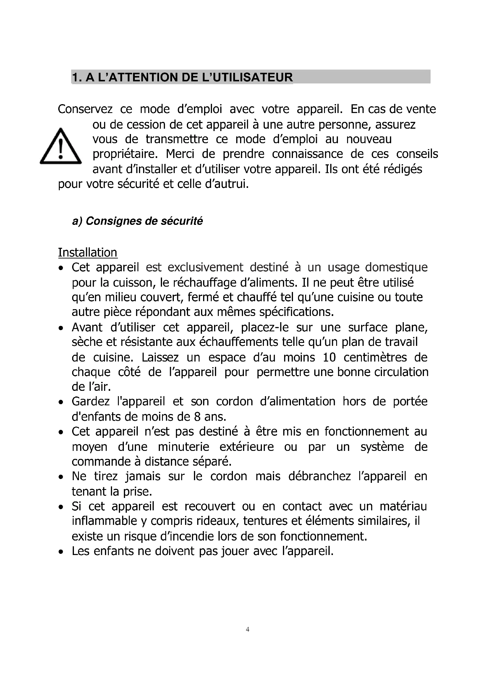 Conservez ce mode d’emploi avec votre appareil. En cas de vente ou de cession de cet appareil à une autre personne, assurez vous de transmettre ce mode d’emploi au nouveau propriétaire. Merci de prendre connaissance de ces conseils avant d’installer et d’utiliser votre appareil. Ils ont été rédigés pour votre sécurité et celle d’autrui. a) Consignes de sécurité Installation