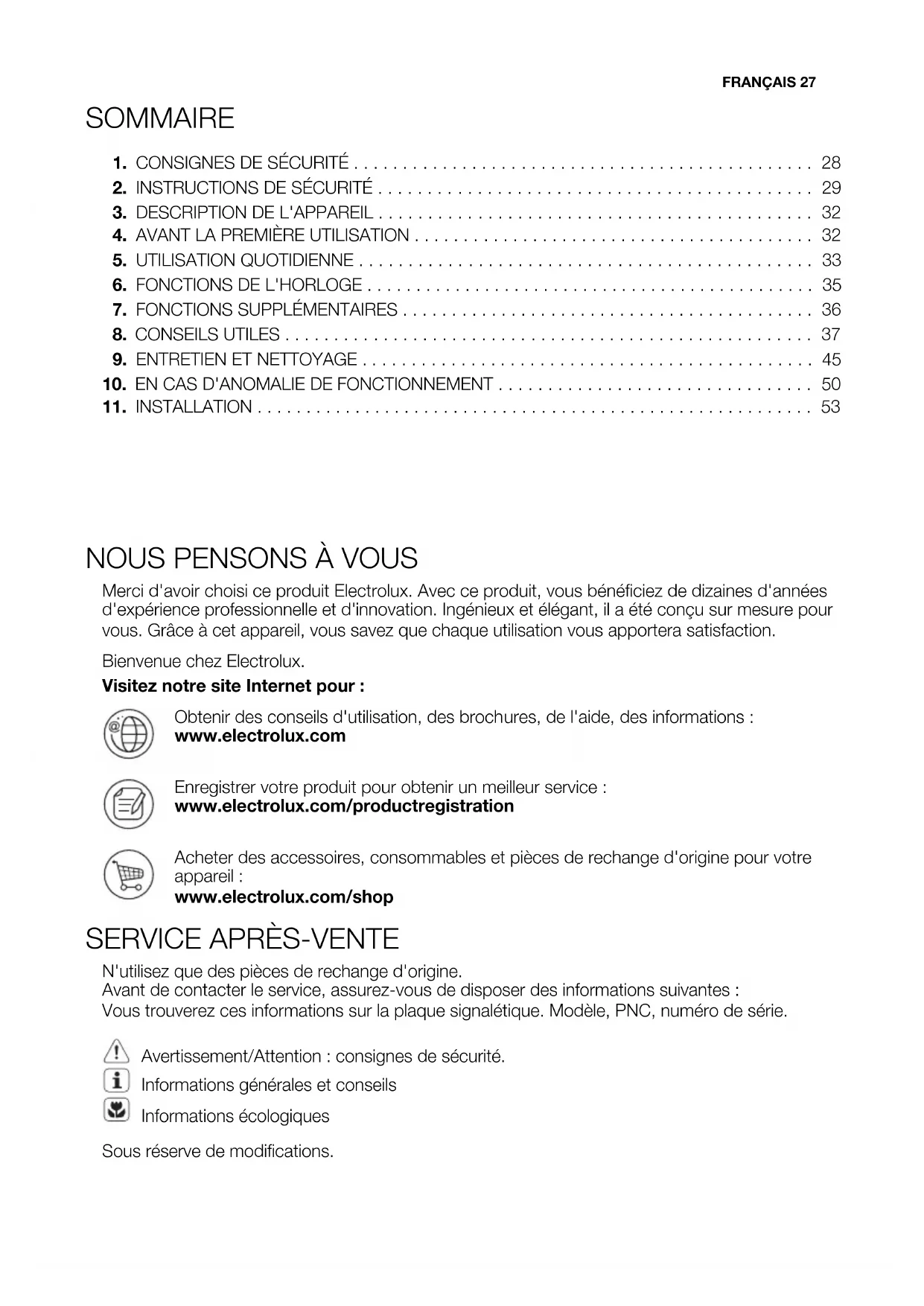 N'utilisez que des pièces de rechange d'origine. Avant de contacter le service, assurez-vous de disposer des informations suivantes : Vous trouverez ces informations sur la plaque signalétique. Modèle, PNC, numéro de série. Avertissement/Attention : consignes de sécurité. Informations générales et conseils Informations écologiques Sous réserve de modifications.