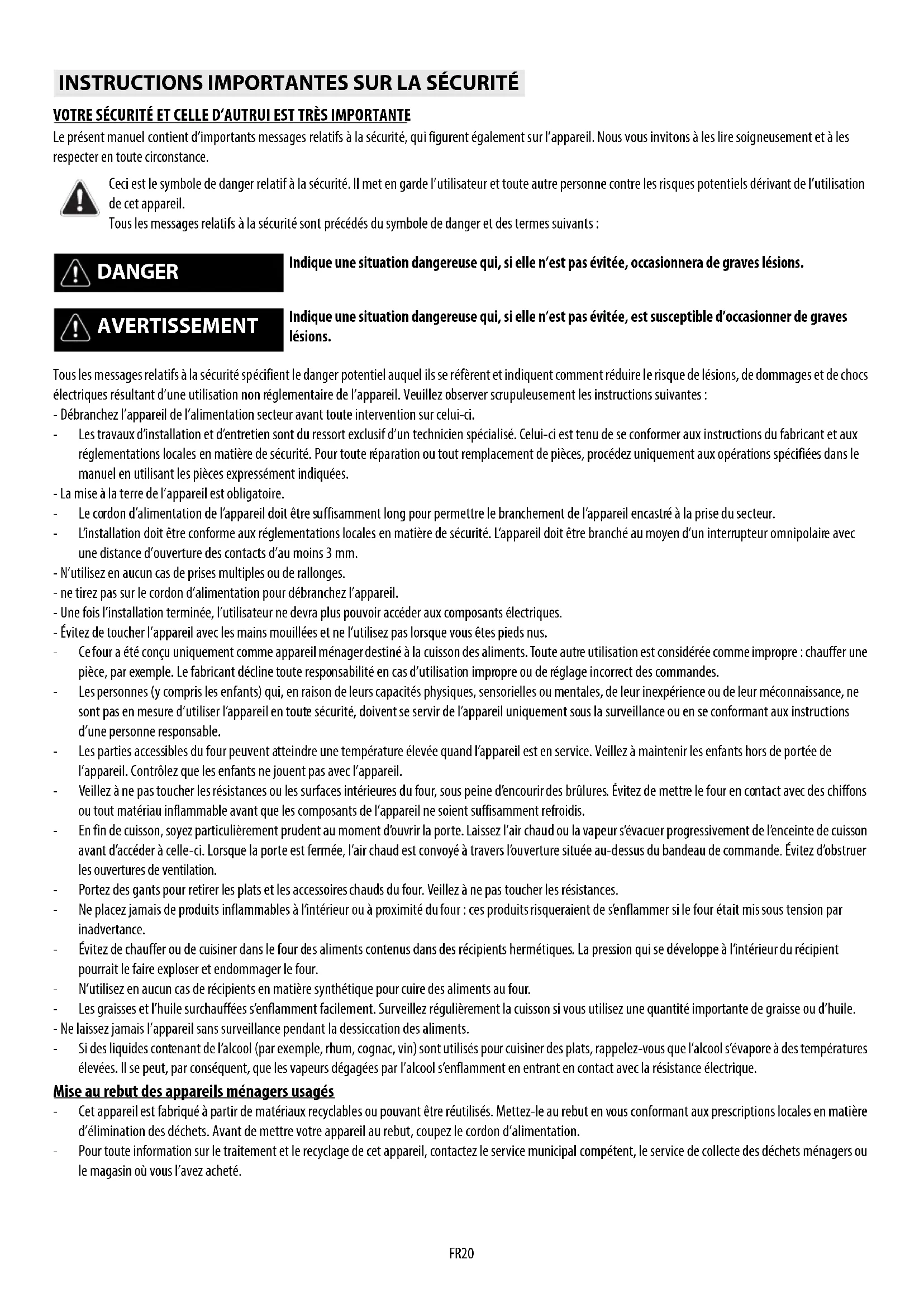 VOTRE SÉCURITÉ ET CELLE D’AUTRUI EST TRÈS IMPORTANTE Le présent manuel contient d’importants messages relatifs à la sécurité, qui figurent également sur l’appareil. Nous vous invitons à les lire soigneusement et à les respecter en toute circonstance. Tous les messages relatifs à la sécurité spécifient le danger potentiel auquel ils se réfèrent et indiquent comment réduire le risque de lésions, de dommages et de chocs électriques résultant d’une utilisation non réglementaire de l’appareil. Veuillez observer scrupuleusement les instructions suivantes : - Débranchez l’appareil de l’alimentation secteur avant toute intervention sur celui-ci. - Les travaux d’installation et d’entretien sont du ressort exclusif d’un technicien spécialisé. Celui-ci est tenu de se conformer aux instructions du fabricant et aux réglementations locales en matière de sécurité. Pour toute réparation ou tout remplacement de pièces, procédez uniquement aux opérations spécifiées dans le manuel en utilisant les pièces expressément indiquées. - La mise à la terre de l’appareil est obligatoire. - Le cordon d’alimentation de l’appareil doit être suffisamment long pour permettre le branchement de l’appareil encastré à la prise du secteur. - L’installation doit être conforme aux réglementations locales en matière de sécurité. L’appareil doit être branché au moyen d’un interrupteur omnipolaire avec une distance d’ouverture des contacts d’au moins 3 mm. - N’utilisez en aucun cas de prises multiples ou de rallonges. - ne tirez pas sur le cordon d’alimentation pour débranchez l’appareil. - Une fois l’installation terminée, l’utilisateur ne devra plus pouvoir accéder aux composants électriques. - Évitez de toucher l’appareil avec les mains mouillées et ne l’utilisez pas lorsque vous êtes pieds nus. - Ce four a été conçu uniquement comme appareil ménager destiné à la cuisson des aliments. Toute autre utilisation est considérée comme impropre : chauffer une pièce, par exemple. Le fabricant décline toute responsabilité en cas d’utilisation impropre ou de réglage incorrect des commandes. - Les personnes (y compris les enfants) qui, en raison de leurs capacités physiques, sensorielles ou mentales, de leur inexpérience ou de leur méconnaissance, ne sont pas en mesure d’utiliser l’appareil en toute sécurité, doivent se servir de l’appareil uniquement sous la surveillance ou en se conformant aux instructions d’une personne responsable. - Les parties accessibles du four peuvent atteindre une température élevée quand l’appareil est en service. Veillez à maintenir les enfants hors de portée de l’appareil. Contrôlez que les enfants ne jouent pas avec l’appareil. - Veillez à ne pas toucher les résistances ou les surfaces intérieures du four, sous peine d’encourir des brûlures. Évitez de mettre le four en contact avec des chiffons ou tout matériau inflammable avant que les composants de l’appareil ne soient suffisamment refroidis. - En fin de cuisson, soyez particulièrement prudent au moment d’ouvrir la porte. Laissez l’air chaud ou la vapeur s’évacuer progressivement de l’enceinte de cuisson avant d’accéder à celle-ci. Lorsque la porte est fermée, l’air chaud est convoyé à travers l’ouverture située au-dessus du bandeau de commande. Évitez d’obstruer les ouvertures de ventilation. - Portez des gants pour retirer les plats et les accessoires chauds du four. Veillez à ne pas toucher les résistances. - Ne placez jamais de produits inflammables à l’intérieur ou à proximité du four : ces produits risqueraient de s’enflammer si le four était mis sous tension par inadvertance. - Évitez de chauffer ou de cuisiner dans le four des aliments contenus dans des récipients hermétiques. La pression qui se développe à l’intérieur du récipient pourrait le faire exploser et endommager le four. - N’utilisez en aucun cas de récipients en matière synthétique pour cuire des aliments au four. - Les graisses et l’huile surchauffées s’enflamment facilement. Surveillez régulièrement la cuisson si vous utilisez une quantité importante de graisse ou d’huile. - Ne laissez jamais l’appareil sans surveillance pendant la dessiccation des aliments. - Si des liquides contenant de l’alcool (par exemple, rhum, cognac, vin) sont utilisés pour cuisiner des plats, rappelez-vous que l’alcool s’évapore à des températures élevées. Il se peut, par conséquent, que les vapeurs dégagées par l’alcool s’enflamment en entrant en contact avec la résistance électrique. Mise au rebut des appareils ménagers usagés - Cet appareil est fabriqué à partir de matériaux recyclables ou pouvant être réutilisés. Mettez-le au rebut en vous conformant aux prescriptions locales en matière d’élimination des déchets. Avant de mettre votre appareil au rebut, coupez le cordon d’alimentation. - Pour toute information sur le traitement et le recyclage de cet appareil, contactez le service municipal compétent, le service de collecte des déchets ménagers ou le magasin où vous l’avez acheté.