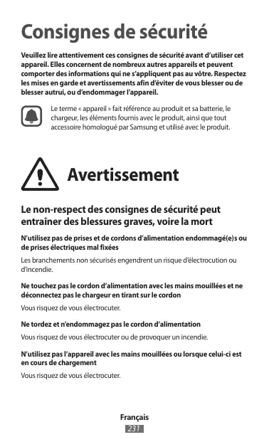 Consignes de sécurité Veuillez lire attentivement ces consignes de sécurité avant d’utiliser cet appareil. Elles concernent de nombreux autres appareils et peuvent comporter des informations qui ne s’appliquent pas au vôtre. Respectez les mises en garde et avertissements afin d’éviter de vous blesser ou de blesser autrui, ou d’endommager l’appareil. Le terme « appareil » fait référence au produit et sa batterie, le chargeur, les éléments fournis avec le produit, ainsi que tout accessoire homologué par Samsung et utilisé avec le produit. Avertissement Le non-respect des consignes de sécurité peut entraîner des blessures graves, voire la mort N’utilisez pas de prises et de cordons d’alimentation endommagé(e)s ou de prises électriques mal fixées Les branchements non sécurisés engendrent un risque d’électrocution ou d’incendie. Ne touchez pas le cordon d’alimentation avec les mains mouillées et ne déconnectez pas le chargeur en tirant sur le cordon Vous risquez de vous électrocuter. Ne tordez et n’endommagez pas le cordon d’alimentation Vous risquez de vous électrocuter ou de provoquer un incendie. N’utilisez pas l’appareil avec les mains mouillées ou lorsque celui-ci est en cours de chargement Vous risquez de vous électrocuter. Français