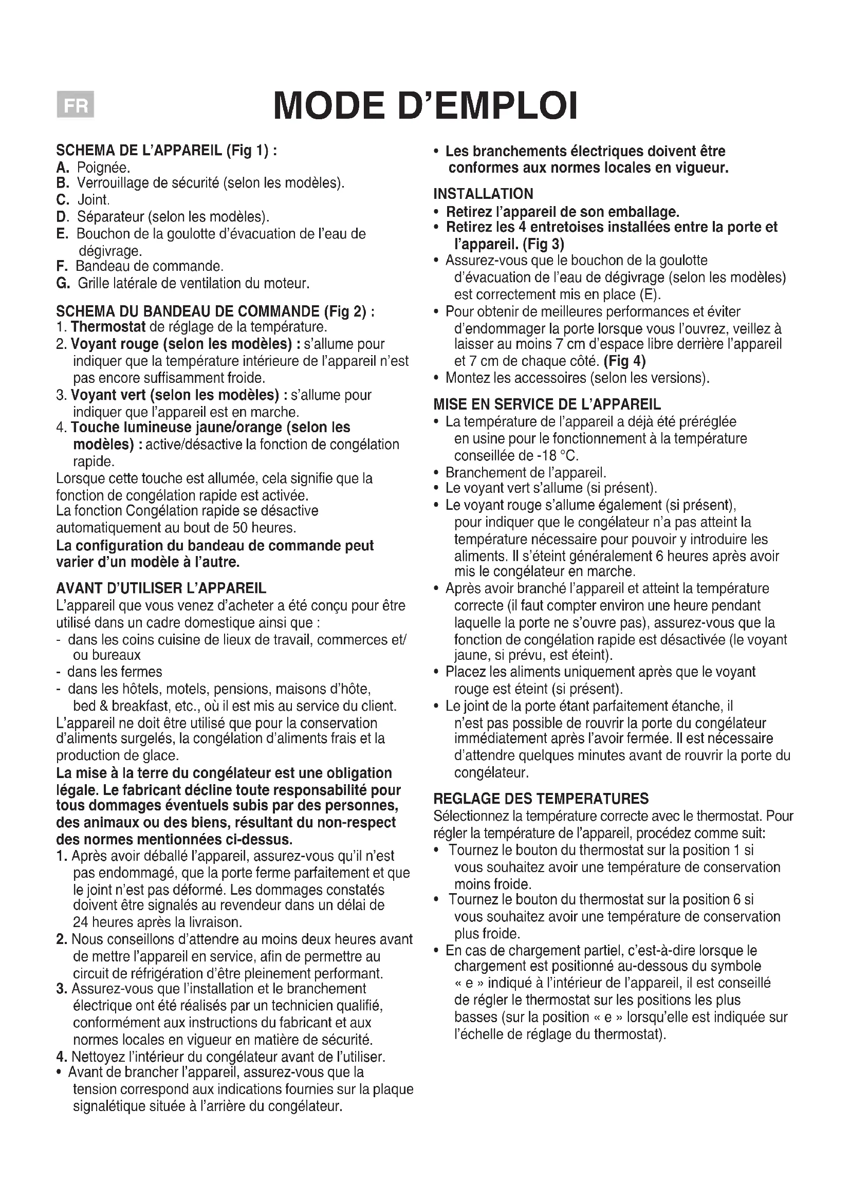 SCHEMA DE L’APPAREIL (Fig 1) : A. Poignée. B. Verrouillage de sécurité (selon les modèles). C. Joint. D. Séparateur (selon les modèles). E. Bouchon de la goulotte d’évacuation de l’eau de dégivrage. F. Bandeau de commande. G. Grille latérale de ventilation du moteur. SCHEMA DU BANDEAU DE COMMANDE (Fig 2) :