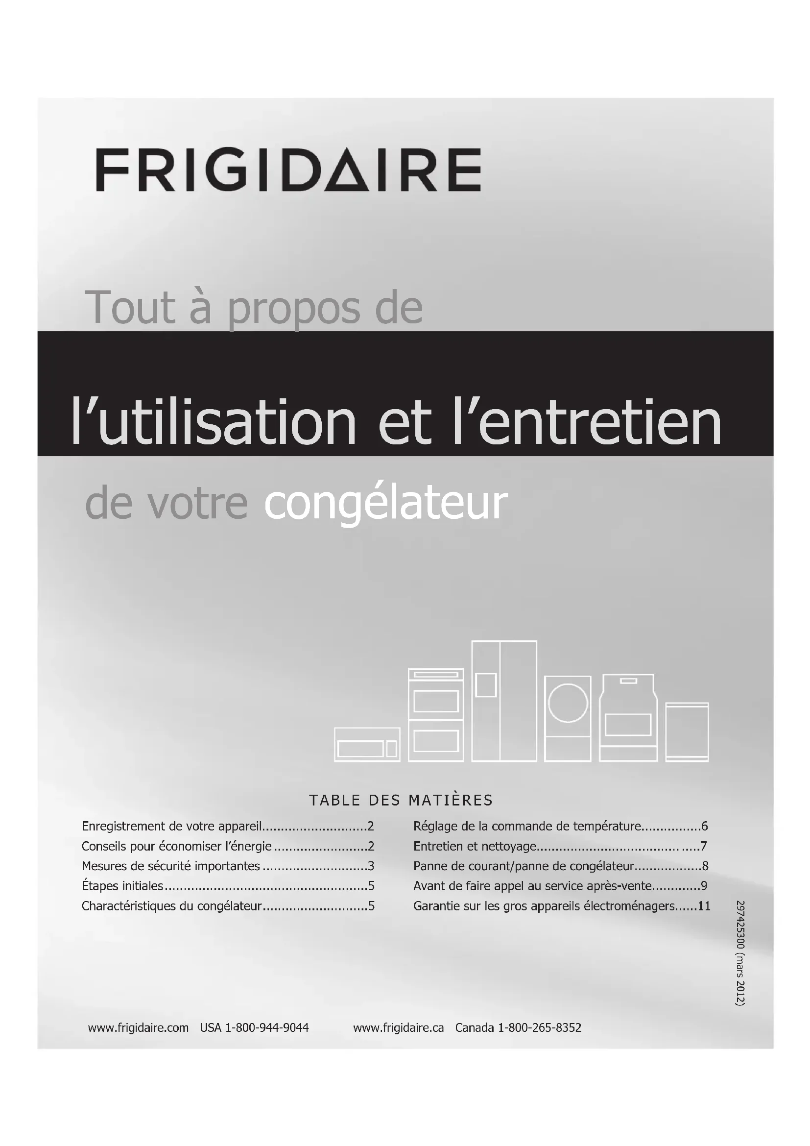 REMARQUE Si le congélateur est hors tension pendant plusieurs heures, ouvrez-le le moins possible. En cas de panne de courant, les aliments resteront congelés au moins 24 heures si le congélateur reste fermé. Si la panne continue, placez sept ou huit livres de glace sèche dans le congélateur toutes les 24 heures. Cherchez dans les pages jaunes les fournisseurs sous «Glace sèche», «Laiteries» ou «Fabricants de crème glacée». Portez toujours des gants et soyez prudent lors de la manipulation de glace sèche. Si le congélateur s’est arrêté de fonctionner, reportez-vous à Le congélateur ne fonctionne pas dans la liste de contrôle anti-panne. Si vous ne pouvez résoudre le problème, appelez immédiatement un réparateur autorisé. N’ouvrez pas le congélateur inutilement. S’il ne fonctionne pas pendant plusieurs heures, suivez les instructions ci-dessus traitant de l’utilisation de glace sèche. Au besoin, apportez vos aliments dans un dépôt frigorique local jusqu’à ce que le congélateur soit prêt à fonctionner. Regardez dans les pages jaunes sous «Entrepôts frigoriques pour aliments congelés»."9 Problème Cause Solution FONCTIONNEMENT DU CONGÉLATEURLe congélateur ne fonctionne pas.• Le circuit dans lequel le congélateur est bran-ché dispose d’un disjoncteur de fuite de terre.• La commande de température est en position OFF.• Le congélateur n’est pas branché ou la che n’est pas bien insérée dans la prise murale.• Un fusible est grillé ou un disjoncteur est hors tension.• Panne d’électricité.• Branchez l’appareil dans un autre circuit. Si vous n’êtes pas sûr du type de prise, faites-la vérier par un technicien qualié.• Consultez la section « Ajuster la commande de température ».• Assurez-vous que la che soit bien enfoncée dans la prise.• Vériez/remplacez le fusible par un fusible à action retardée de 15 A. Réinitialisez le disjoncteur.• Vériez les lumières de la maison. Appelez votre fournisseur d’électricité local.Le congélateur fonc-tionne trop souvent ou trop longtemps.• La température dans la pièce ou à l’extérieur est chaude.• Le congélateur a récemment été débranché pendant un certain temps.• Des quantités importantes de nourriture tiède ou chaude ont récemment été entreposées.• Le couvercle est ouvert trop souvent ou trop longtemps.• Il est possible que le couvercle soit entrouvert.• Le réglage de la température est trop bas.• Le joint d’étanchéité du congélateur est sale, usé, craquelé ou mal ajusté.• Il est normal que le congélateur fonctionne plus longtemps dans de telles conditions.• Le congélateur a besoin d’environ 4 heures pour se refroidir complètement.• Si des aliments tièdes y sont rangés, le congélateur doit fonctionner davantage pour atteindre le niveau de température demandé.• Le congélateur fonctionne davantage si de l’air chaud y pénètre. Ouvrez le couvercle moins souvent.• Assurez-vous que le couvercle soit bien fermé.• Tournez la commande pour choisir un réglage plus chaud. Attendez quelques heures pour permettre à la température de se stabiliser.• Nettoyez ou remplacez le joint. Si le joint d’étanchéité du couvercle fuit, le congélateur doit fonctionner plus longtemps pour maintenir la température désirée.TEMPÉRATURES DU CONGÉLATEURLa température du congélateur est trop froide.• La commande de température du congélateur est réglée à un niveau trop bas.• Ajustez la commande du congélateur à un réglage plus chaud. Attendez quelques heures pour per-mettre à la température de se stabiliser.La température à l’intérieur du congélateur est trop chaude.• La commande de température du congélateur est réglée à un niveau trop élevé.• Le couvercle est ouvert trop souvent ou trop longtemps.• Le couvercle se ferme peut-être mal.• Des quantités importantes de nourriture tiède ou chaude ont récemment été entreposées.• Le congélateur a récemment été débranché pendant un certain temps• Ajustez la commande à un réglage plus froid. Attendez quelques heures pour permettre à la température de se stabiliser.• Le congélateur fonctionne davantage si de l’air chaud y pénètre. Ouvrez le couvercle moins souvent.• Consultez la section « PROBLÈMES DE COUVERCLE ».• Si des aliments tièdes y sont rangés, le congéla-teur doit fonctionner davantage pour atteindre le niveau de température demandé.• Il faut 4 heures pour que le congélateur se refroid-isse complètement.La température de la surface externe est élevée.• La température des parois extérieures du con-gélateur peut être jusqu’à 15 °C (30 °F) plus élevée que la température ambiante.• Le compresseur du congélateur fonctionne normalement et retire l’air chaud de l’intérieur de la caisse. AVANT DE FAIRE APPEL AU SERVICE APRÈS-VENTE Visitez notre site Web au www.frigidaire.com. 1-800-944-9044 (États-Unis) 1-800-265-8352 (Canada)10 AVANT DE FAIRE APPEL AU SERVICE APRÈS-VENTE Problème Cause Solution BRUITS Bruits plus élevés lorsque le congéla- teur est en marche.
