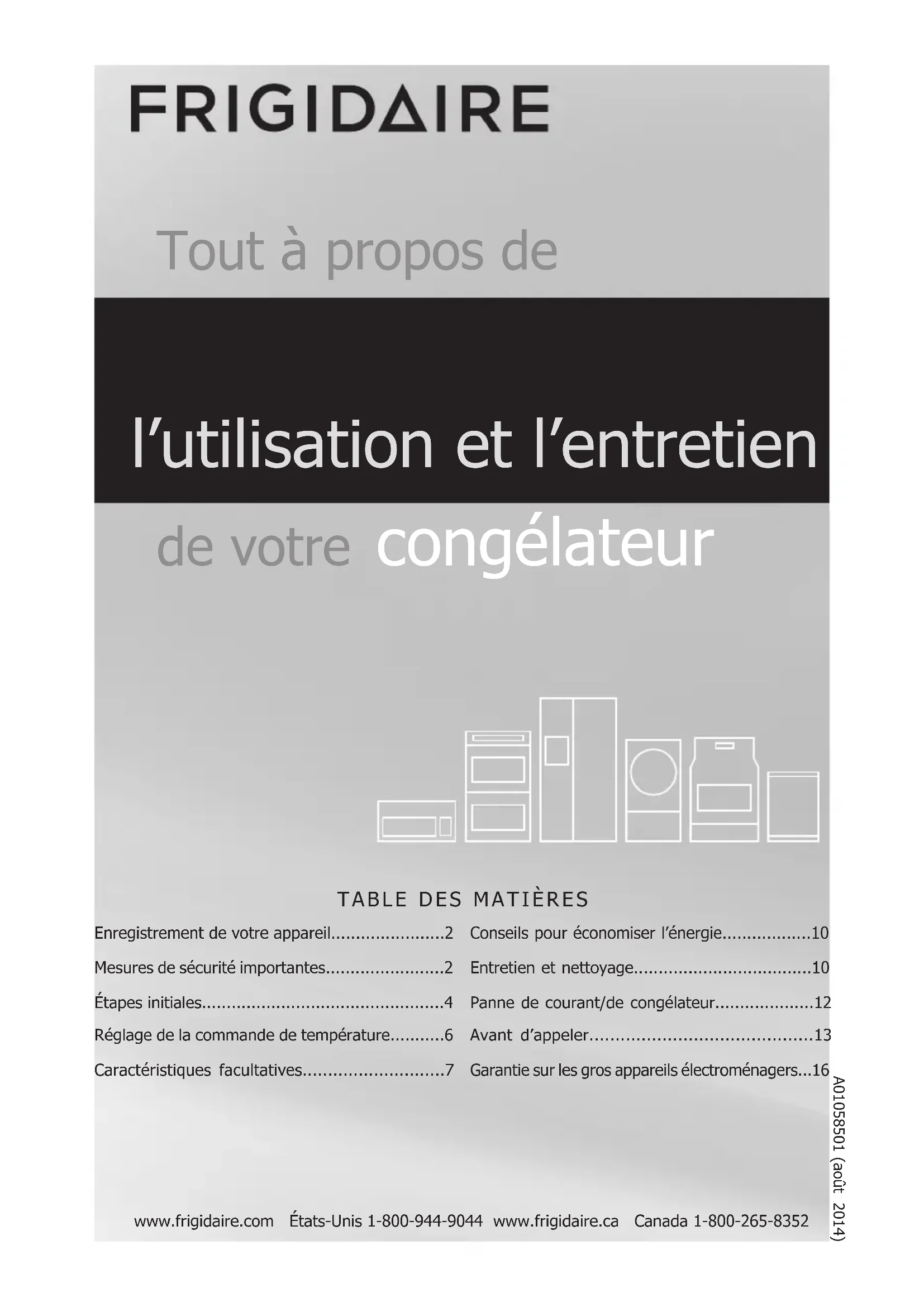 - www.frigidaire.com États-Unis 1-800-944-9044 www.frigidaire.ca Canada 1-800-265-8352 Tout à propos de l’utilisation et l’entretien de votre congélateur Enregistrement de votre appareil p. 2