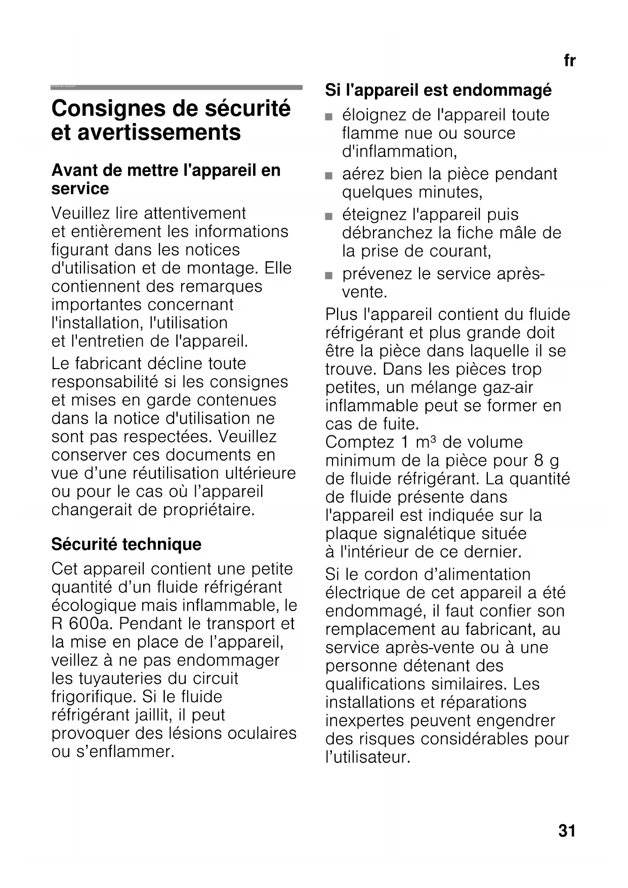 Cet apparéil contient une petite quantité d'un fluide réfrigérant ecologique mais inflammable, le R 600a. Pendant le transport et la mise en place de l' apparéil, voirlez à ne pas endommager les tuyauteries du circuit frigorifique. Si le fluide réfrigérant jaillit, il peut provoquer des lésions oculaires ou s'enflammer.