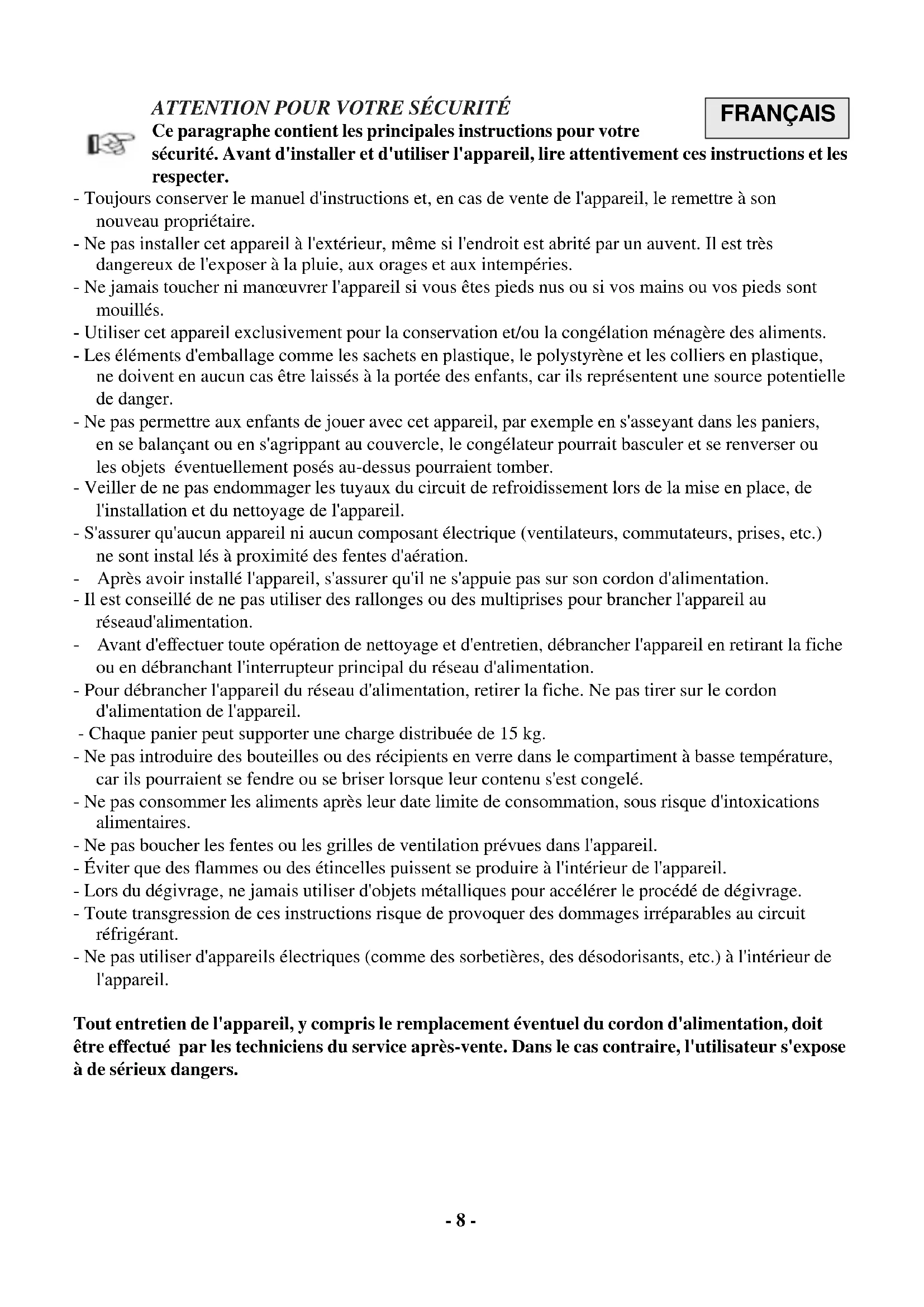 - Utiliser cet apparéil exclusivement pour la conservation et/ou la congélation menagère des alimentés.