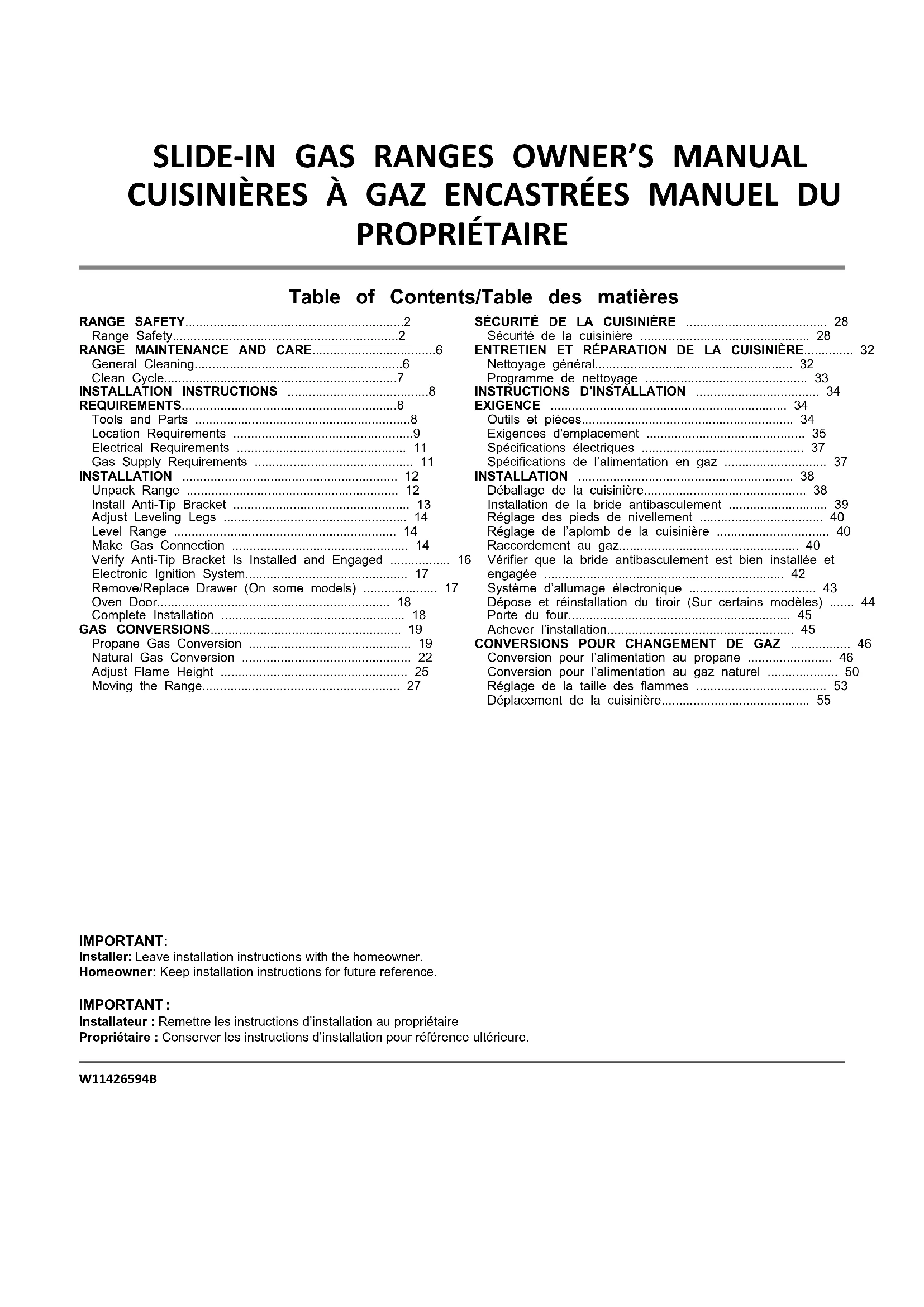 “Instructions d’installation” de ces instructions pour achever cette procédure. IMPORTANT: S'assurer de bien conserver les injecteurs à orifice qui ont été remplacés au cours de la conversion.50 Conversion pour l’alimentation au gaz naturel AVERTISSEMENT Risque de basculement Une personne, enfant ou adulte, peut faire basculer la cuisinière et subir des blessures mortelles. Fixer la bride antibasculement au plancher ou au mur, conformément aux instructions d’installation. Faire glisser de nouveau la cuisinière de façon à ce que le pied arrière de la cuisinière se trouve dans la fente de la bride antibasculement. Réengager la bride antibasculement si la cuisinière a été déplacée. Ne pas faire fonctionner la cuisinière si la bride antibasculement n’est pas installée et engagée. Le non-respect de ces instructions peut causer un décès ou des brûlures graves aux enfants et aux adultes.